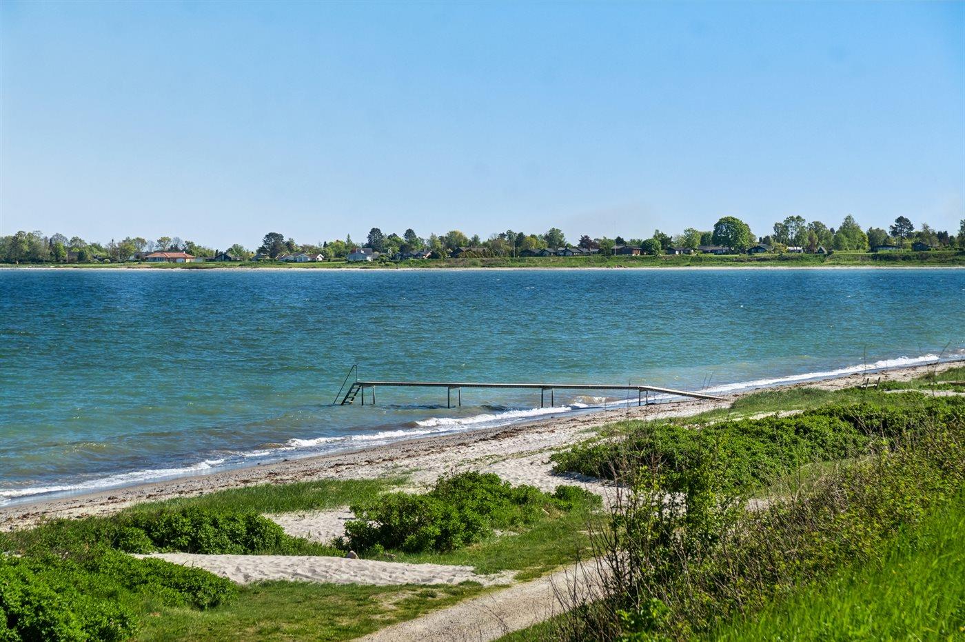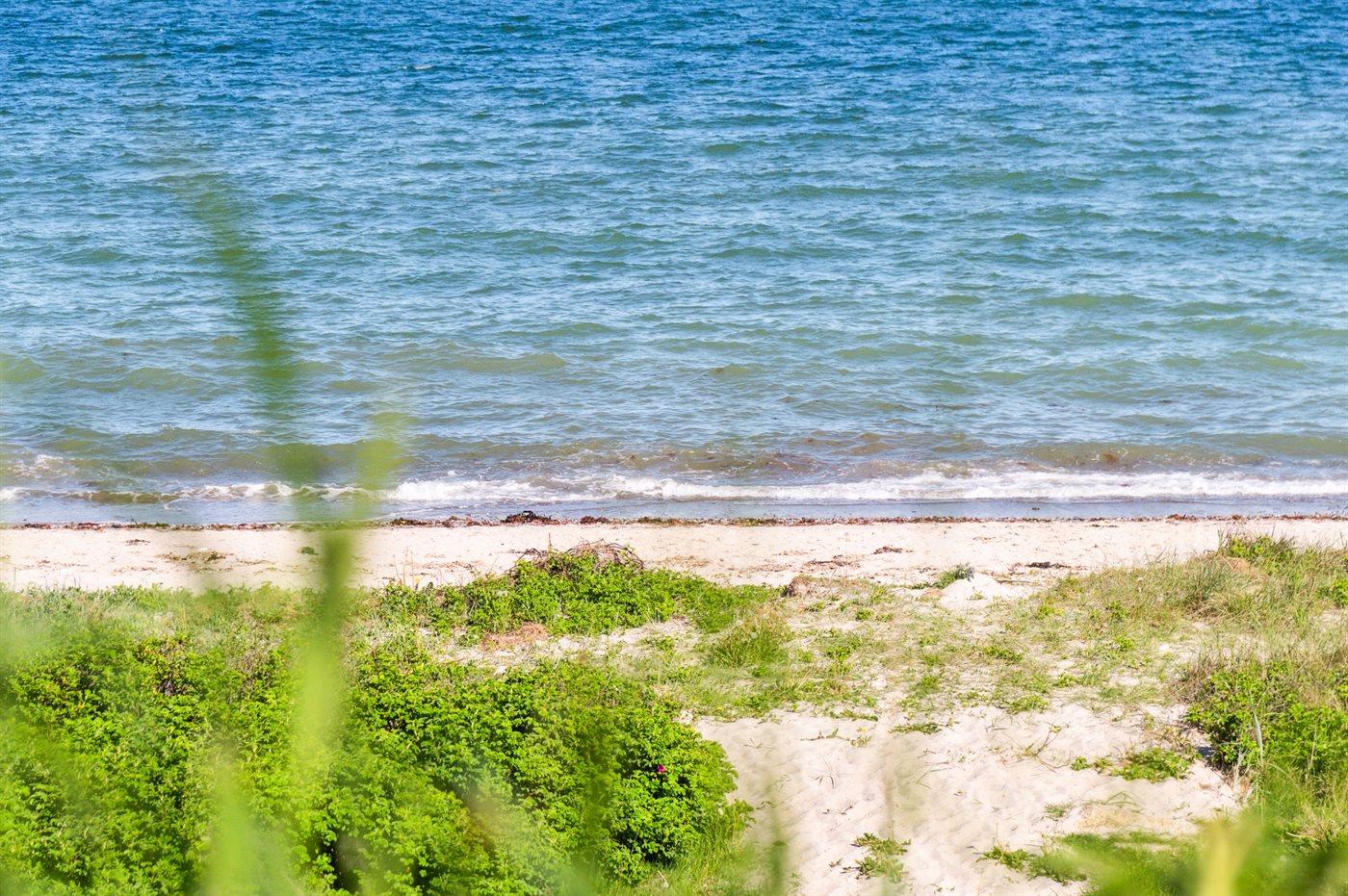 Her er der tale om en ganske enestående beliggenhed i 1. række og med næsten direkte adgang til stranden, som kun ligger 20 meter fra sommerhuset. Kun afbrudt af strandvejen - en bedre beliggenhed er ganske enkelt svær at finde. Stranden er børnevenlig og består af fint hvidt sand, så her er der gode muligheder for at tilbringe mange timer med badning, hygge og leg, hvis vejret tillader det.