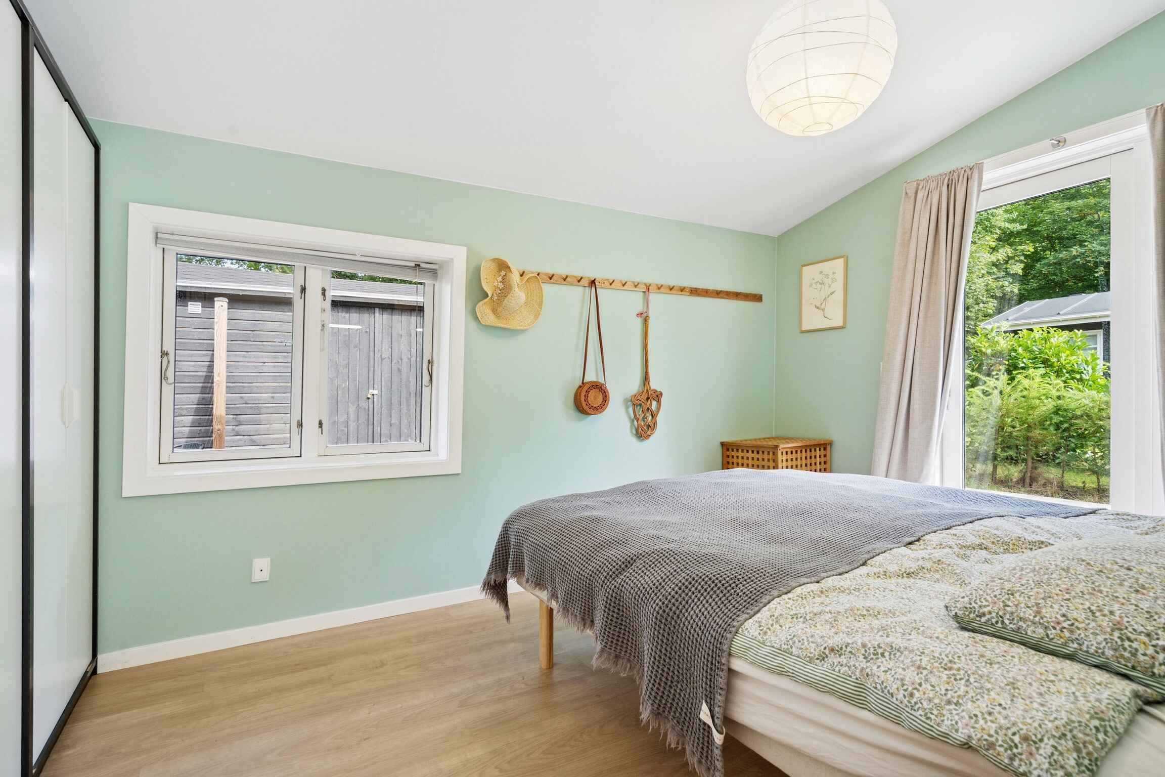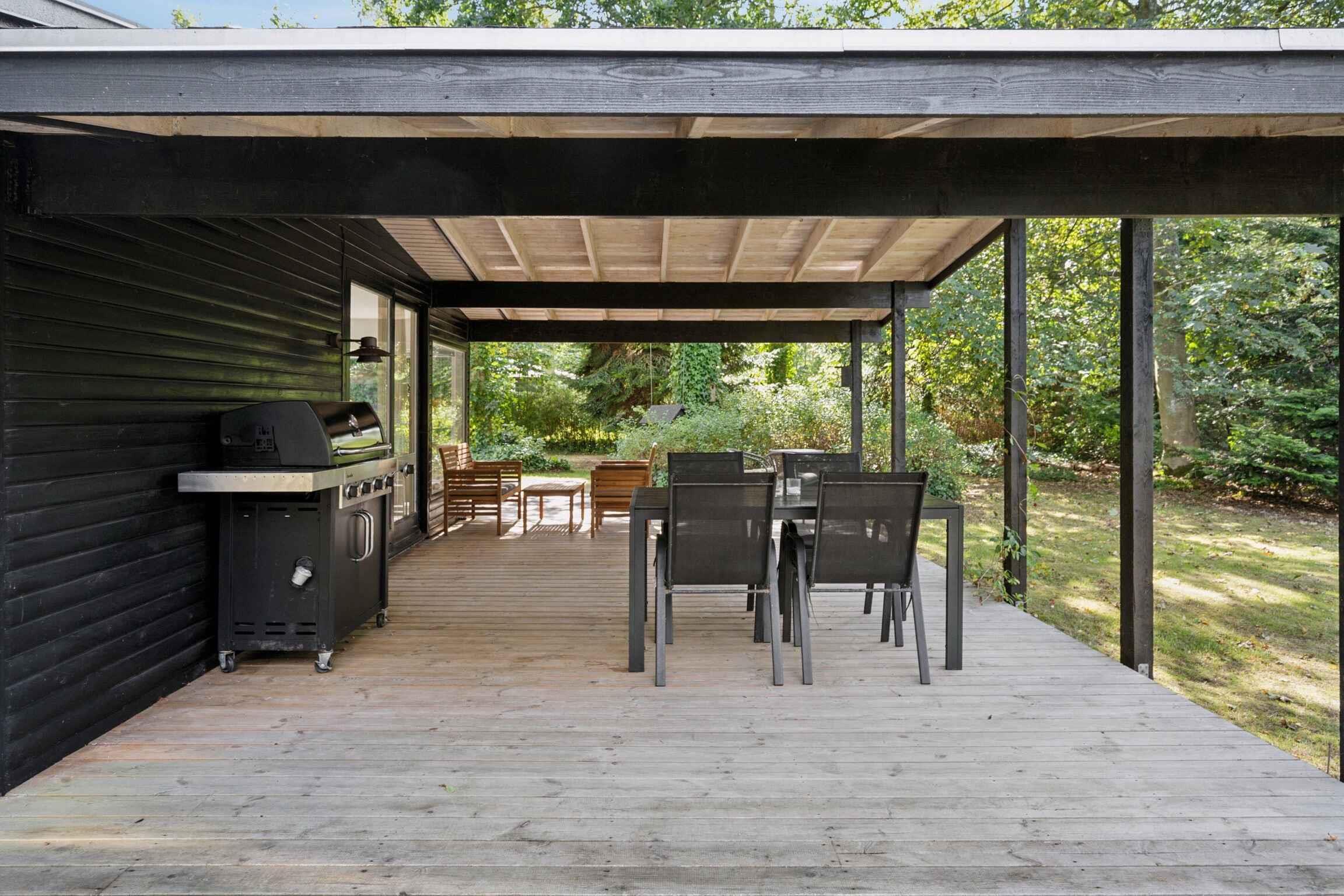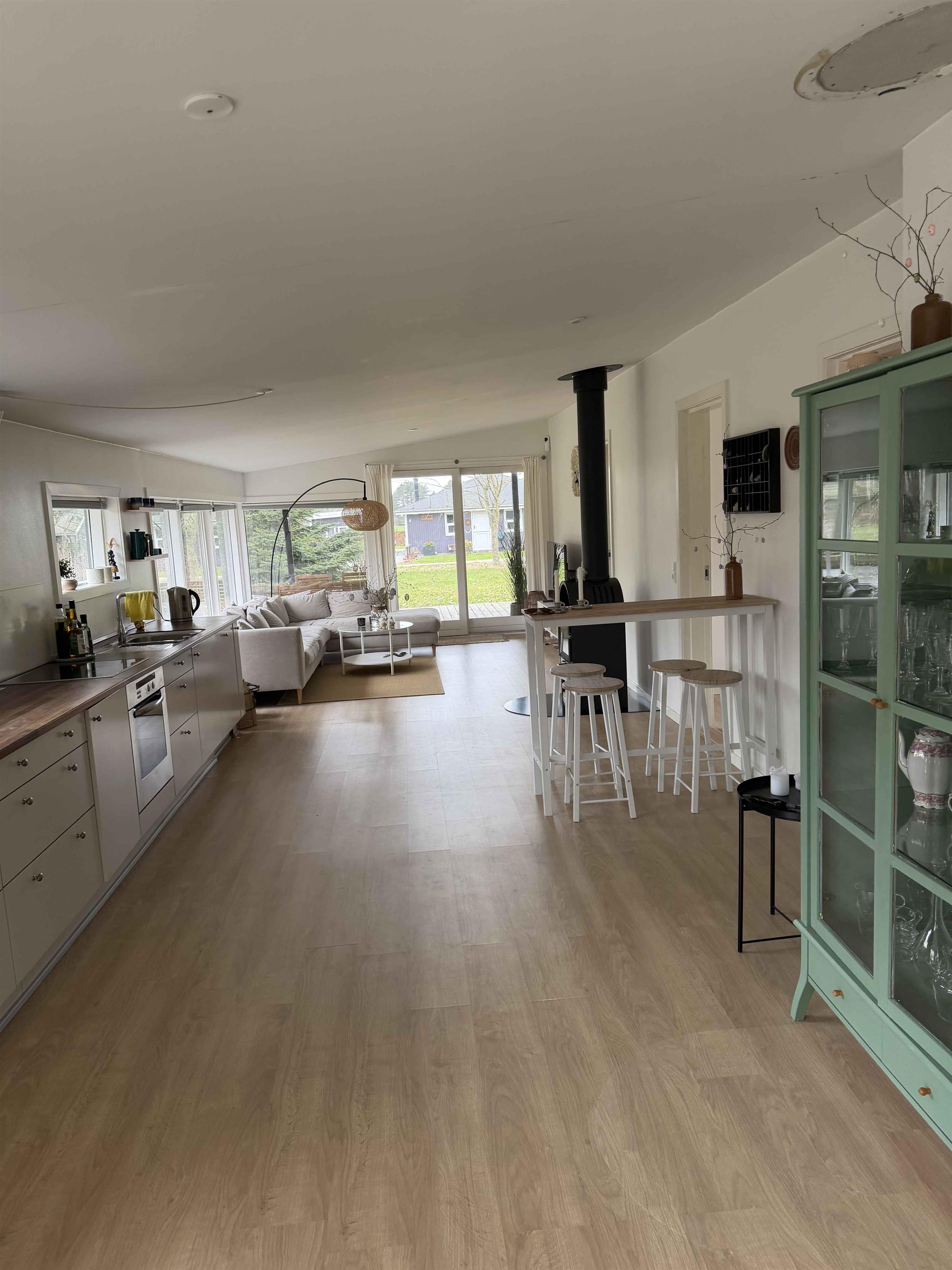 Her bor du blot få hundrede meter fra vandet, omgivet af høje træer og rolige stier. Det renoverede fritidshus på 83 m² rummer tre soveværelser i hovedhuset – alle med dobbeltseng – samt et fjerde soveværelse med dobbeltseng i et fuldt isoleret anneks. Den åbne planløsning, de store vinduer og brændeovnen giver et afslappet og funktionelt opholdssted. Den lyse stue og køkkenet bindes naturligt sammen og åbner mod den store træterrasse, hvor både sol og læ findes dagen igennem. Ét af værelserne har direkte adgang hertil, og annekset giver fleksible muligheder for gæster eller større familier. Terrassen skaber flere udendørs zoner, hvor du kan nyde morgenkaffe, middag i skyggen eller aftener i det udendørs spabad. Det overdækkede område giver plads til grill og samvær, mens haven tilbyder rum til leg, ro og små udendørs projekter. Området omkring huset er særligt attraktivt til ferie. Her finder du fredelige skovstier, lavtliggende strandbredder og gode muligheder for at bade, fiske eller sejle i kajak. Naturen er tæt på, men også små lokale attraktioner, hyggelige havnemiljøer og familievenlige udflugtsmål er inden for rækkevidde. Cykelruter, åbne landskaber og vandrestier gør det let at kombinere afslapning med aktive oplevelser. Med sin rolige beliggenhed i Lystrup Strand er huset et oplagt valg for familier og venner, der ønsker en komfortabel base med moderne faciliteter og nærhed til naturen. Her kan ferieformen skifte fra dag til dag – men følelsen af ro følger med hele vejen.
