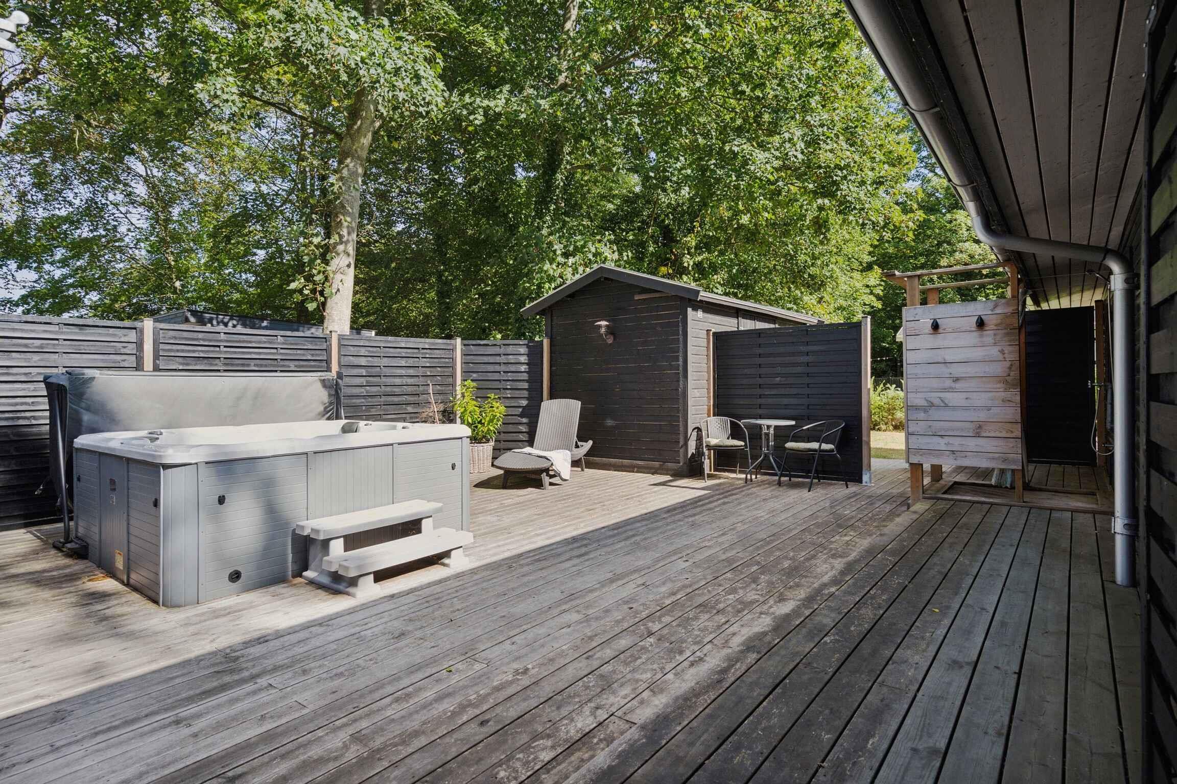 Moderniseret sommerhus ved Lystrup Strand med stor terrasse, spabad og naturskøn beliggenhed tæt på vand og skov.