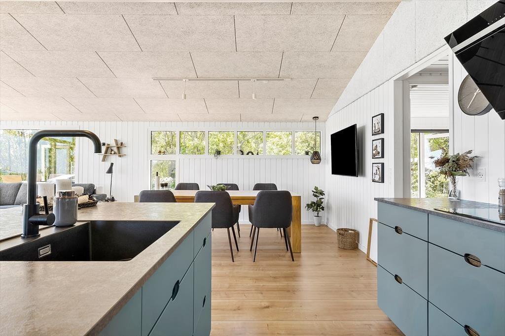 Udsigten til Kattegat er bare én af grundene til, at hyggestunderne i sommerhusets stue bliver ekstra gode. Efter en totalrenovering i 2023 fremstår opholdsrummet nemlig særligt skønt med flotte gulve, akustiklofter til kip og store vinduespartier, der ikke bare byder naturen, men også dagslyset velkommen indenfor. Det stilfulde møblement passer godt ind, og I får gode arbejdsforhold i det åbne køkken, mens brændeovnen og varmepumpen til sammen kan sørge for en behagelig temperatur selv på kølige dage. Også husets øvrige rum fremstår tjekkede, inklusiv brusebadeværelset såvel som de to soveværelser. Begge værelser har dobbeltseng hvoraf det ene er med elevation - desuden er værelserne udstyret med garderobeskab og udgang til terrassen.
