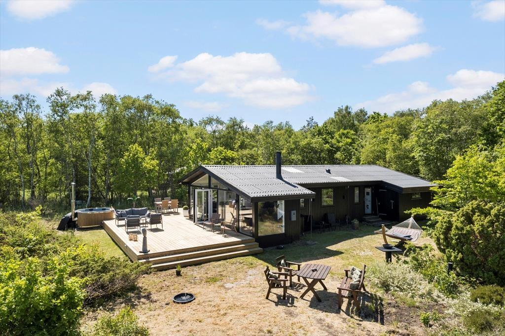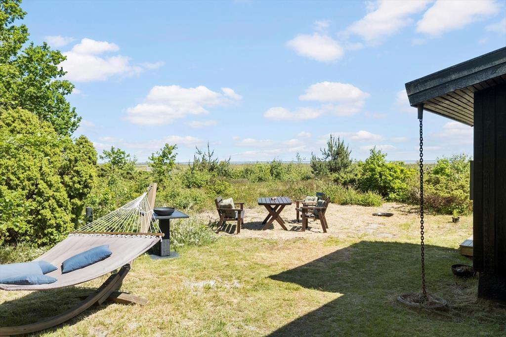 Ude i det fri får I en mindst lige så skøn og stemningsfuld ramme om ferielivet. Her er der nemlig masser af plads til at brede sig på den 70 kvm store træterrassen og på de grønne arealer, der rammes smukt ind af enebærbuske og træer. Mod Syd/øst holdes bevoksningen lav, så I kan skue ud over strandengen og Kattegat – ikke bare fra terrassen, men også fra husets lækre vildmarksbad. Badet er udstyre med massagefunktion der fuldender oplevelsen.
