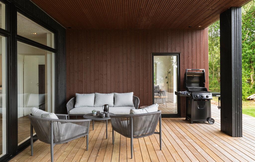 Tilbring jeres ferie i naturskønne omgivelser og med moderne arkitektur. De store vinduer og lækre indretningsløsninger i opholdsstuen i jeres feriehus skaber en behagelig rummelighed. Slap af i hjørnesofaen med udsigt over landskabet. Spil bordfodbold og nyd måltiderne sammen ved det store spisebord i træ. Det moderne køkken med køkkenø giver mulighed for at lave mad i fred og ro og servere morgenmaden lige ud til køkkenbordet.