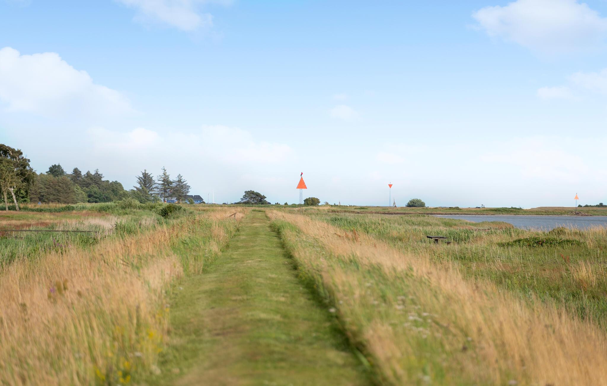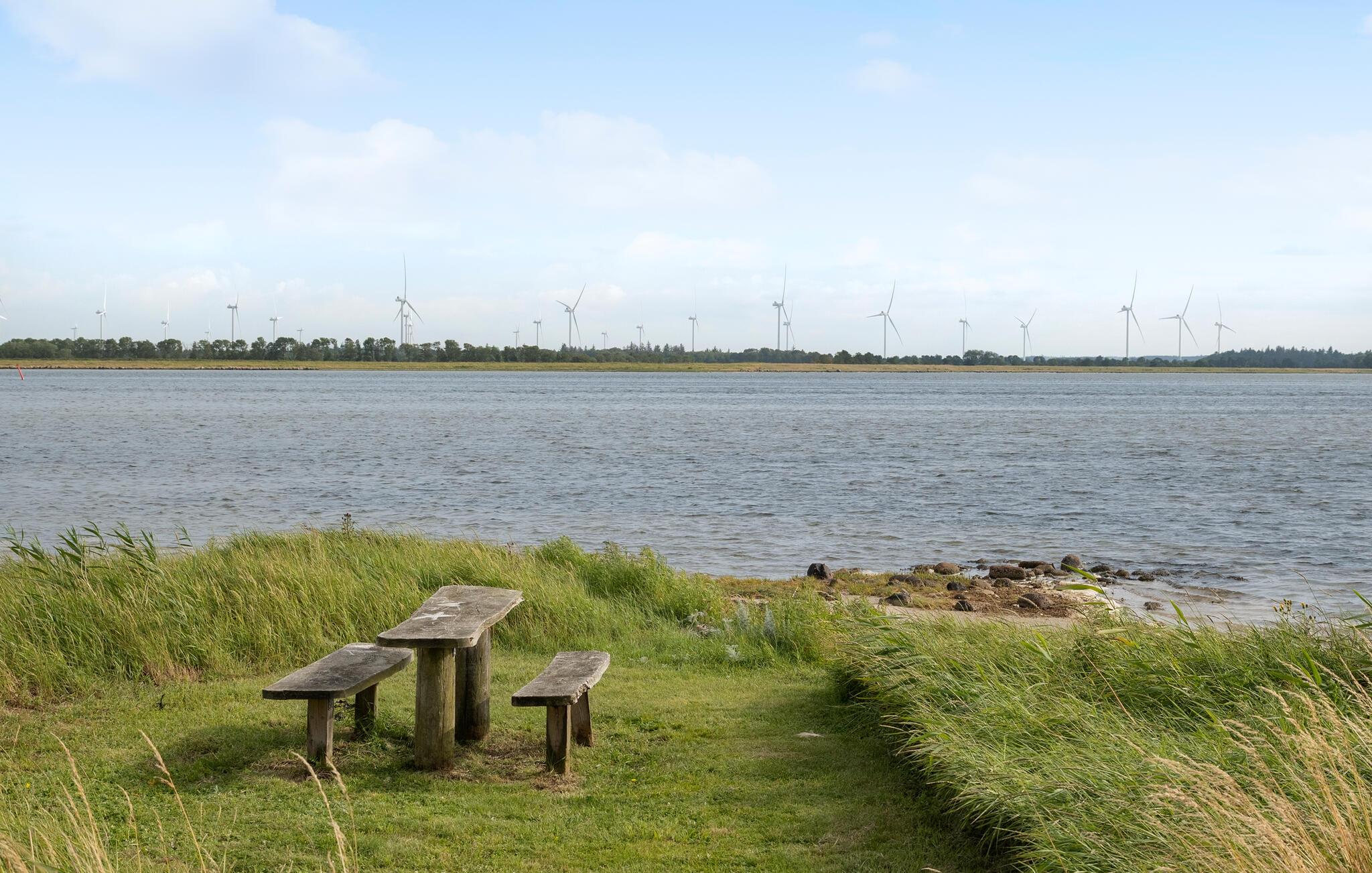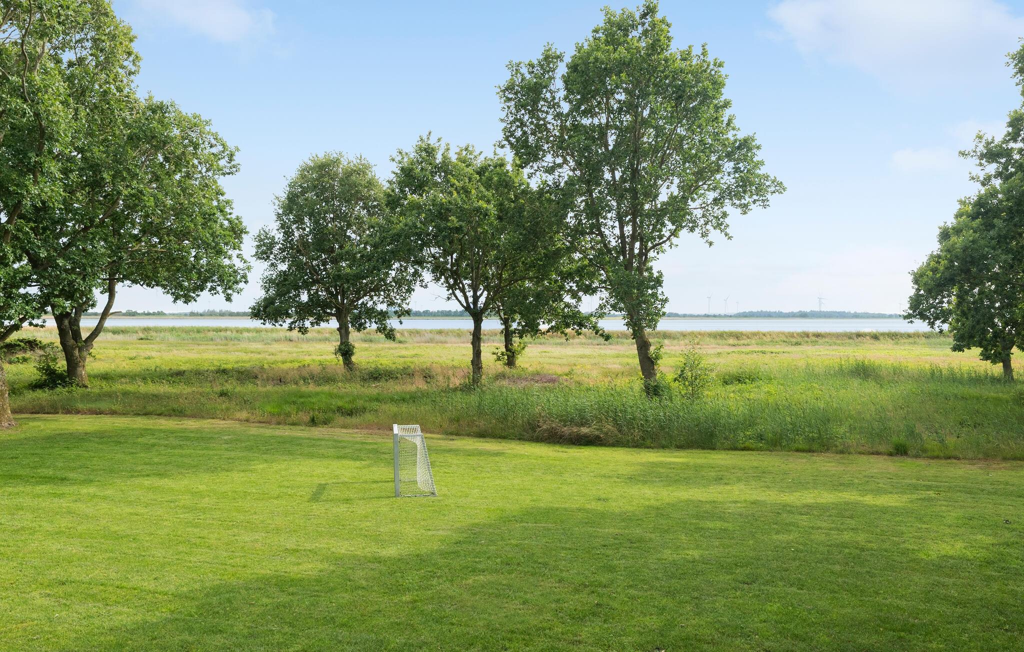 Træd ud på terrassen med udsigt over enge, træer og den rolige bugt. Nyd måltiderne udendørs, sæt jer ved det elegante havebord og nyd den vidtstrakte udsigt. Haven byder på plads til leg og boltre sig. To fodboldmål lægger op til at spille små familiekampe.