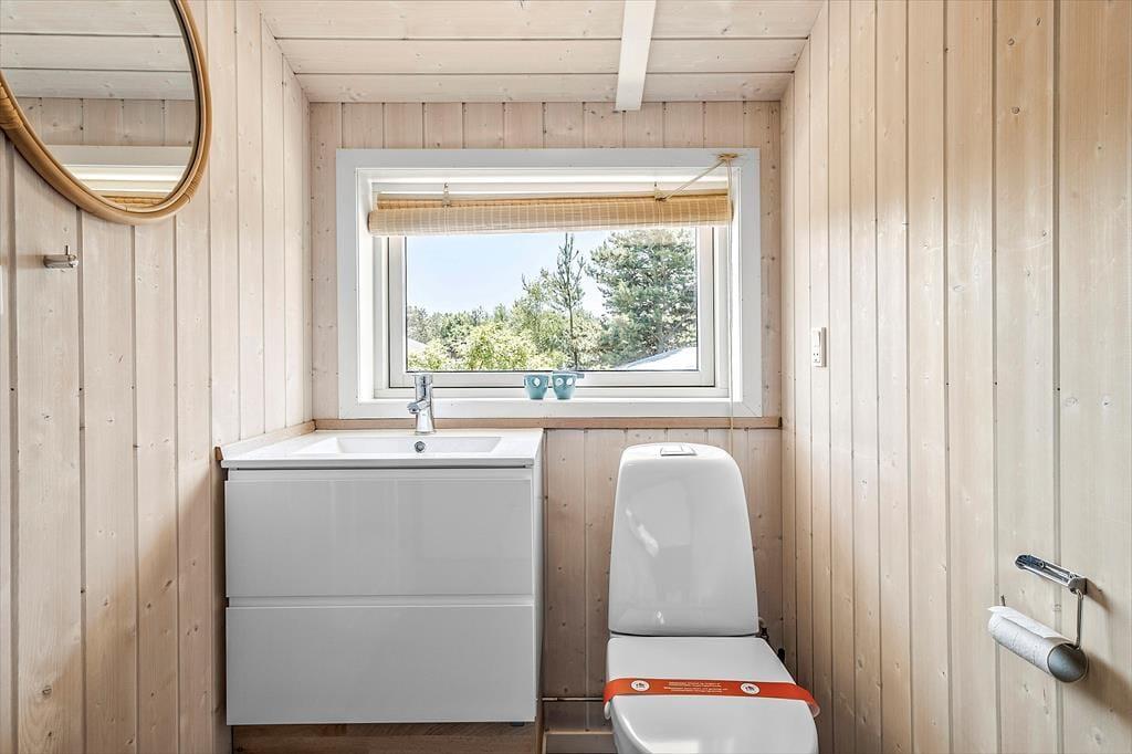 Sommerhuset, der er et moderne byggeri med lys træfacade og solceller på taget, har en glimrende planløsning til otte personer – så en ferie for to børnefamilier kan for eksempel sagtens komme på tale her. Som supplement til de tre soveværelser er der mulighed for at overnatte i stuens alkove, og hvis der er fuldt hus, er det rart, at der hører både et badeværelse og et gæstetoilet med til planløsningen. Et veludstyret køkken ligger i åben forbindelse med stuen, der ligger midt i huset som det oplagte sociale samlingspunkt. Her er der brændeovn, hvis du vil tænde op på eventuelle kølige dage, og rummets store, østvendte vinduesparti sørger for et skønt lysindfald og giver udsigt til havet.