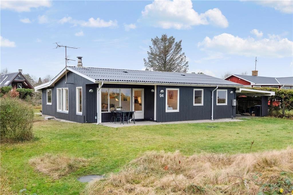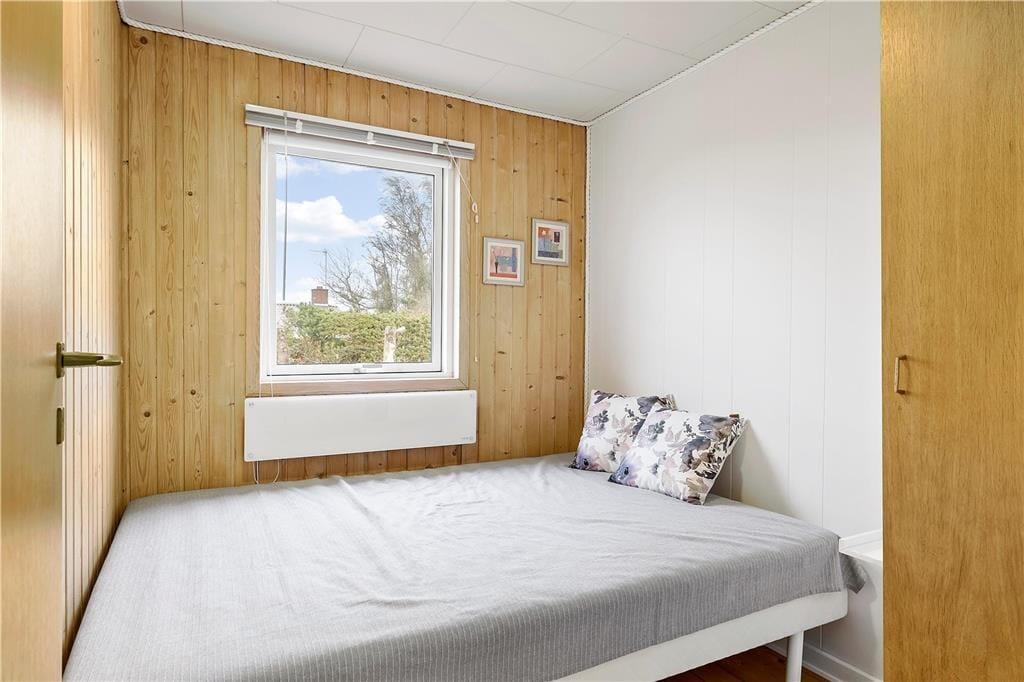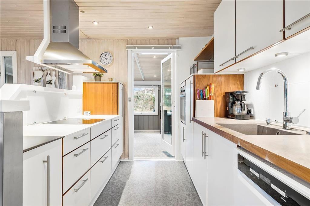 Sommerhuset, der er blevet renoveret i 2020, har en lys og venlig atmosfære inden døre i både opholdsrum og soveværelser. Sidstnævnte er der tre af, og de er alle indrettet med gode dobbeltsenge, mens opholdsrummet består af køkken og stue i åben forbindelse. Her er der brændeovn, sofaafdeling, spisebord og en pæn og veludstyret køkkenafdeling, og i den tilstødende udestue er der endnu mere plads at brede sig på, når I vil hygge jer sammen. Et badeværelse hører naturligvis også med til planløsningen.