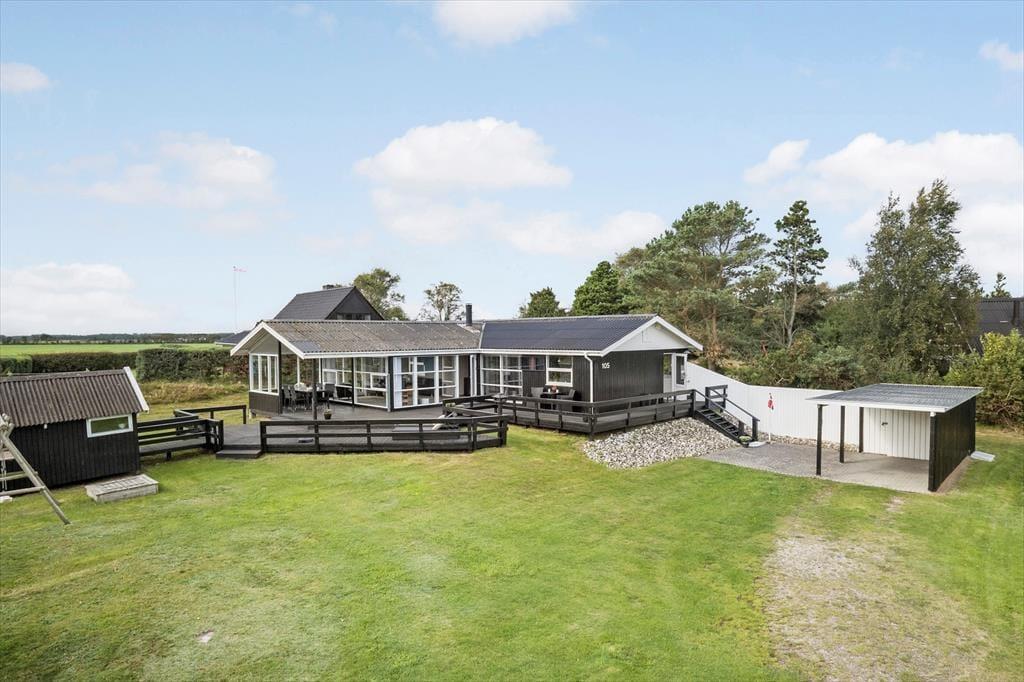 Et stort og herligt terrassemiljø breder sig syd, øst og vest for sommerhuset. Lige ved stuen ligger et overdækket og afskærmet areal, og ellers er resten af terrassen åben, så det er nemt at finde den helt rette opholdsplads alt efter vejr og humør. Vil I lege og være aktive, er der mulighed for at gynge, bygge sandslotte i sandkassen og spille fodbold på græsplænen, og der er også en mooncar til de yngste.