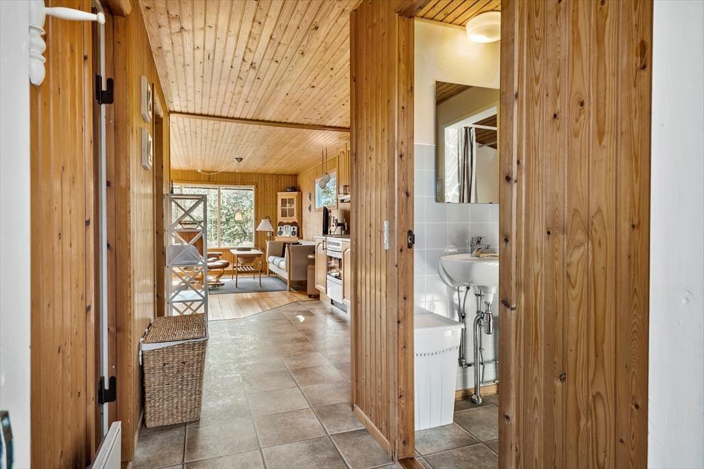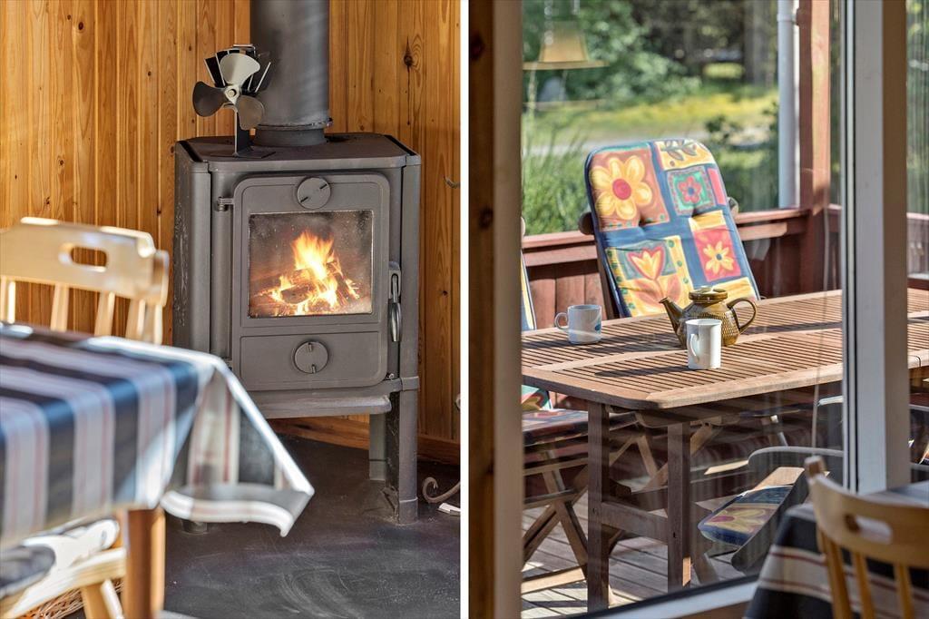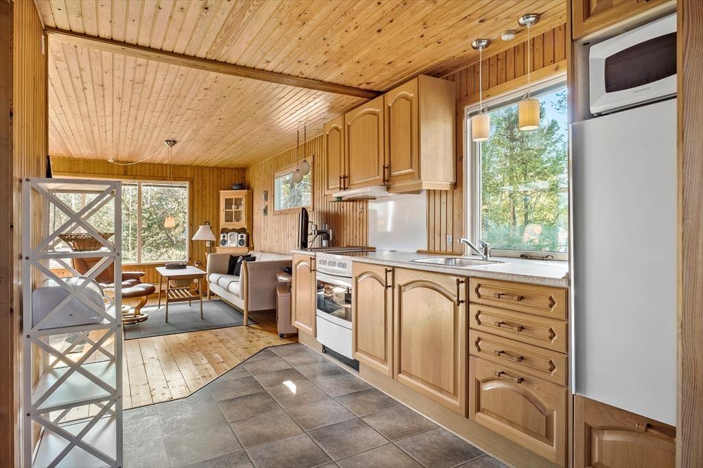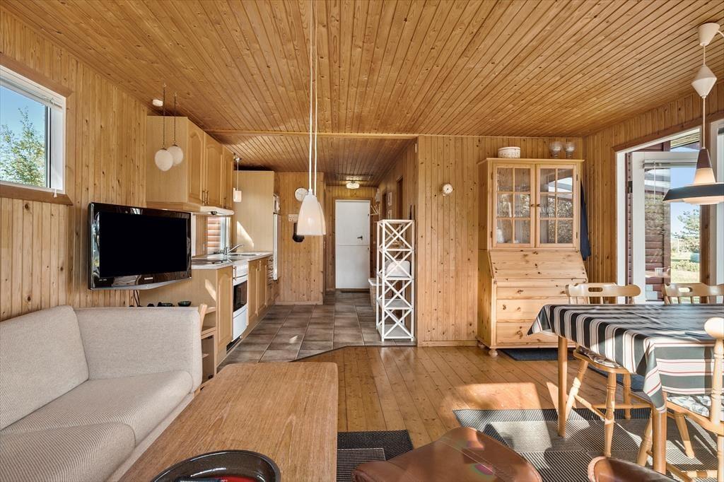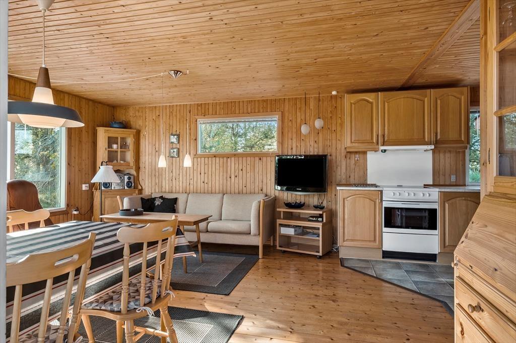 Huset emmer af klassisk sommerhuscharme inde såvel som ude. Her kan du glæde dig til at tilbringe feriedagene i et enkelt og uprætentiøst sommerhus, hvor det er let og ligetil at sætte det hyggelige samvær med familien i fokus. Stue og køkken er integreret i et sammenhængende opholdsmiljø, hvor brændeovnen skruer ekstra op for hyggen på de mørke aftener. Om dagen er der et dejligt naturligt lys fra tre verdenshjørner, og vinduespartierne trækker de grønne omgivelser helt ind i huset. Fra opholdsrummet er der desuden udgang til terrasse og have. Huset indeholder herudover to soveværelser og et badeværelse – perfekt til familien med to børn.