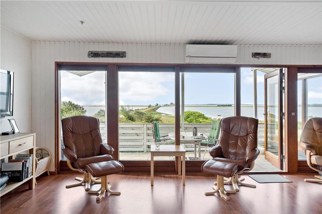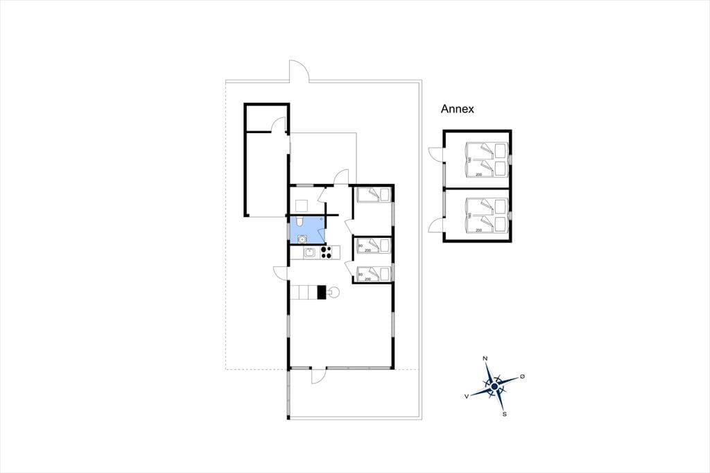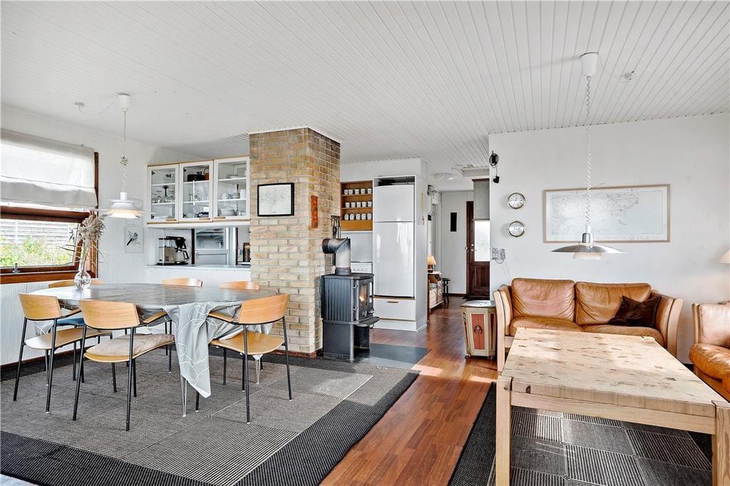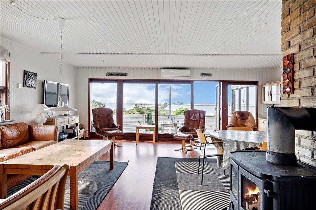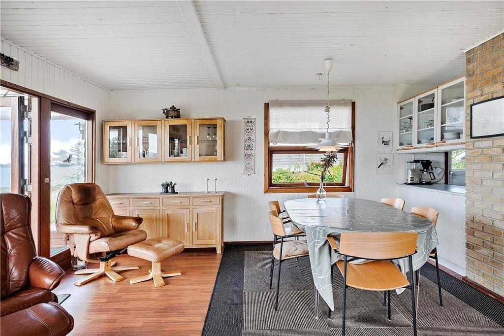 Fra den hyggelige stue med brændeovn er der en pragtfuld udsigt over havet og udgang til terrassen. I forbindelse med stuen og spisehjørnet ligger køkkenet, der har opvaskemaskine. Herfra er der udgang til terrassen på vestsiden af huset. Lyst badeværelse. Et soverum med to enkeltsenge, et soverum med køjeseng. Derudover stort anneks med to soverum med en dobbeltseng i hver. Fra anneksets to soverum har man over vejen til Alrø en skøn udsigt til Lerdrup Bugt og videre mod Gyllingnæs og Kattegat.