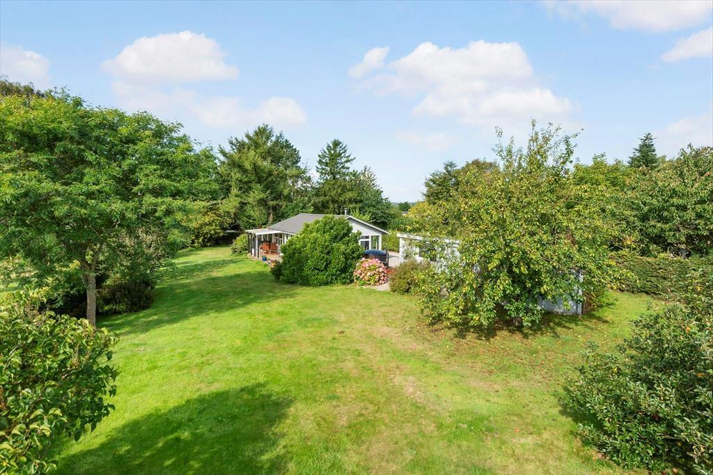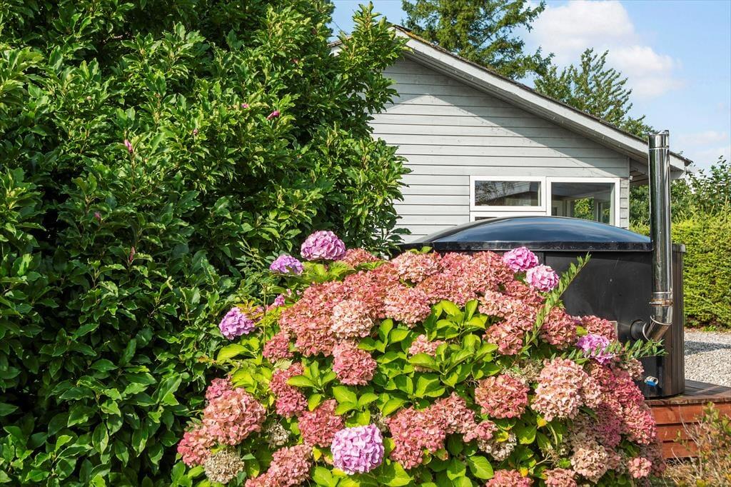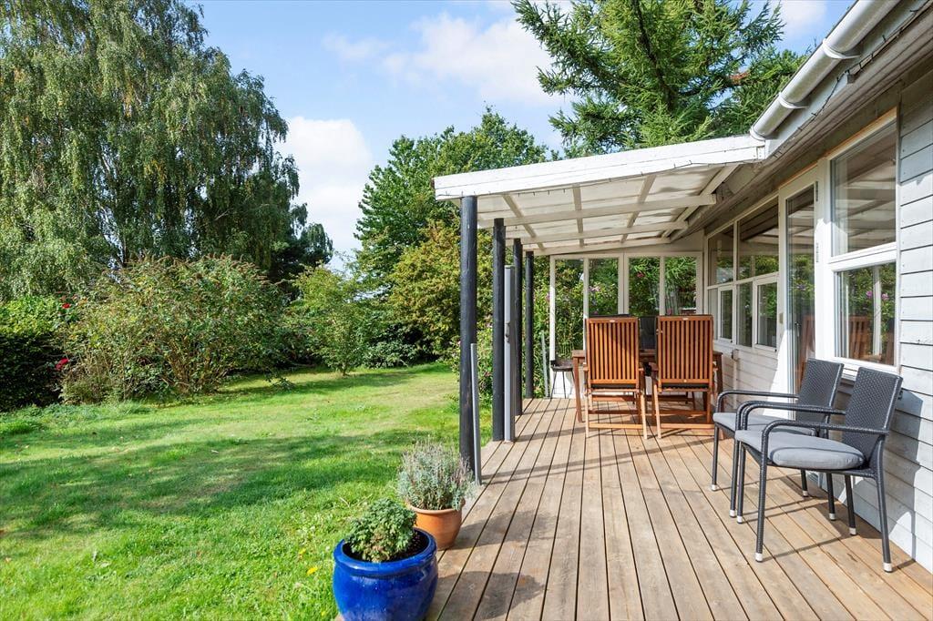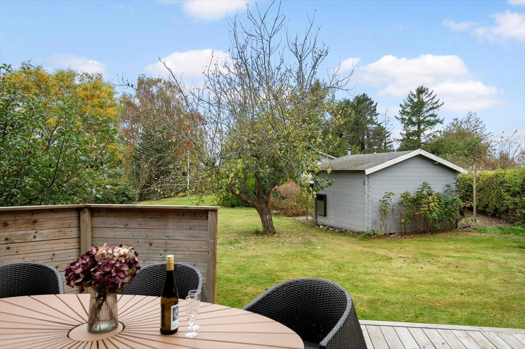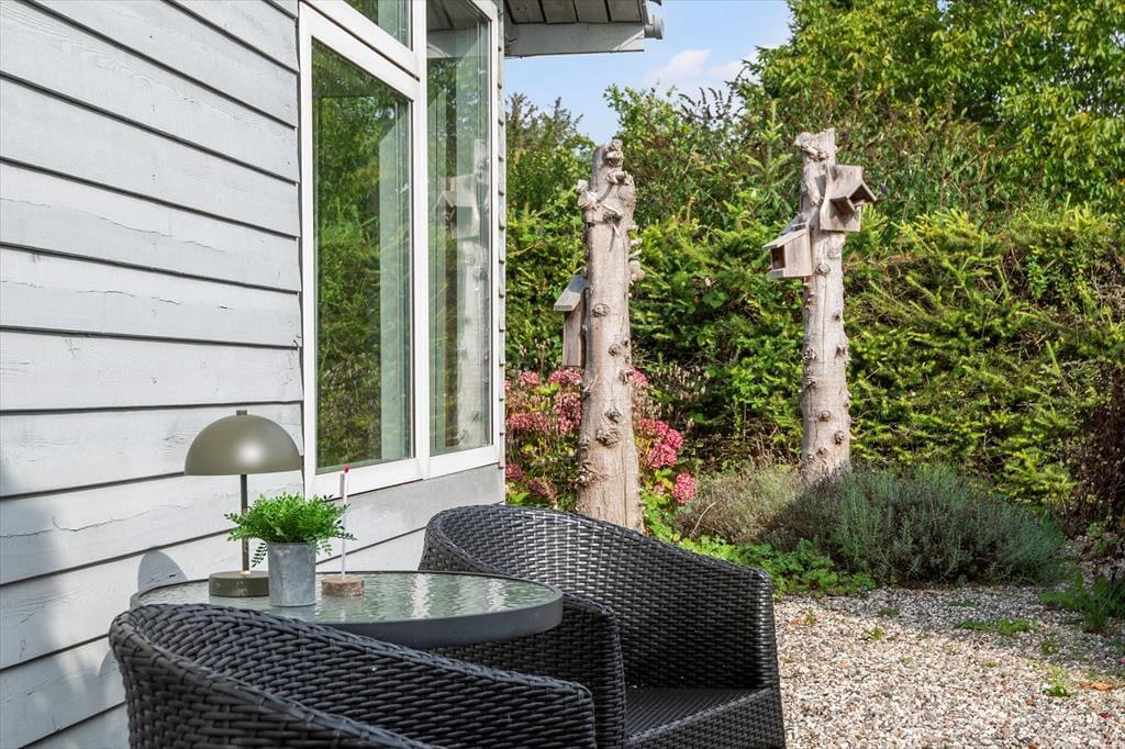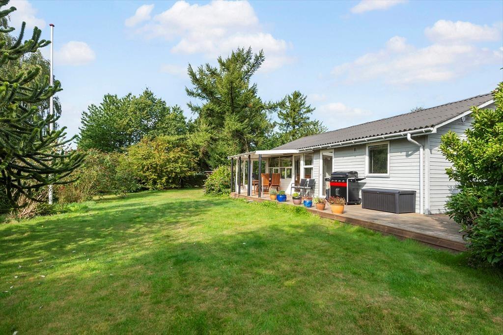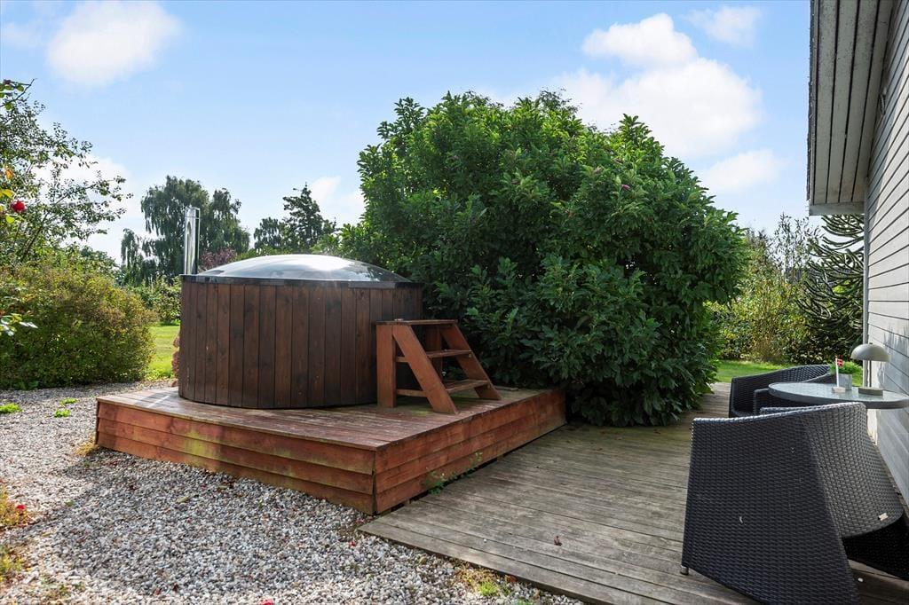 Udenfor åbner haven sig som et grønt frirum omgivet af træer og fuglefløjt. Her kan du nyde feriedagene på den solrige terrasse med en god kop kaffe i hånden, mens du lytter til naturens lyde omkring dig. Måske frister et dyp i vildmarksbadet, hvor du kan lade varmen og udsigten smelte sammen til ren velvære. Den store, indhegnede grund giver masser af plads til både leg og ro – og har du hund med, kan den frit nyde de trygge omgivelser. Når du får lyst til at mærke sandet mellem tæerne, ligger kysten kun en kort gåtur væk.