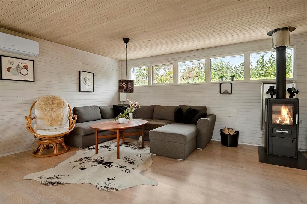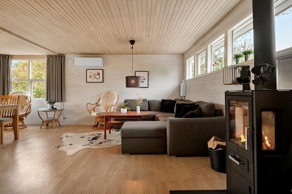 Indenfor møder du en varm og indbydende atmosfære, hvor lyset strømmer ind gennem de store vinduer og giver rummet en rolig energi. Det åbne køkken og stueområdet danner den naturlige ramme for feriens hyggelige stunder – her samles du og dine nærmeste om madlavning, spil eller gode samtaler, mens flammerne knitrer i brændeovnen. De lyse rum, den enkle indretning og de små detaljer vidner om et sted, hvor du hurtigt føler dig hjemme. Og når dagen går på hæld, venter der rolige nætter i de hyggelige soveværelser, så du kan vågne frisk og klar til nye oplevelser.