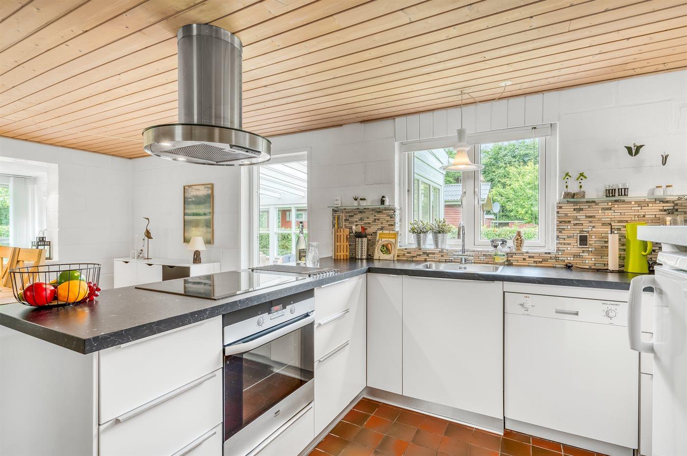 Køkkenet er udstyret med 1 køleskab. Der er 4 keramiske kogeplader, varmluftovn, mikrobølgeovn samt opvaskemaskine.