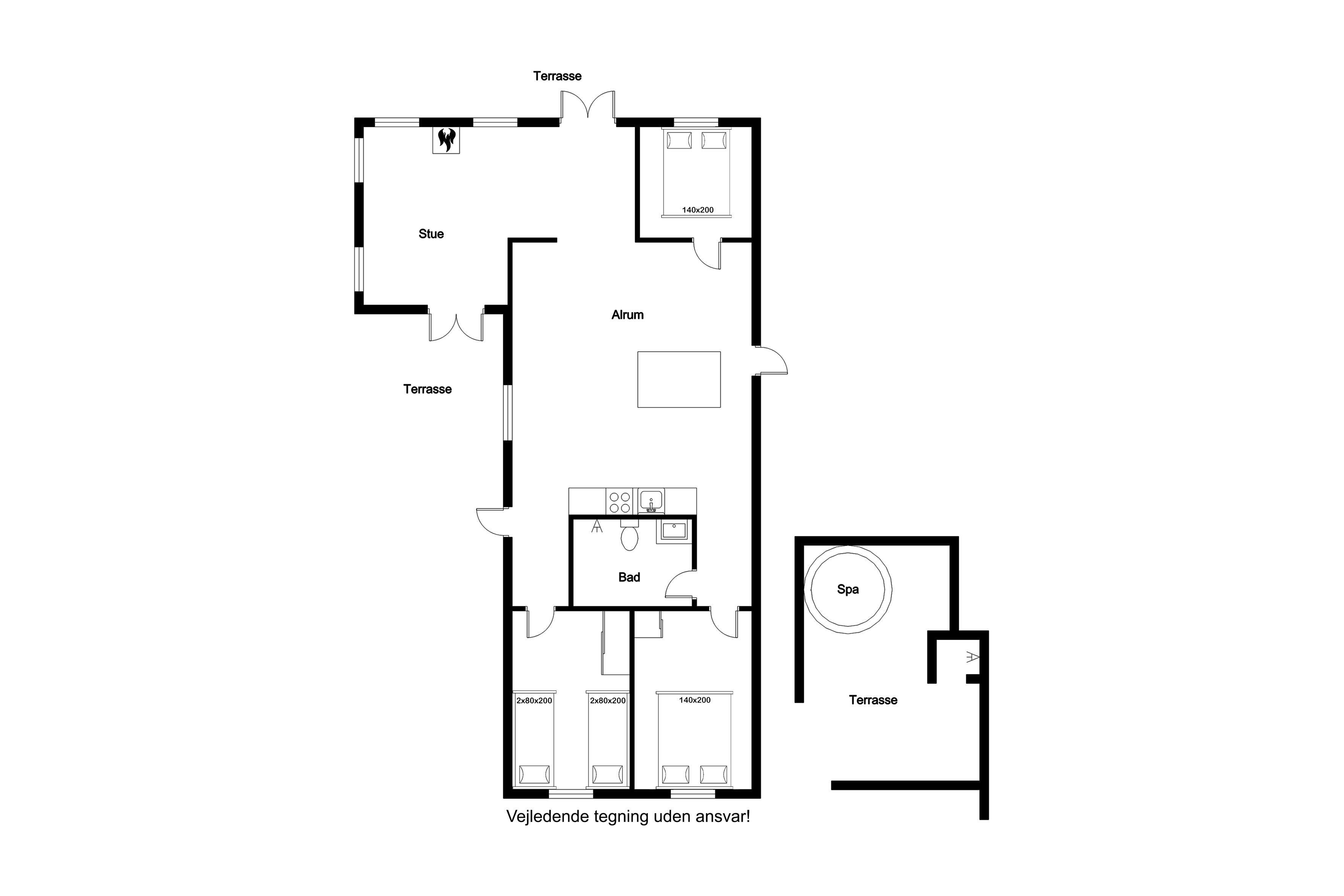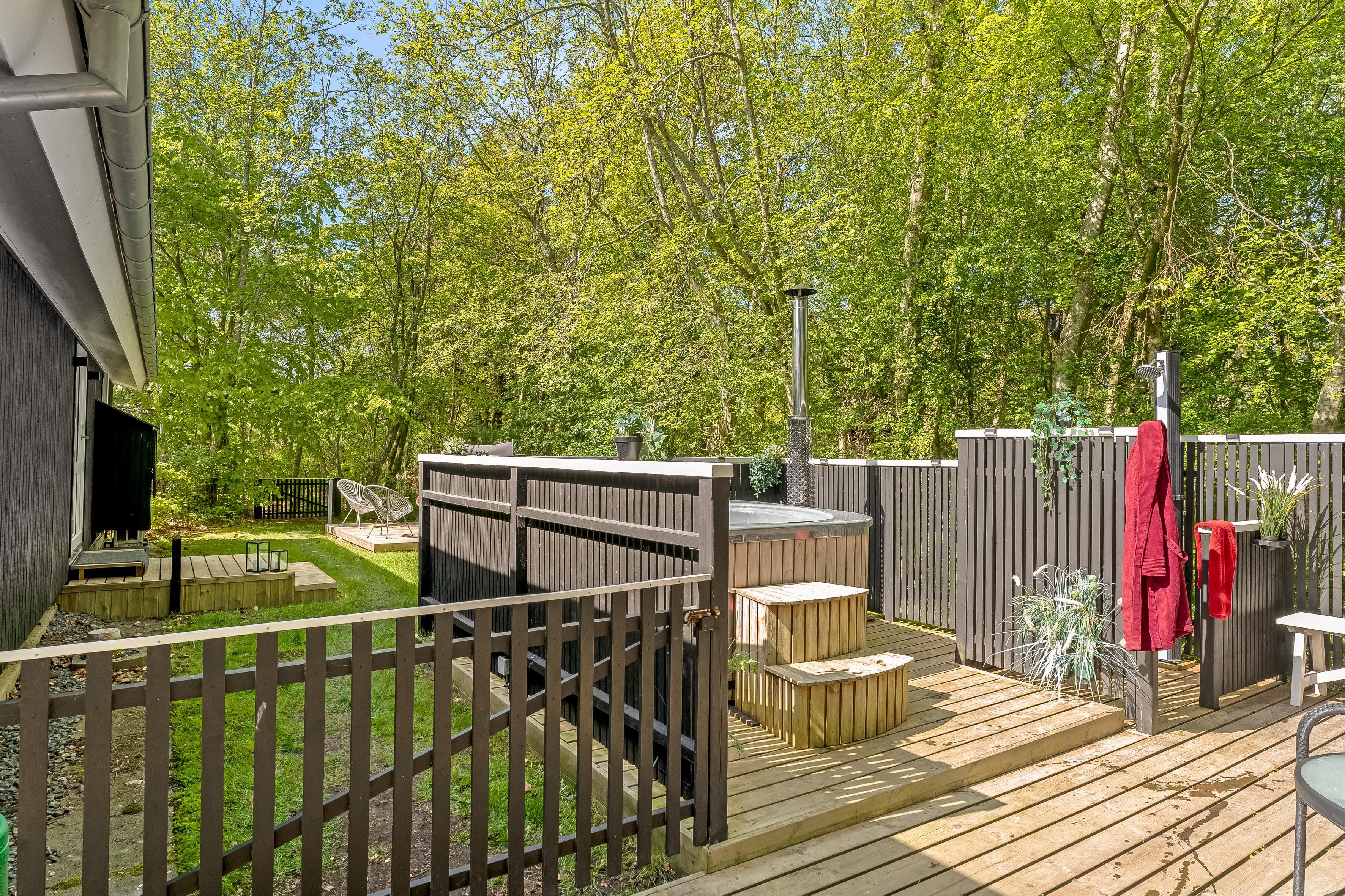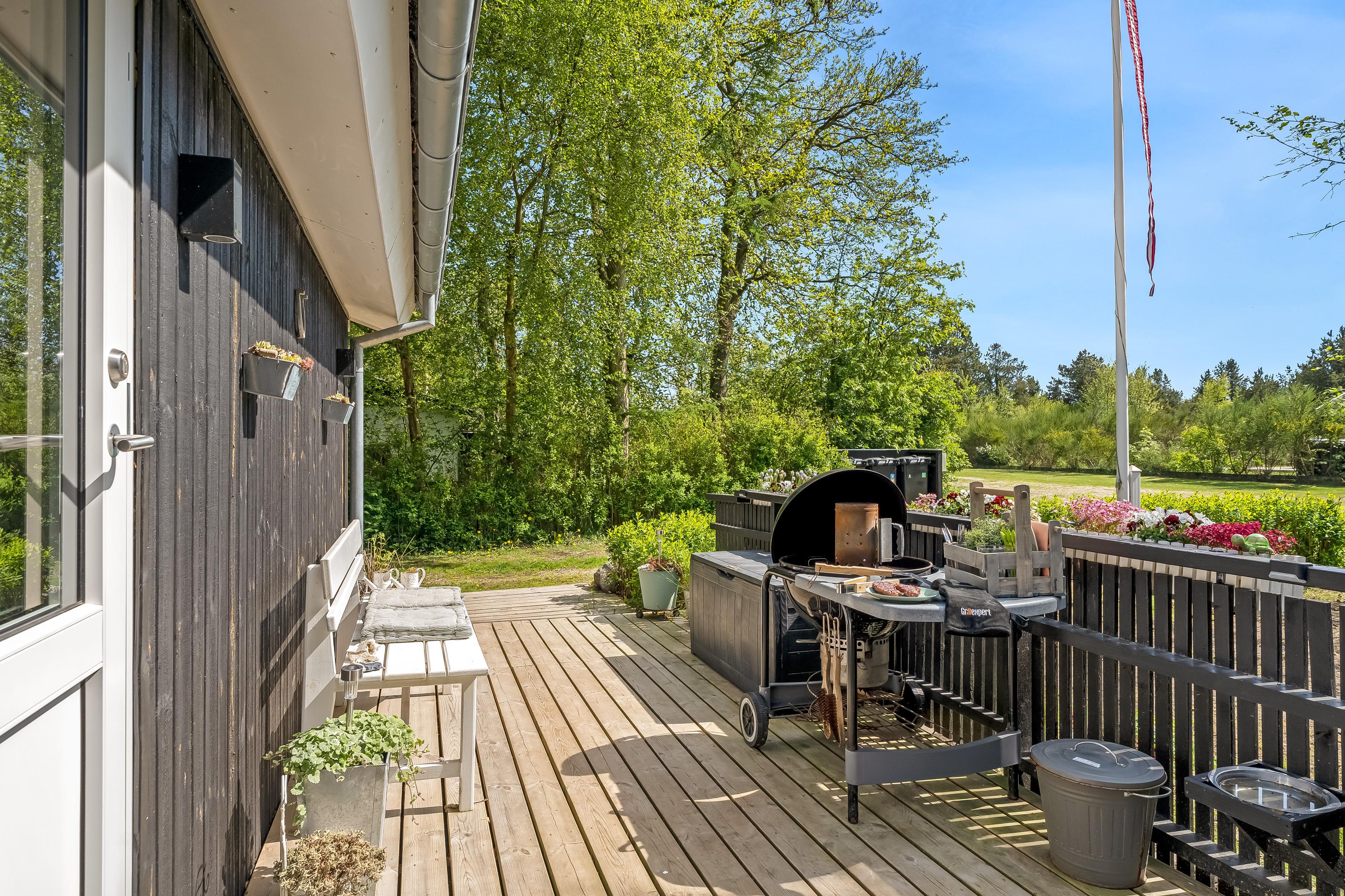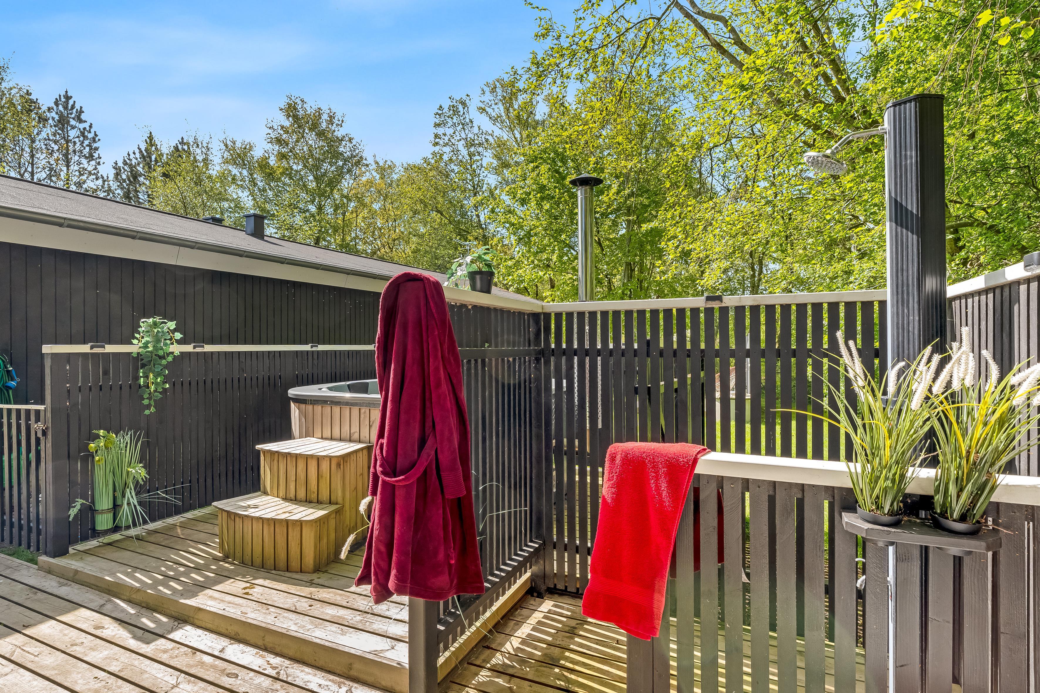 Huset ligger kun 400 meter fra vandet, hvilket giver dig mulighed for at nyde de smukke strande og vandaktiviteter inden for en kort gåtur. Den indbydende lukkede terrasse og den åbne terrasse er perfekte til udendørs afslapning, hvor du kan nyde det danske vejr, grille lækre måltider, eller blot slappe af med en god bog. For dem, der ønsker lidt ekstra forkælelse, er der et vildmarksbad, der kan rumme op til 6 personer, perfekt til at slappe af efter en lang dag med eventyr.