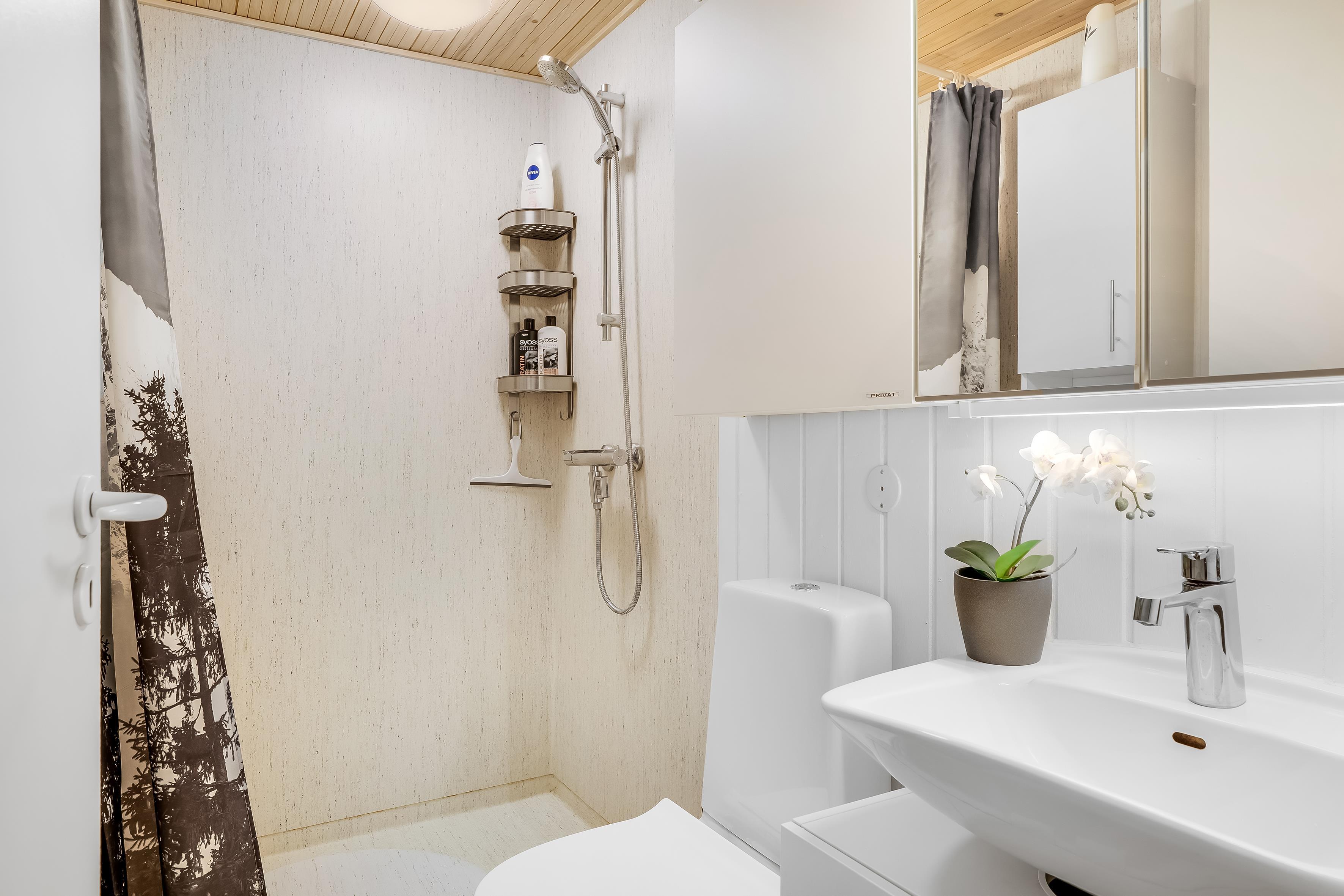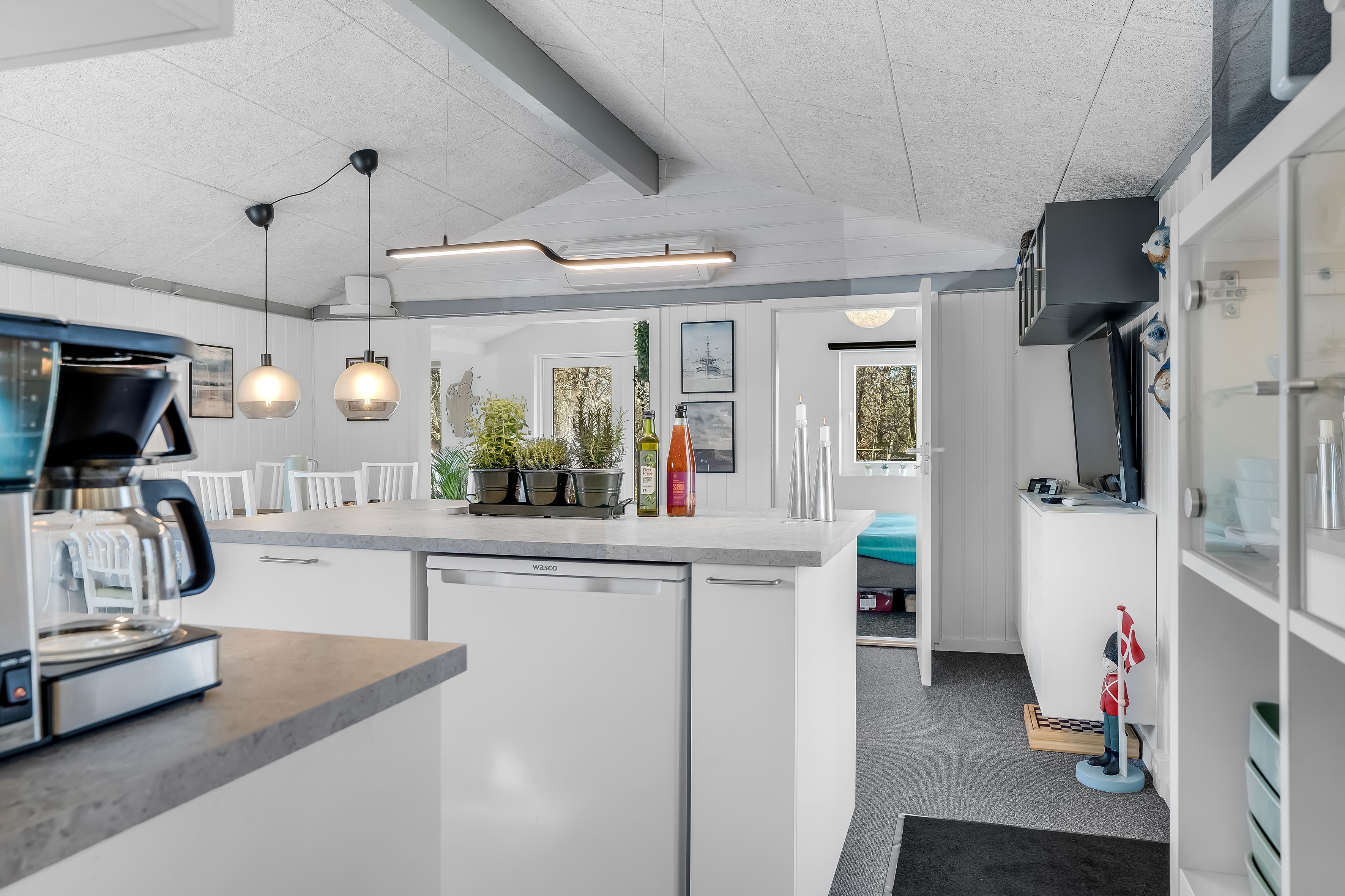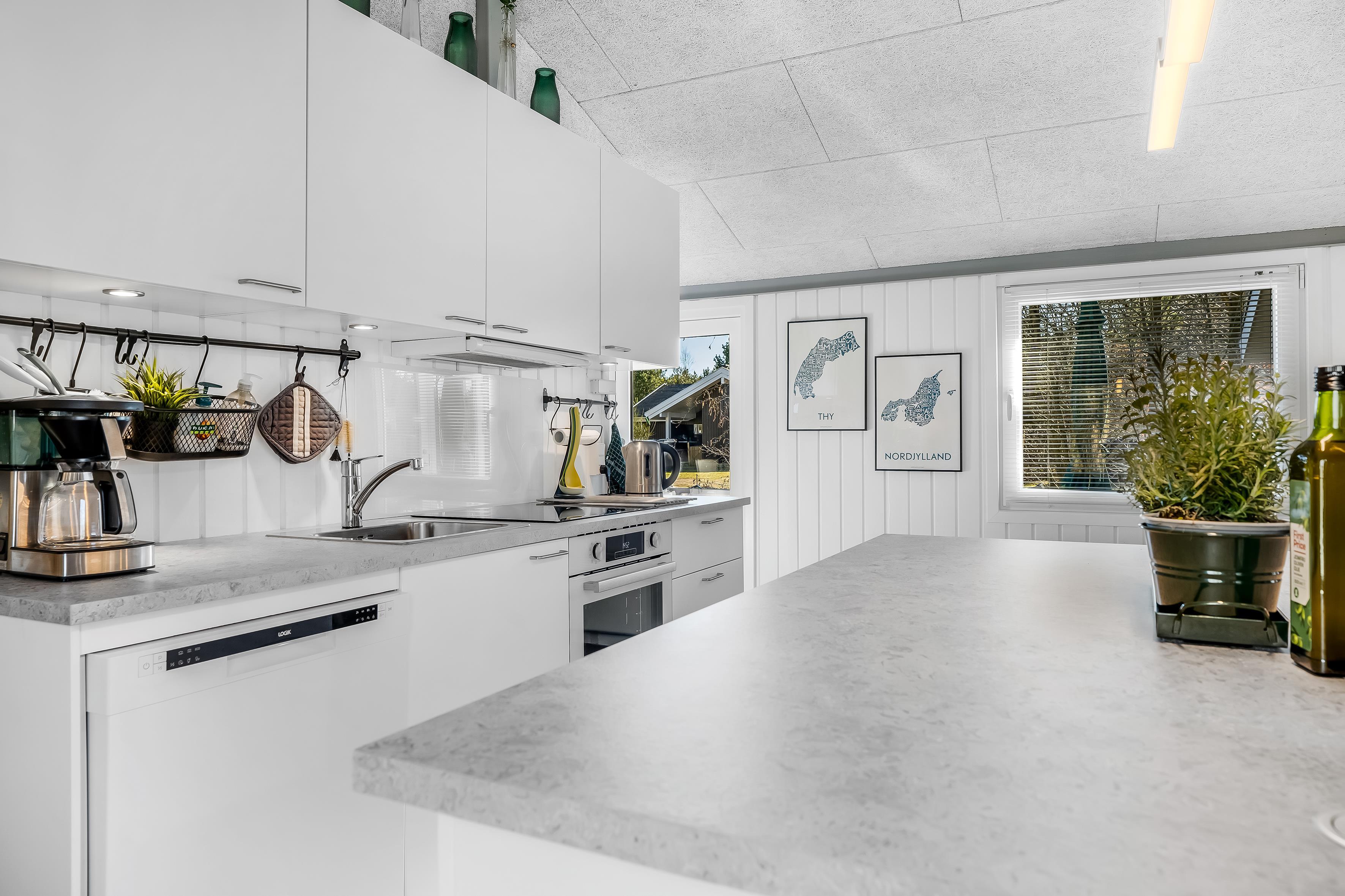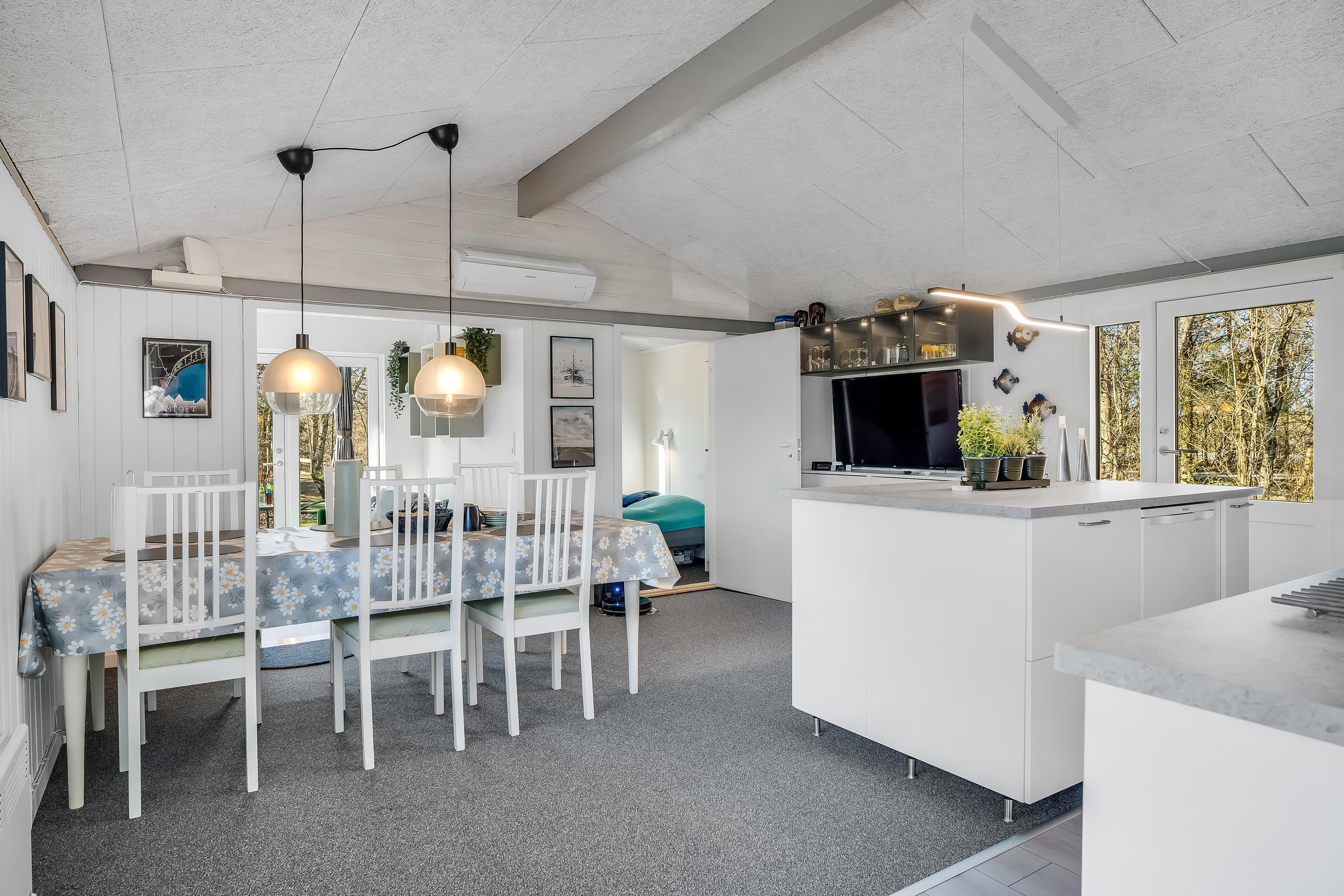 Indenfor finder du et lyst og indbydende opholdsrum, der er udstyret med en træpilleovn, som skaber en varm og hyggelig stemning på køligere aftener. Der er også en varmepumpe og aircondition, der sikrer et behageligt indeklima året rundt. Det moderne køkken er udstyret med alt, hvad du behøver for at forberede lækre måltider, herunder et induktionskomfur, ovn, mikrobølgeovn, opvaskemaskine og et stort køleskab med fryser på 68 liter. Vaskemaskine og tørretumbler er også tilgængelige, hvilket gør det nemt at holde dit tøj friskt under dit ophold.