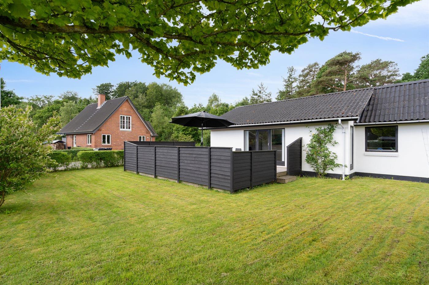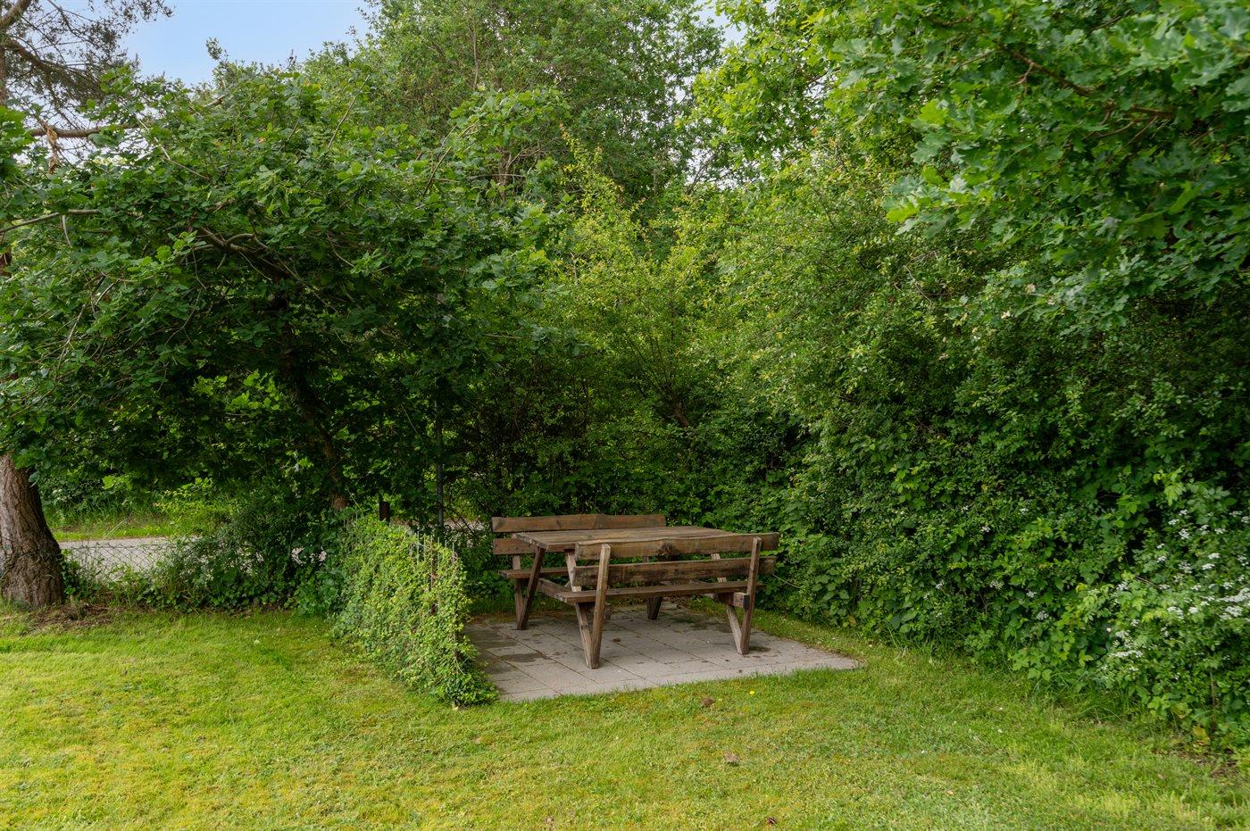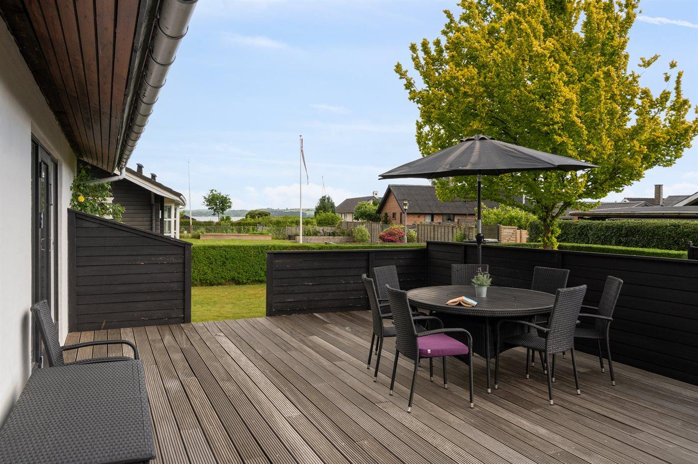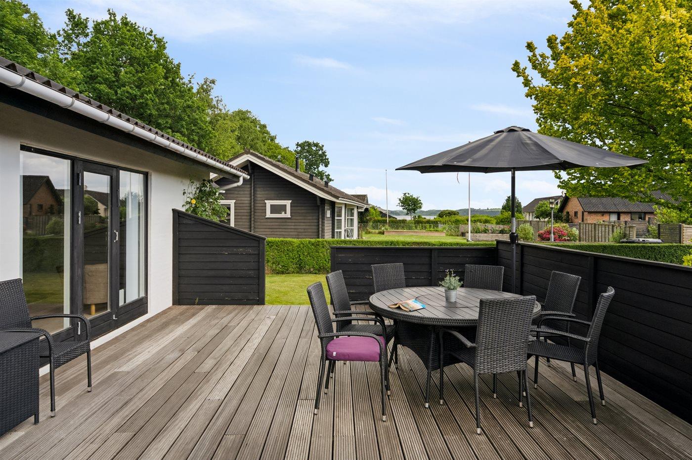 Huset har en rigtig skøn terrasse med havemøbler og 2 solsenge, hvor den smukke udsigt over vandet i høj grad kan nydes og på den modsatte side af huset findes endnu en dejlig terrasse, som er overdækket og ligger ganske ugenert, da grunden grænser op til skoven. Herfra kan stilheden nydes i fulde drag, og der er altid mulighed for at finde en fin lækrog. Ferieområdet indbyder til gåture i den dejlige natur, og en særlig oplevelse er et besøg på Hvidbjerg Klit, som ligger 7 kilometer meter fra huset.