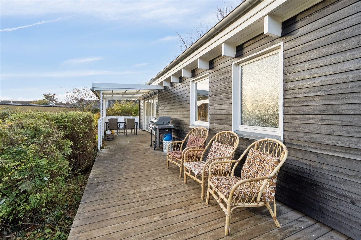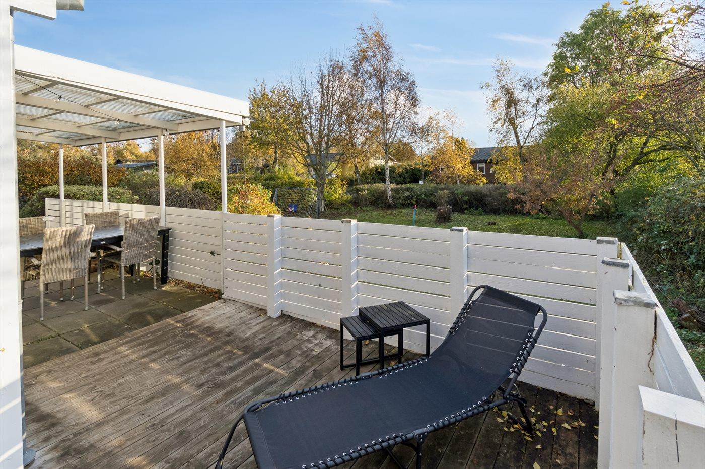 Sommerhuset har en større terrasse, der er delvist overdækket, og den er lagt, så man både kan nyde formiddagssolen og eftermiddagssolen. Haven er lys og med god plads til boldspil eller blot at nyde solen.