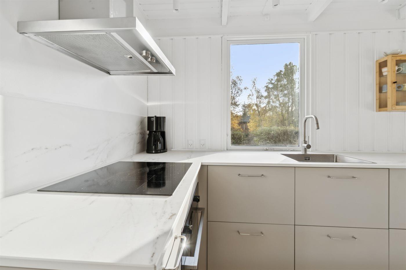 Køkkenet er udstyret med 1 køleskab. Der er 4 induktionskogeplader, varmluftovn samt opvaskemaskine.