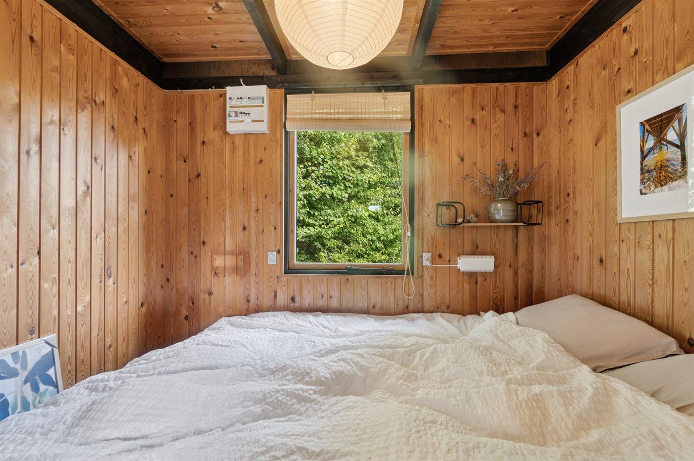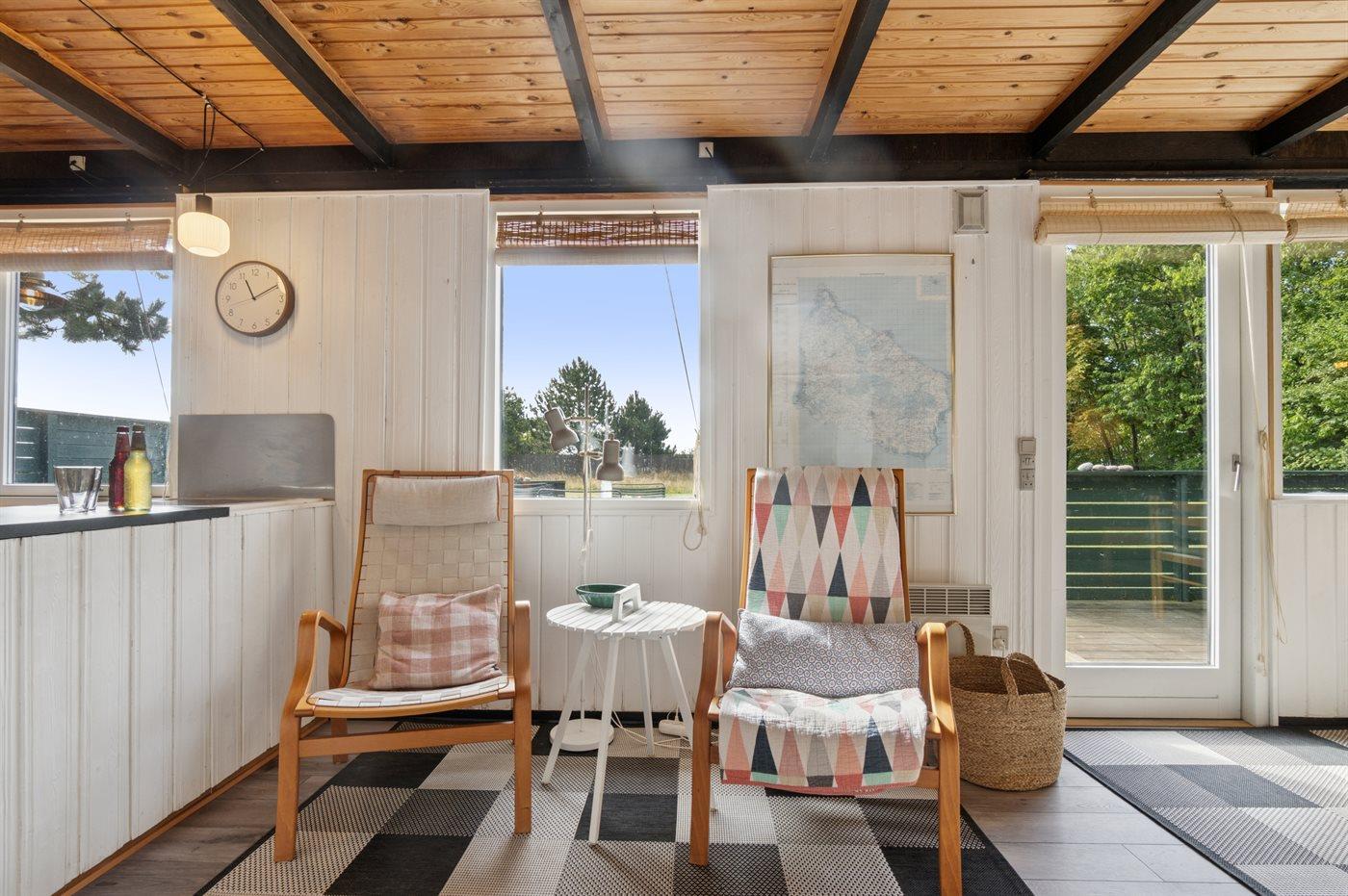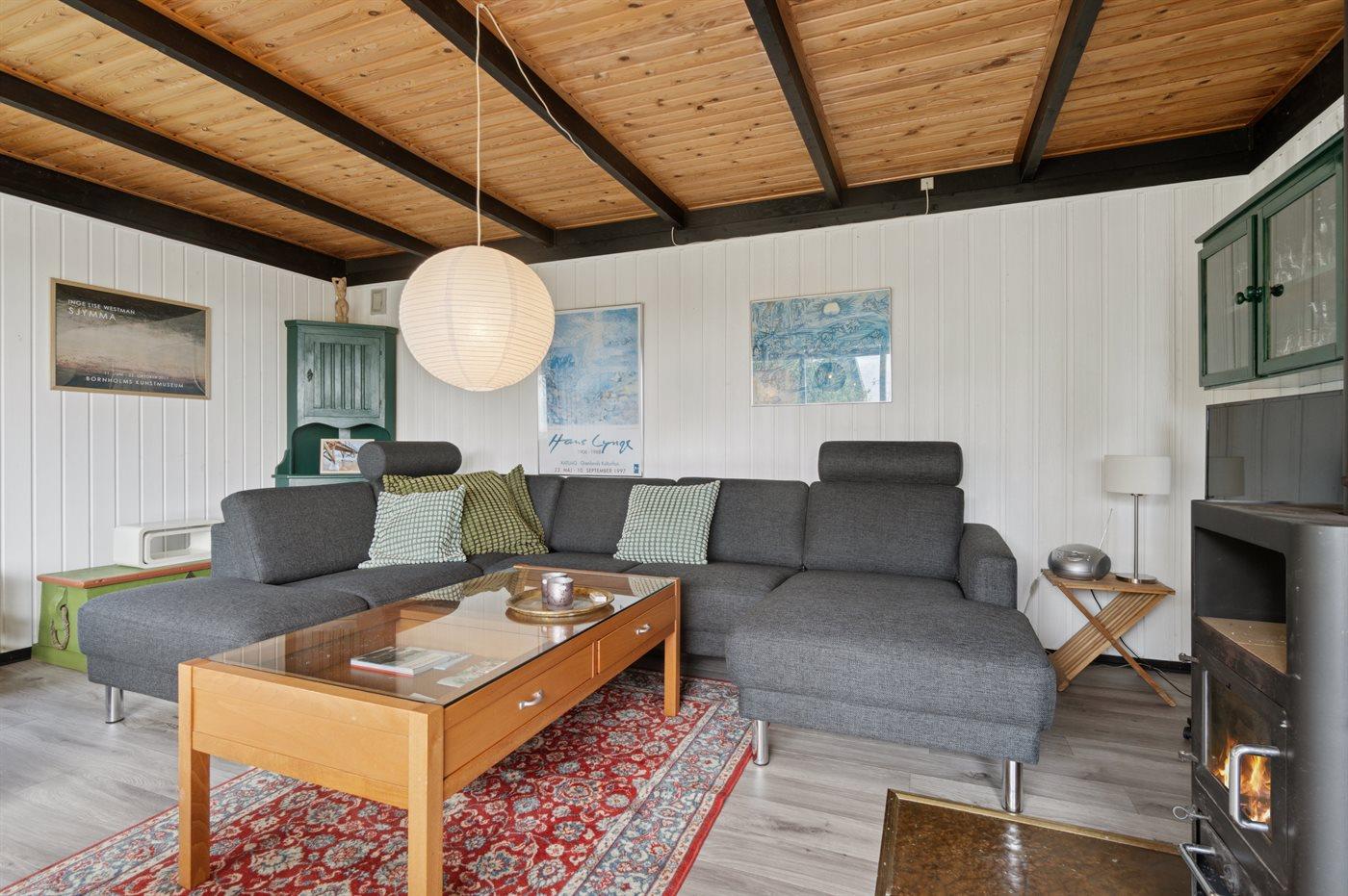 Vægge og gulve er holdt i varme, lyse farver og hele indretningen gør, at man får en dejlig fornemmelse af velvære i dette sommerhus. Der findes også en brændeovn, som sørger for hyggelig varme på kølige dage. Køkkenafdelingen med bl.a. opvaskemaskine er velfungerende og integreret i stuen. Der findes også et pænt og indbydende badeværelse.