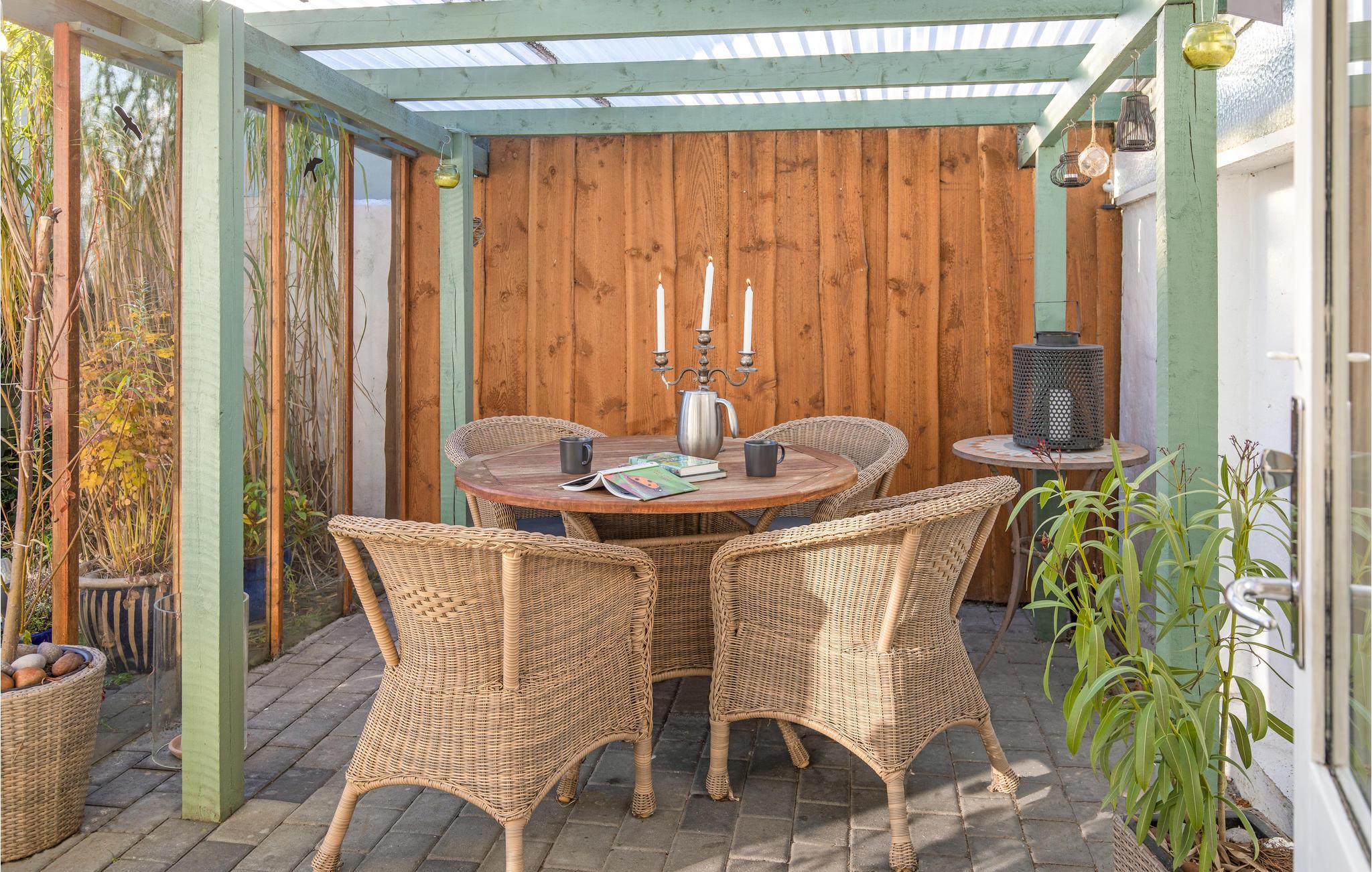 Dette lyse og venlige sommerhus byder velkommen til op til fire voksne og et barn med sine to soveværelser, et badeværelse, en køkken og en stue. På de flotte, delvist overdækkede terasser kan I spise morgenmad og senere lade dagen gå på hæld ?med et godt glas vin. I kan slappe dejligt af i haven, hvor børnene har god plads til at lege. En grill er til rådighed til hyggelige grillaftener.