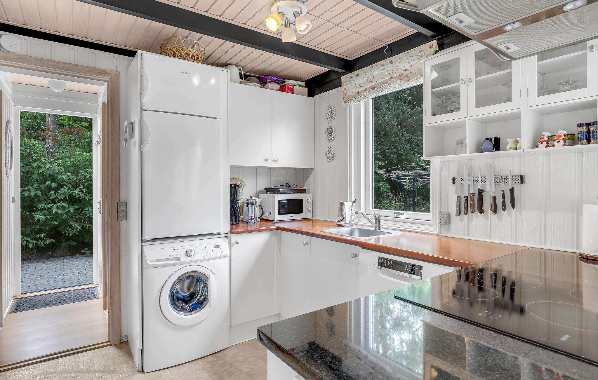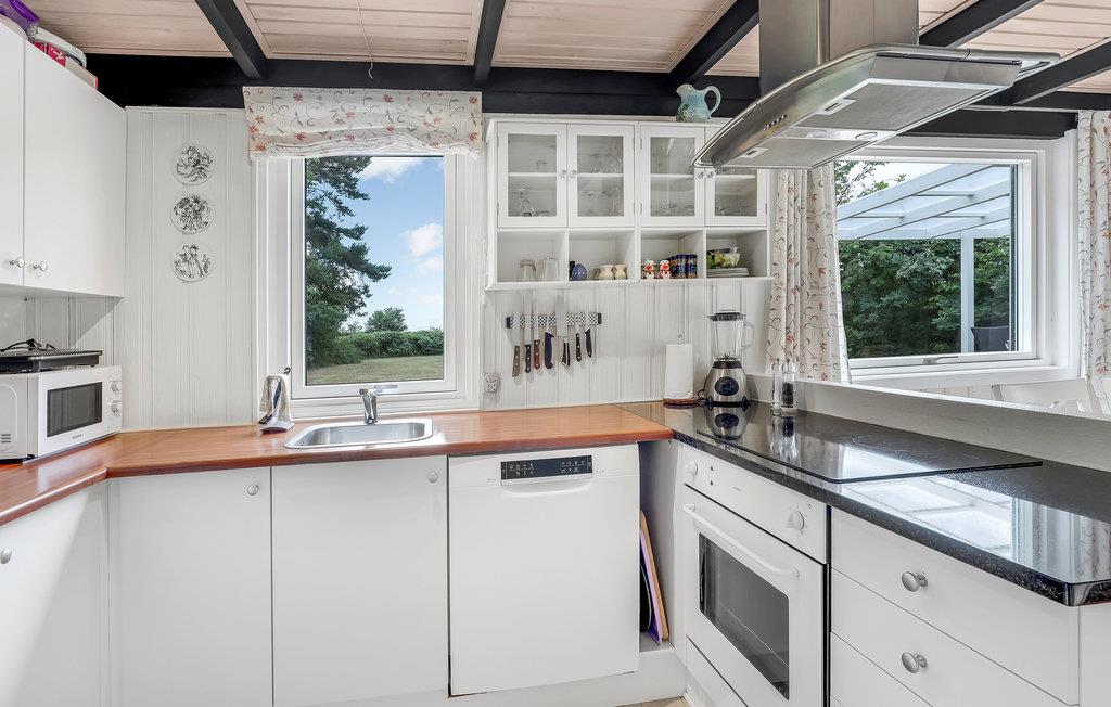 Huset fremtræder pænt og indbydende indendøre med et godt køkken/alrum/opholdsstue med brændeovn til de lidt køligere dage. Stuen er stor, og her kan I sætte jer godt til rette og spille nogle af de mange brætspil i kommoden og i skuret.