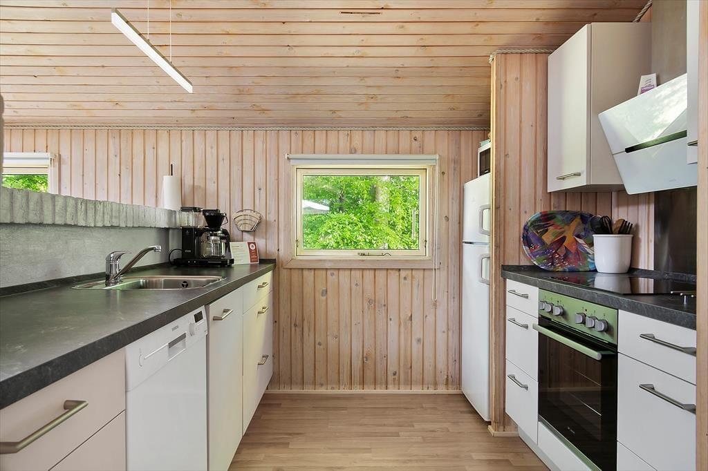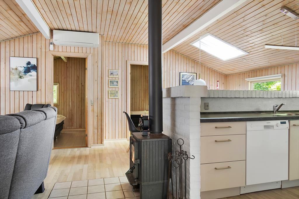 Det 99 m² store sommerhus er blevet renoveret i 2020, så de lyse rum fremstår pæne og velholdte. Det gælder for badeværelset, gæstetoilettet og de fire soveværelser, der i alt har sengepladser til otte personer – og selvfølgelig også den store stue, som er et skønt opholdsrum med brændeovn, åben køkkenafdeling og gennemstrømmende lysindfald. Her er der god plads til at slappe af og hygge sig sammen, og hvis I trænger til underholdning, er der mulighed for at se TV, høre musik og spille Nintendo. En anden skøn fornøjelse er at gå i sauna og benytte sig af spabadet, og begge dele kan lade sig gøre på det store badeværelse, der for øvrigt også er udstyret med vaskemaskine, tørretumbler og gulvvarme.
