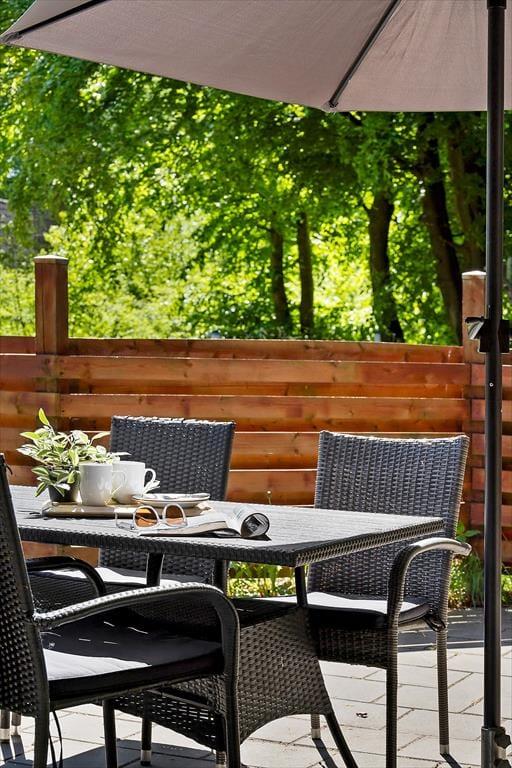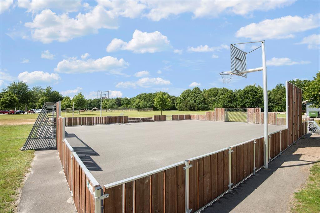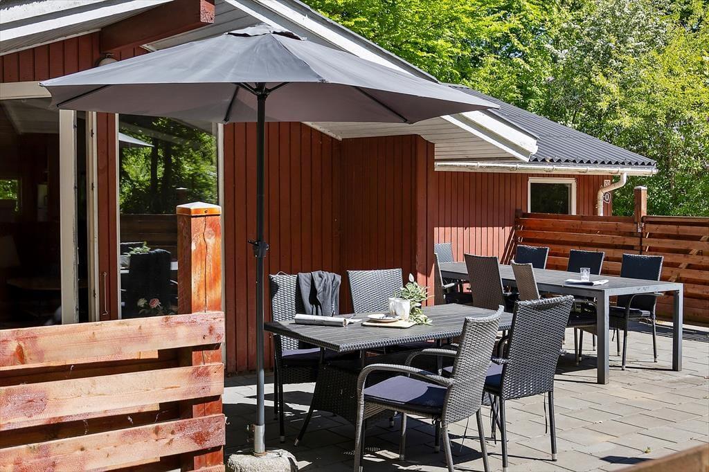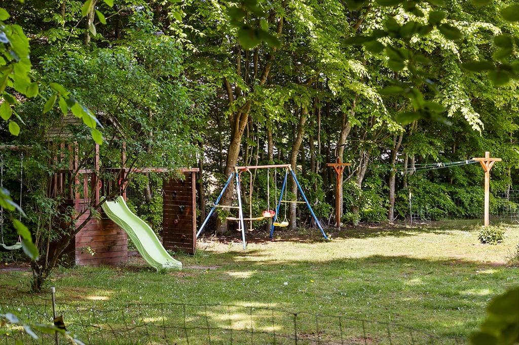 Huset ligger på en stor, lukket grund, der omkranses af løvtræer – og af hegn, hvilket er rart for både børnefamilier og hundeejere. Græsplænen indbyder til leg og boldspil, og der er legestativ og gynger til de yngste familiemedlemmer, mens den sydvendte, afskærmede terrasse er en hyggelig oase for både store og små.