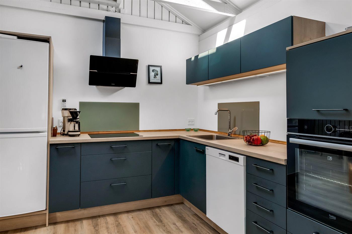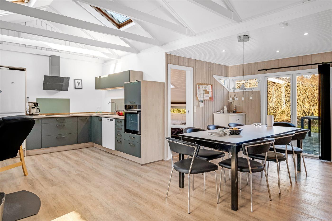 Køkkenet er udstyret med 1 køleskab. Der er 4 keramiske kogeplader, varmluftovn, mikrobølgeovn samt opvaskemaskine.
