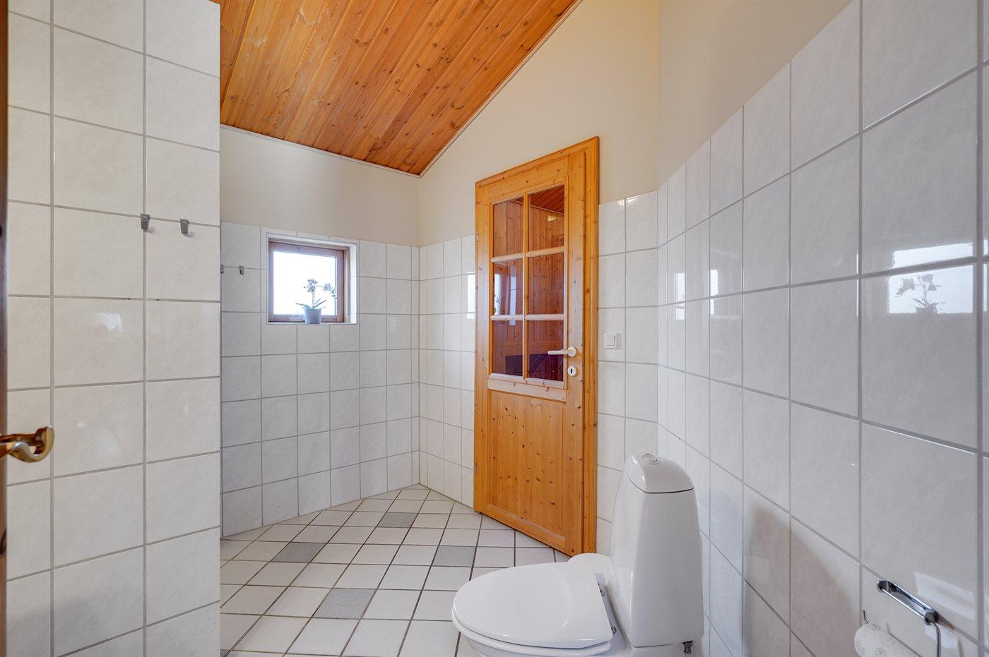 Der er 2 badeværelser med bruseniche og 2 toiletter. Der er gulvvarme på 2 badeværelser. I saunaen er der mulighed for afslapning.