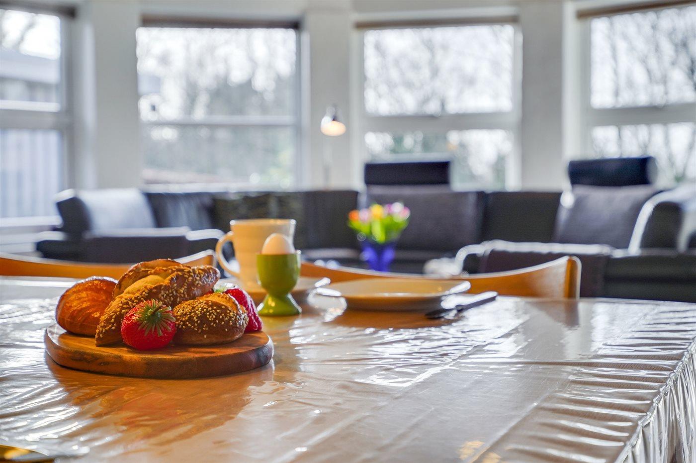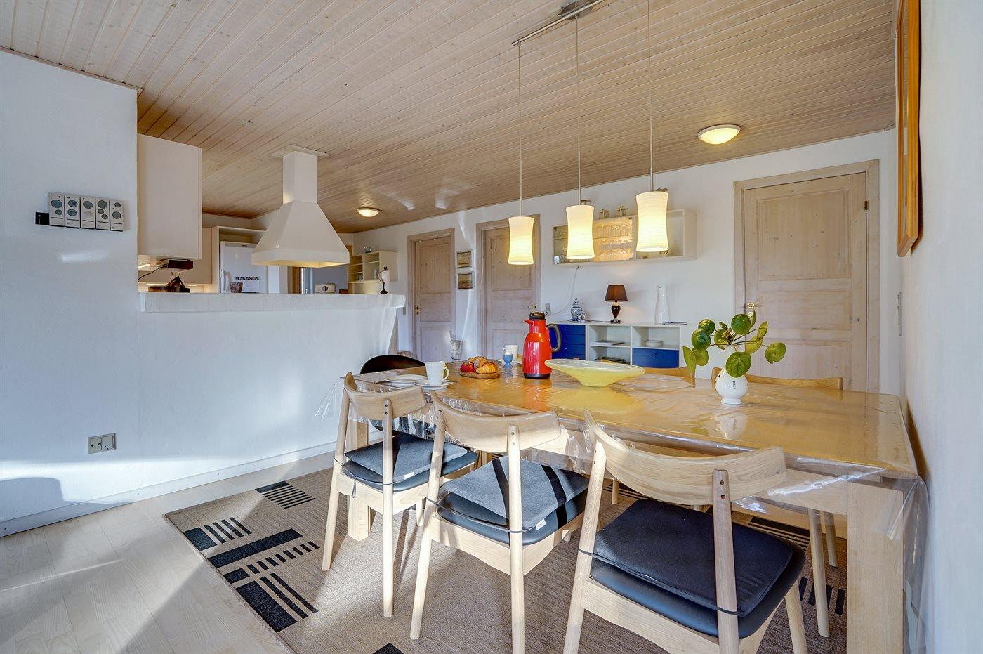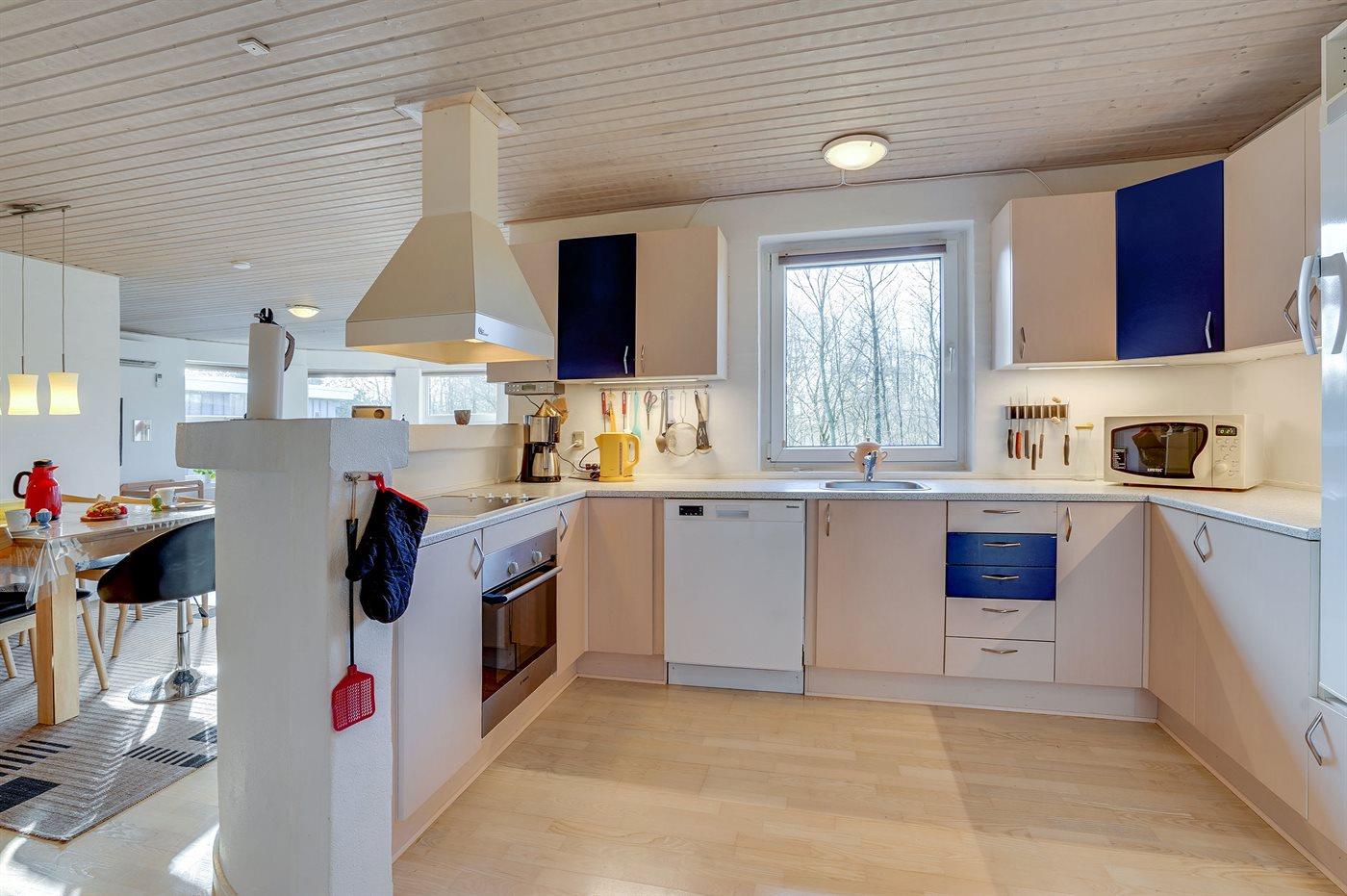 Køkkenet er udstyret med 1 køleskab. Der er 4 keramiske kogeplader, bageovn, mikrobølgeovn samt opvaskemaskine.