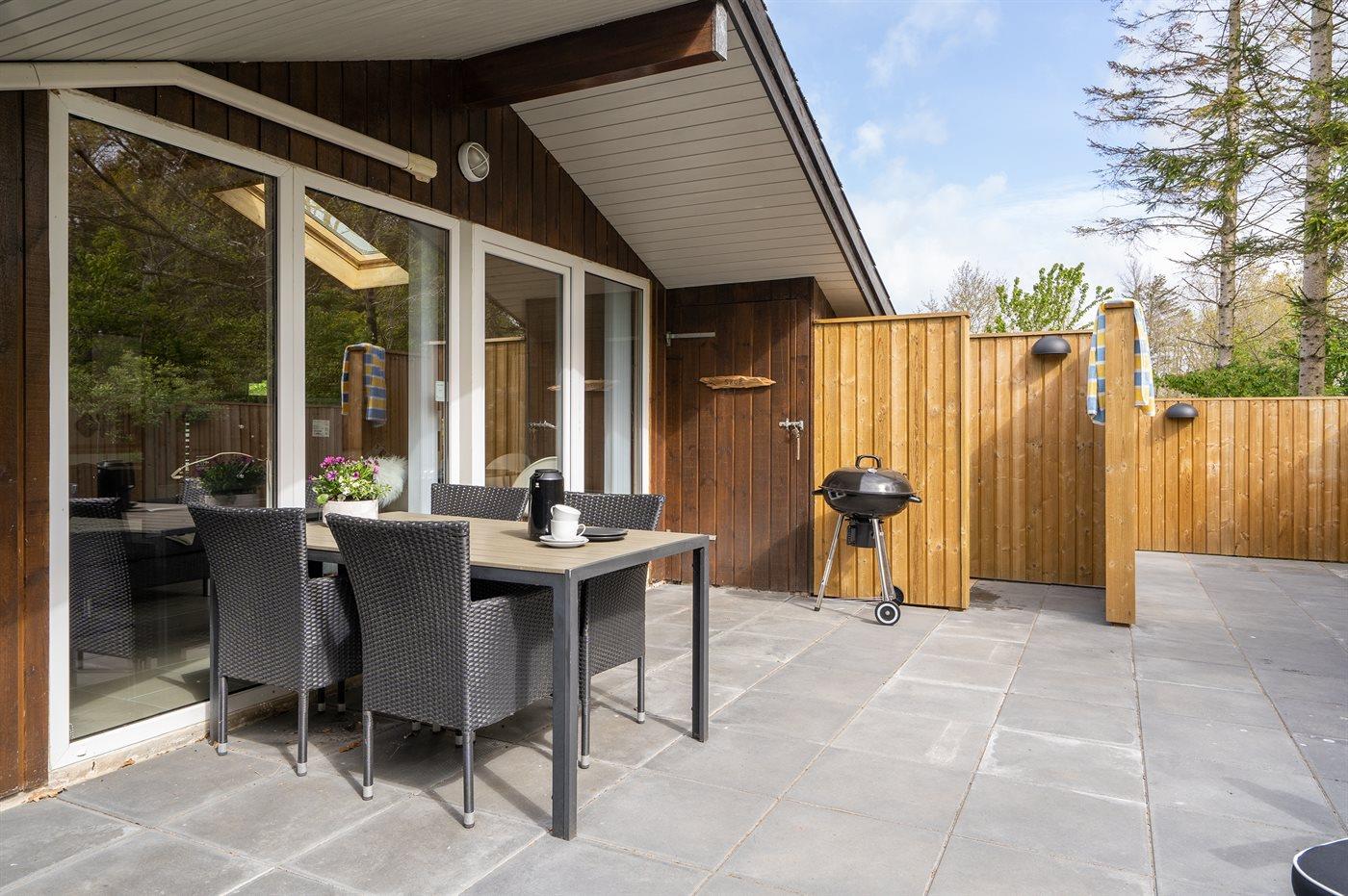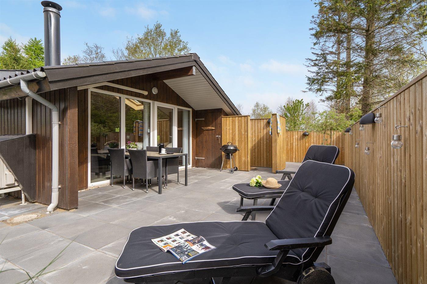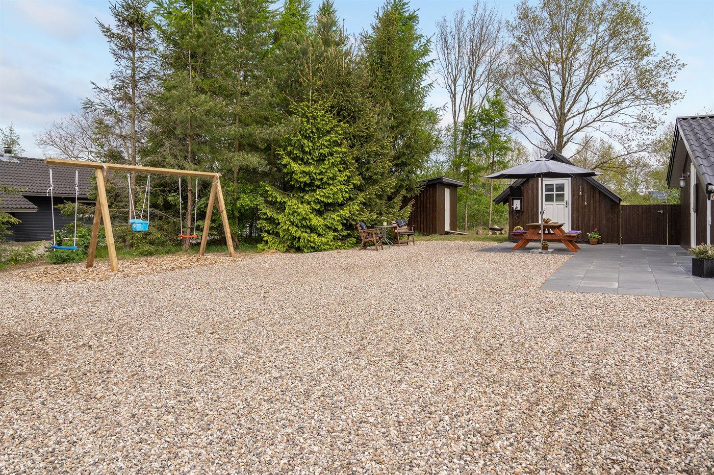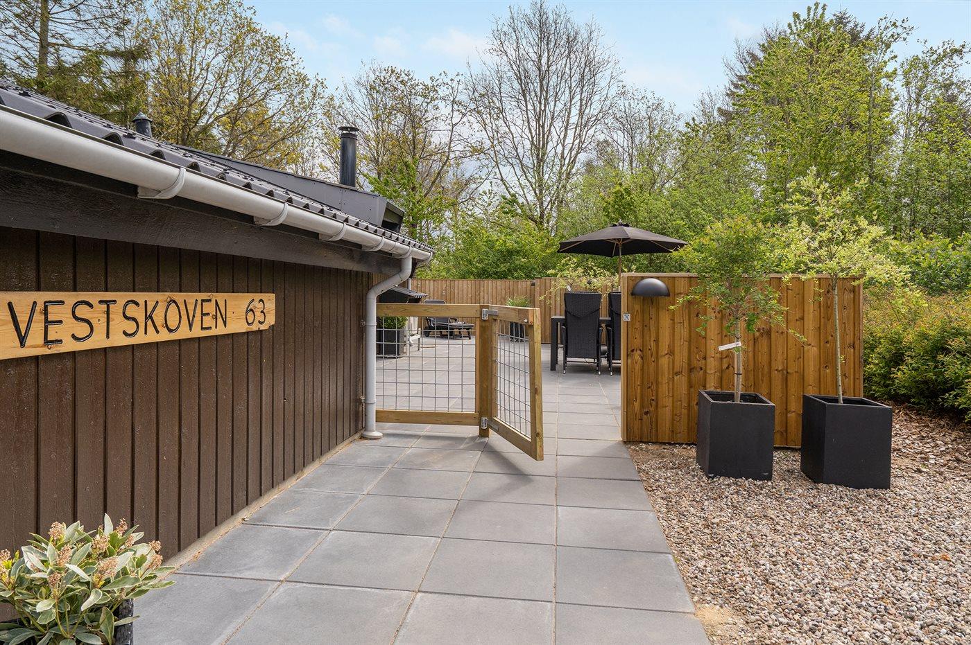 Ferieboligen er beliggende på en 860 m² stor havegrund. Der er 30000 m til havet. Der er 15000 m til Vadehavet. Nærmeste forretning er beliggende i en afstand af 1000 m. Til ferieboligen hører 140 m² terrasseareal. Desuden er der 8 m² overdækket terrasse. Heraf i alt 90 m² lukket terrasse. Gynge. Sandkasse. Udendørs bruser. Grill til rådighed. Der er installeret stik til opladning af elbil. Type 2 stik. Parkering ved ferieboligen.