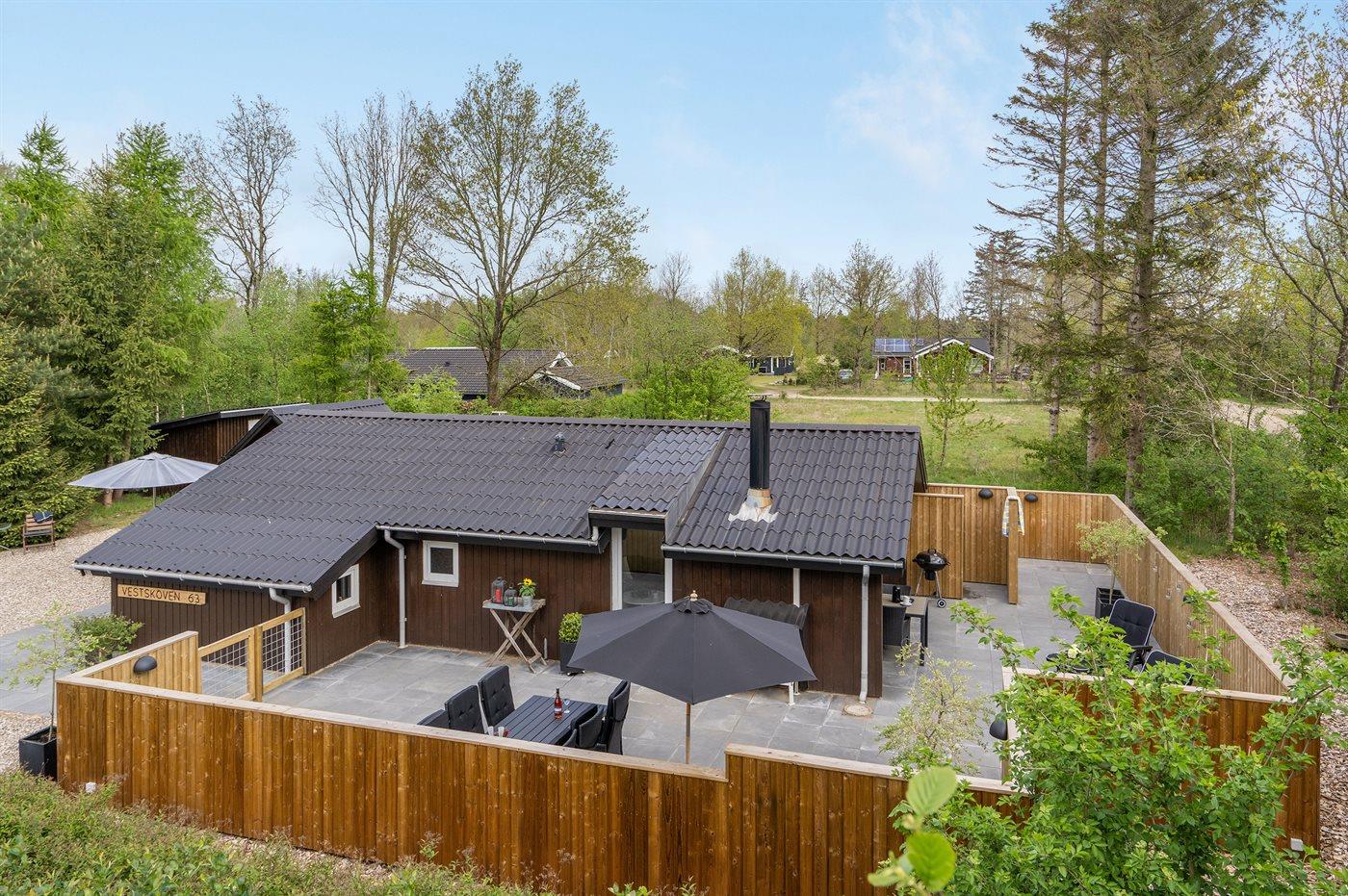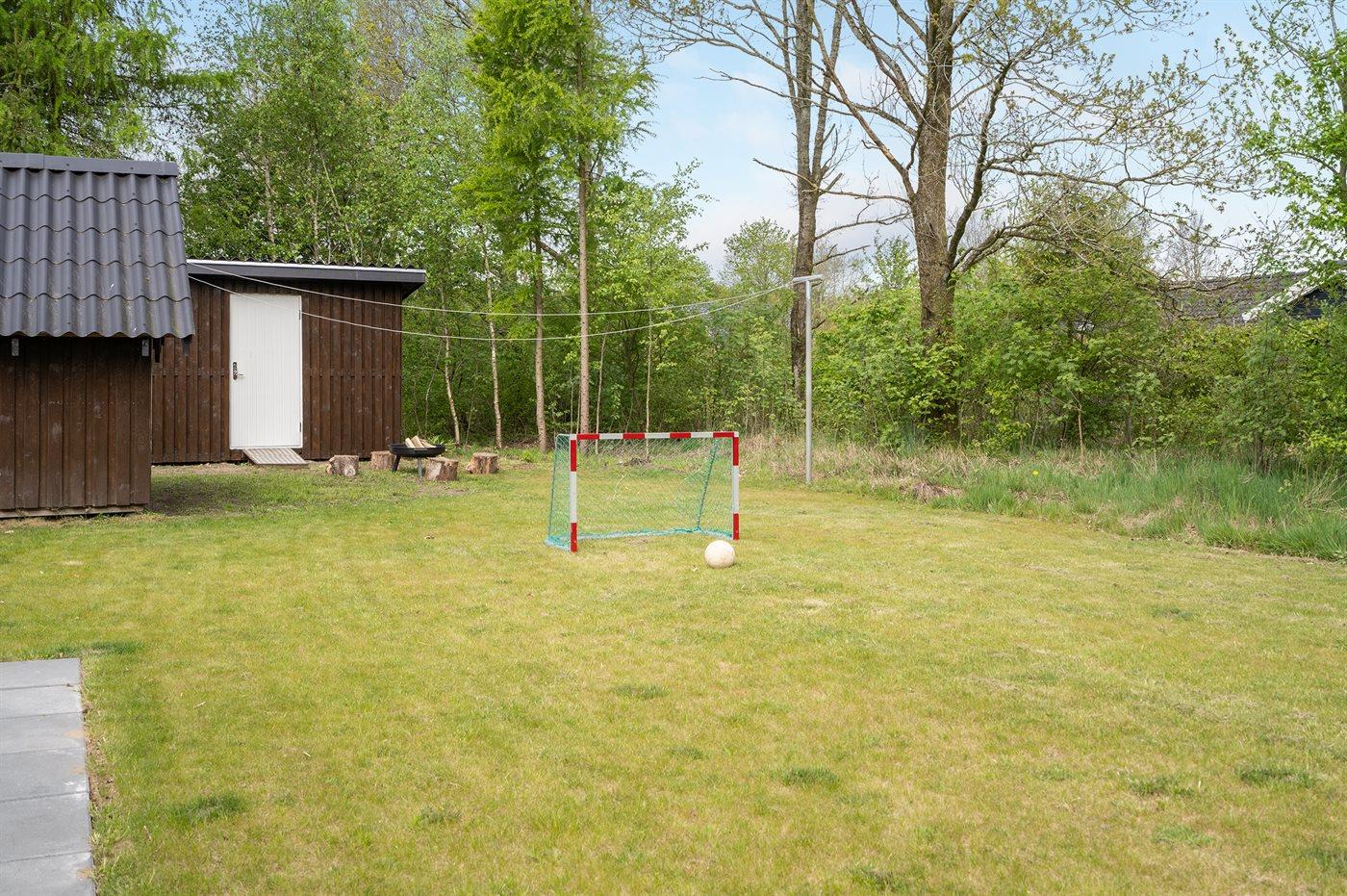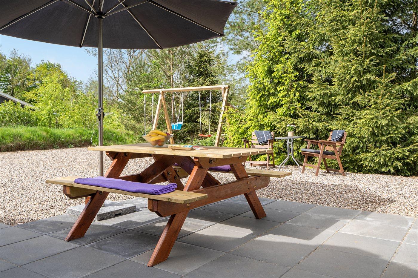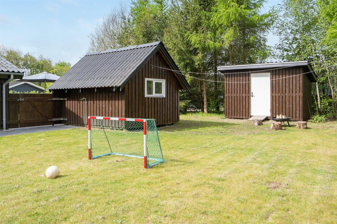 Ferieboligen er beliggende på en 860 m² stor havegrund. Der er 30000 m til havet. Der er 15000 m til Vadehavet. Nærmeste forretning er beliggende i en afstand af 1000 m. Til ferieboligen hører 140 m² terrasseareal. Desuden er der 8 m² overdækket terrasse. Heraf i alt 90 m² lukket terrasse. Gynge. Sandkasse. Udendørs bruser. Grill til rådighed. Der er installeret stik til opladning af elbil. Type 2 stik. Parkering ved ferieboligen.
