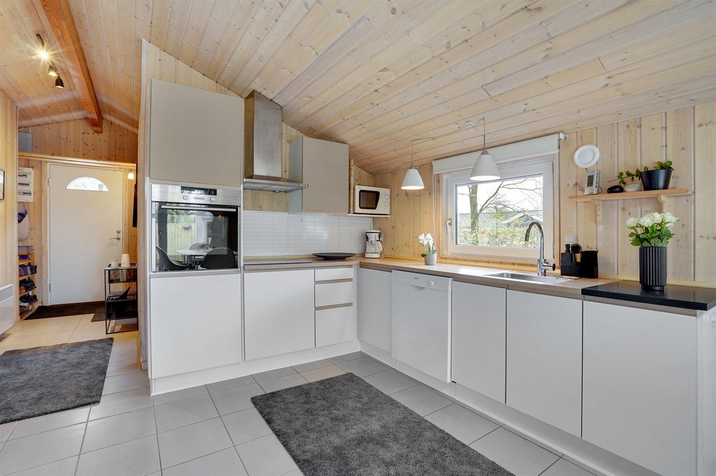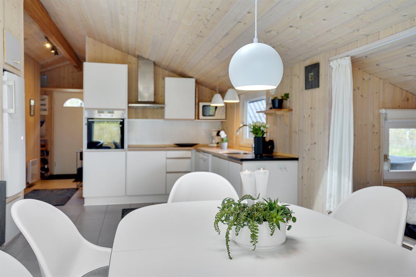 Køkkenet er udstyret med 1 køleskab. Der er 4 keramiske kogeplader, varmluftovn, mikrobølgeovn samt opvaskemaskine.