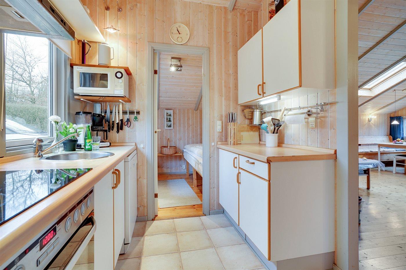 Køkkenet er udstyret med 1 køleskab. Der er 4 keramiske kogeplader, varmluftovn, mikrobølgeovn samt opvaskemaskine.