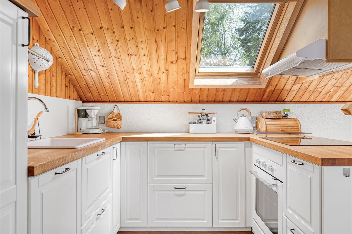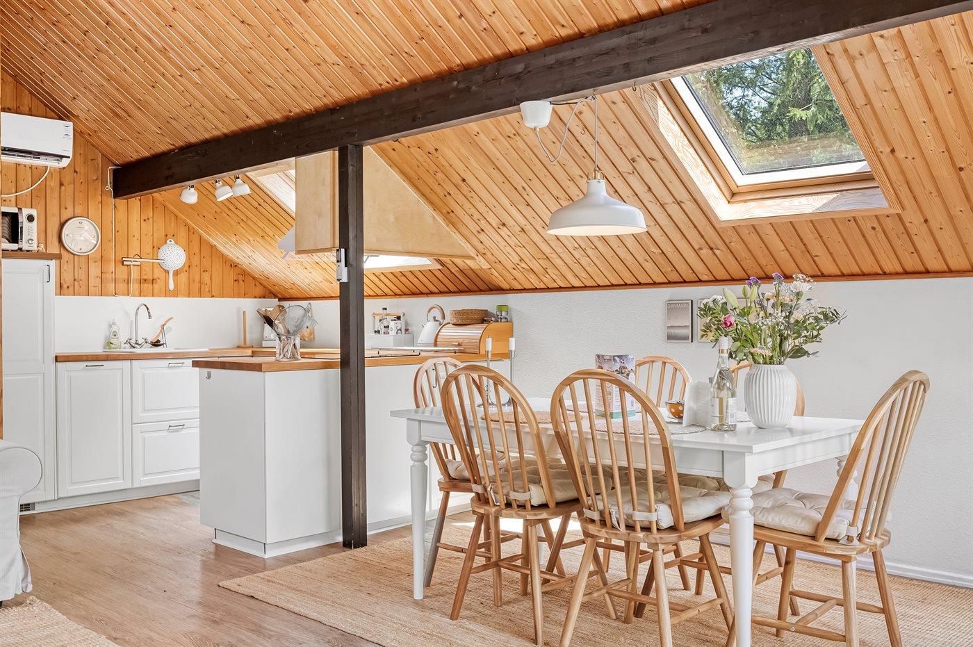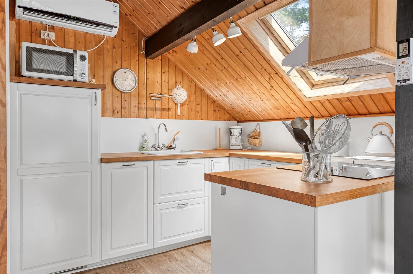 Køkkenet er udstyret med 1 køleskab. Der er 4 keramiske kogeplader, varmluftovn samt opvaskemaskine.
