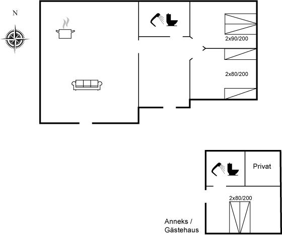 Der er i alt 3 soveværelser. Sovepladserne fordeler sig på: 4 sovepladser i dobbeltsenge. 2 sovepladser i enkeltsenge. 2 af disse sovepladser befinder sig i anneks. Derudover er der 1 stk. barneseng.