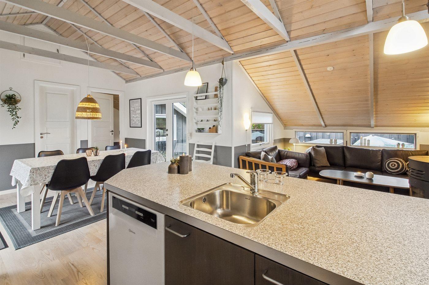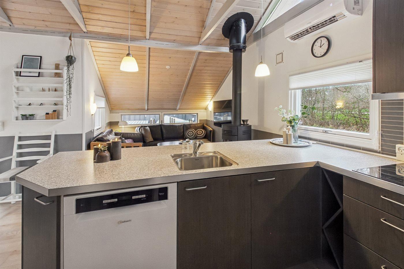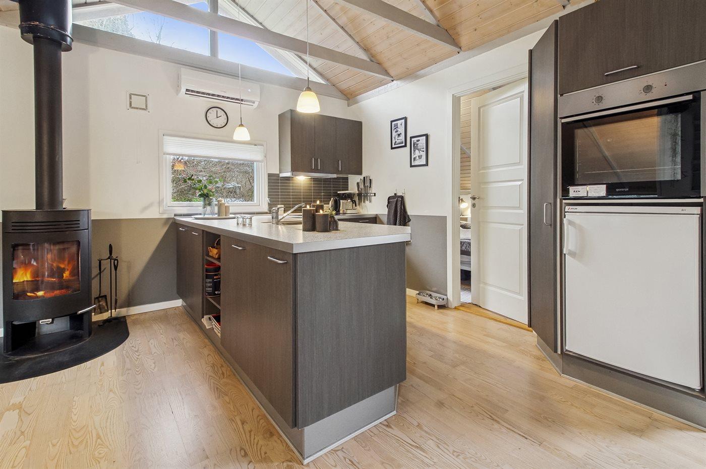 Køkkenet er udstyret med 1 køleskab. Der er 4 keramiske kogeplader, varmluftovn, mikrobølgeovn samt opvaskemaskine.