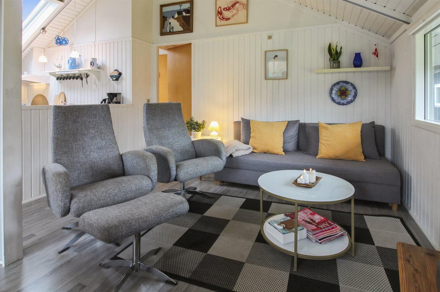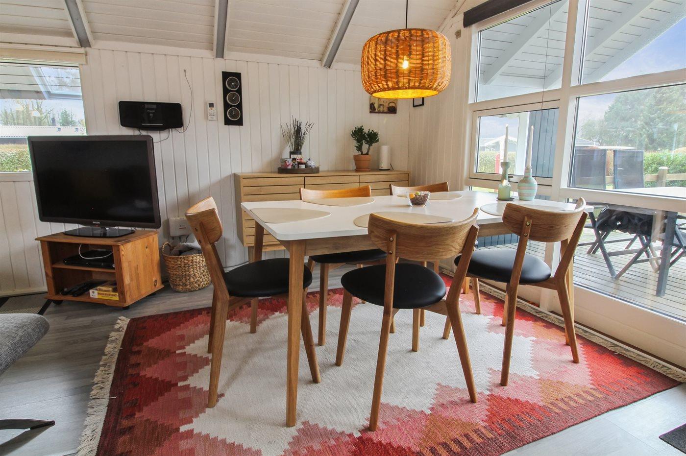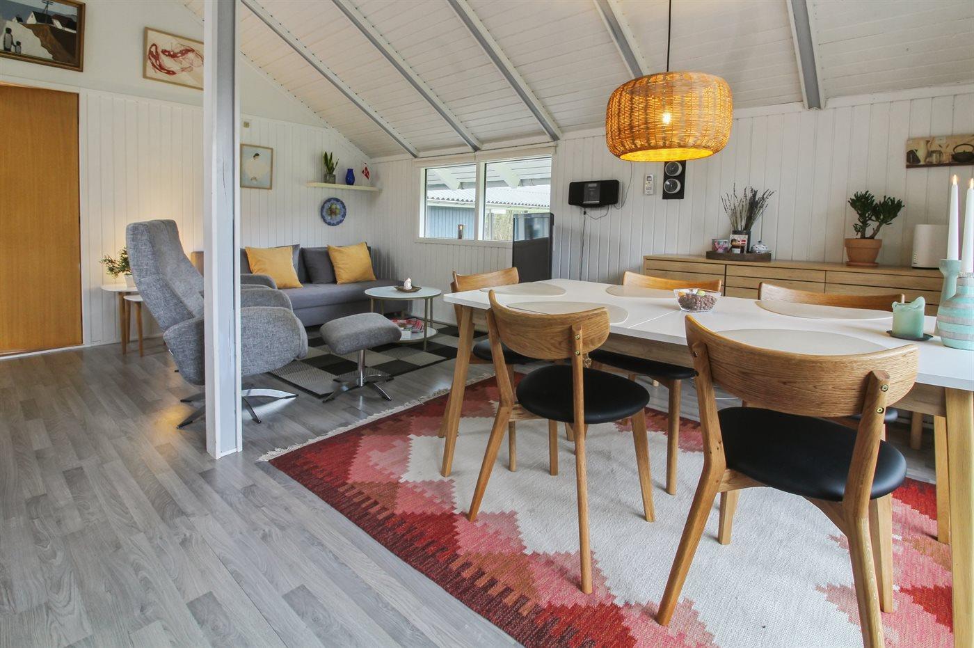 Dejligt sommerhus på lukket vej i feriebyen. Her er der et åbent stue-/køkkenmiljø med direkte udgang til den delvist overdækkede terrasse.