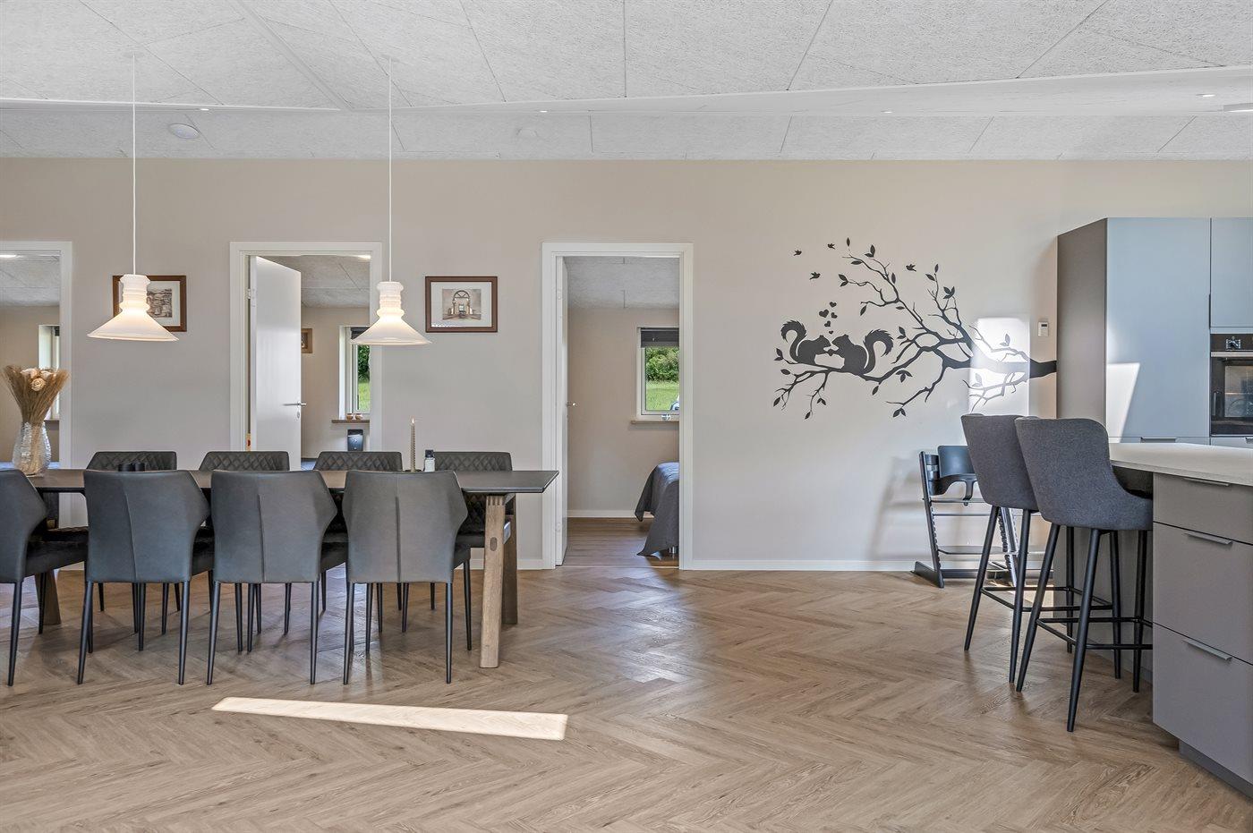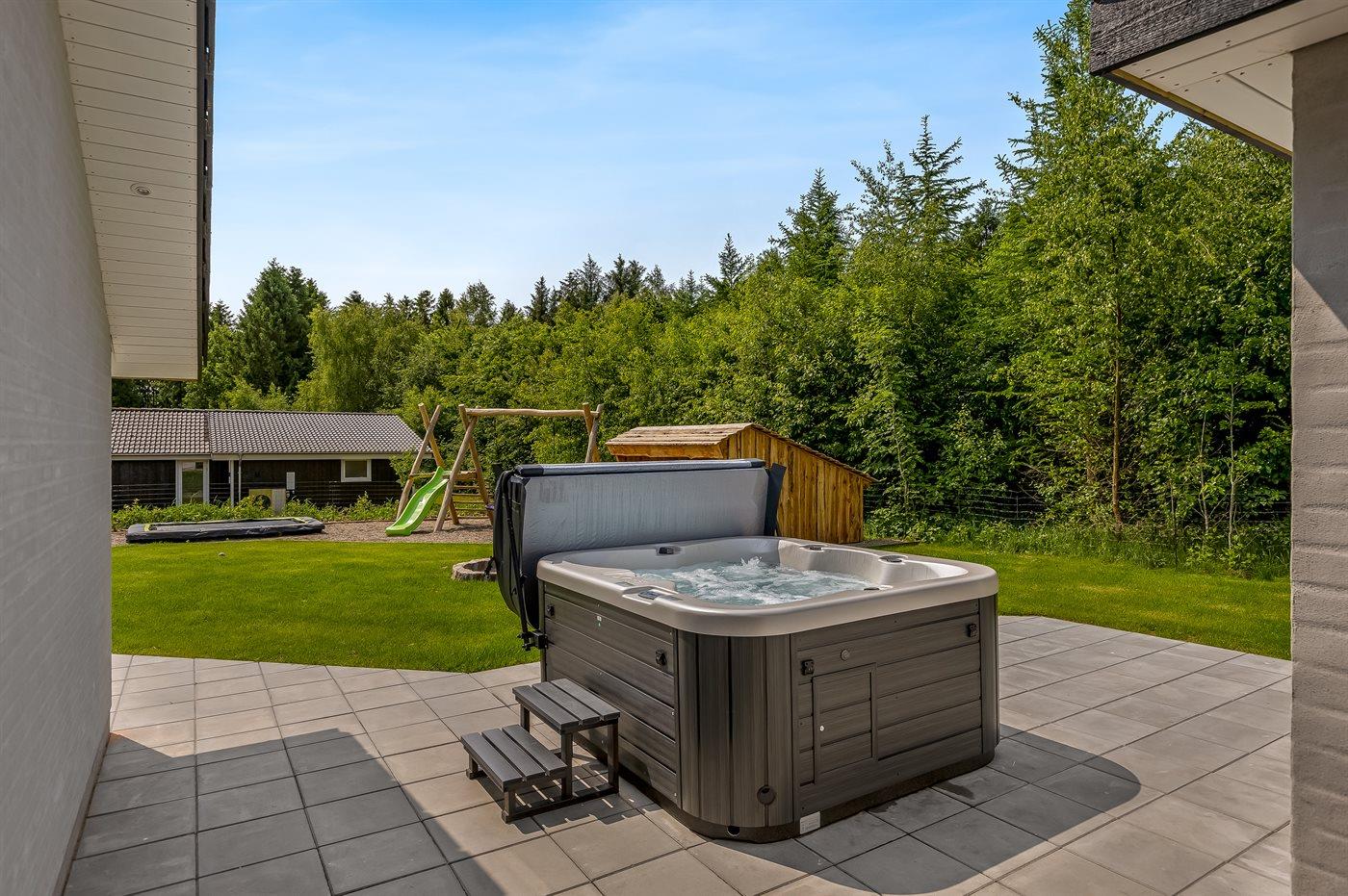 Super lækkert hus med god plads til 10 personer i de 5 soveværelser. Fra den dejlige opholdsstue er der direkte adgang til den store, delvist overdækkede terrasse, og på den vestvendte terrasse er der en skøn udespa til 5 personer samt en udesauna. Sommerhuset er velegnet til 2 familier, idet der er 2 soveafdelinger og 2 badeværelser.