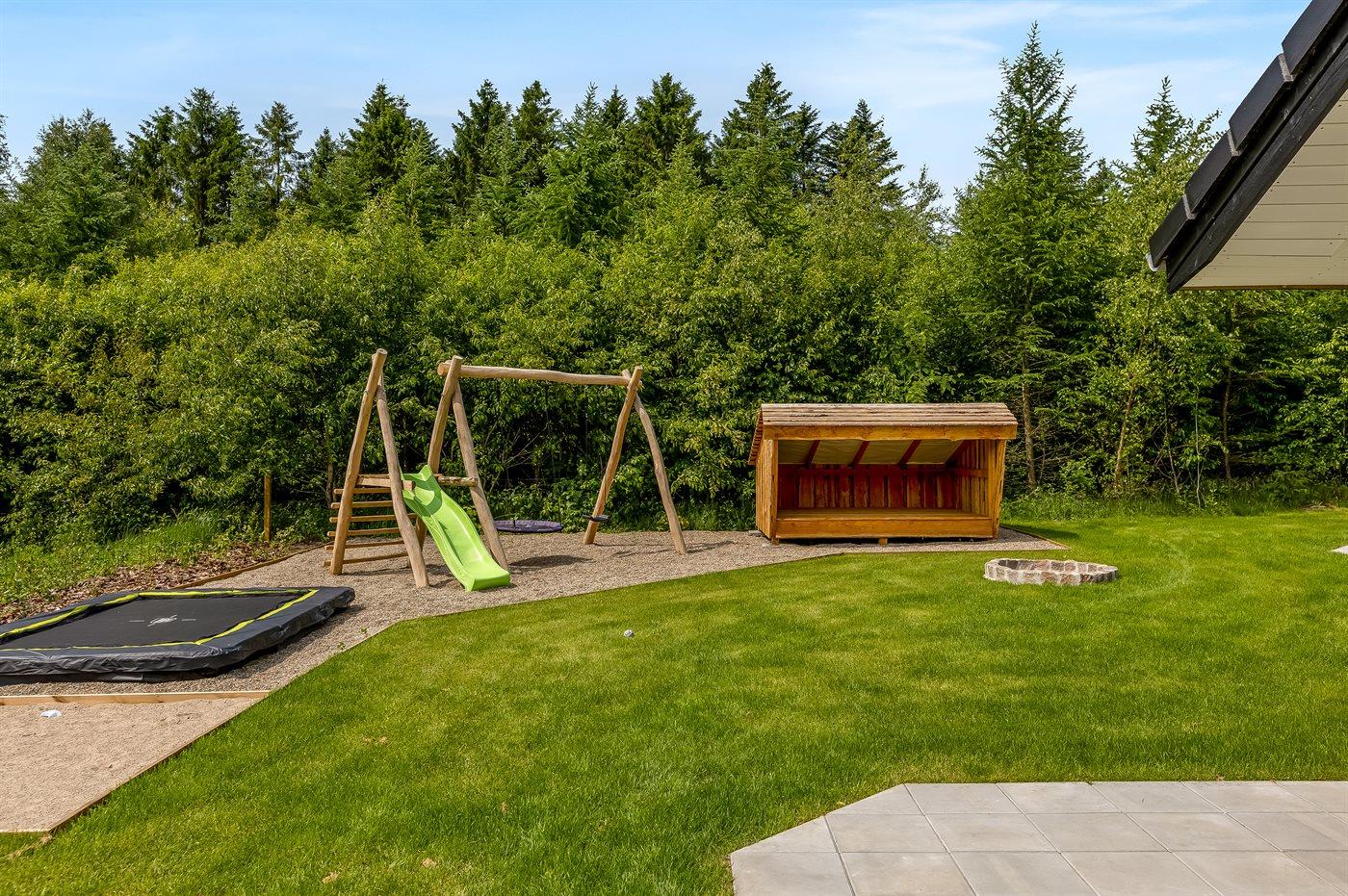 Ferieboligen er beliggende på en 872 m² stor naturgrund. Grunden er indhegnet. Der er 30000 m til havet. Der er 20000 m til Vadehavet. Der er en sø i en afstand af 700 m. Nærmeste forretning er beliggende i en afstand af 800 m. Der er en golfbane i en afstand af 1000 m. Til ferieboligen hører åbent terrasseareal. Desuden er der overdækket terrasse. Gynge. Sandkasse. Trampolin. Rutchebane. Fodboldmål. Der ligger en legeplads i en afstand af 700 m. Bålsted. Shelter. Udendørs sauna. Grill til rådighed. Der er installeret stik til opladning af elbil. Type 2 stik. Med 11 kW ladeeffekt. Parkering ved ferieboligen.