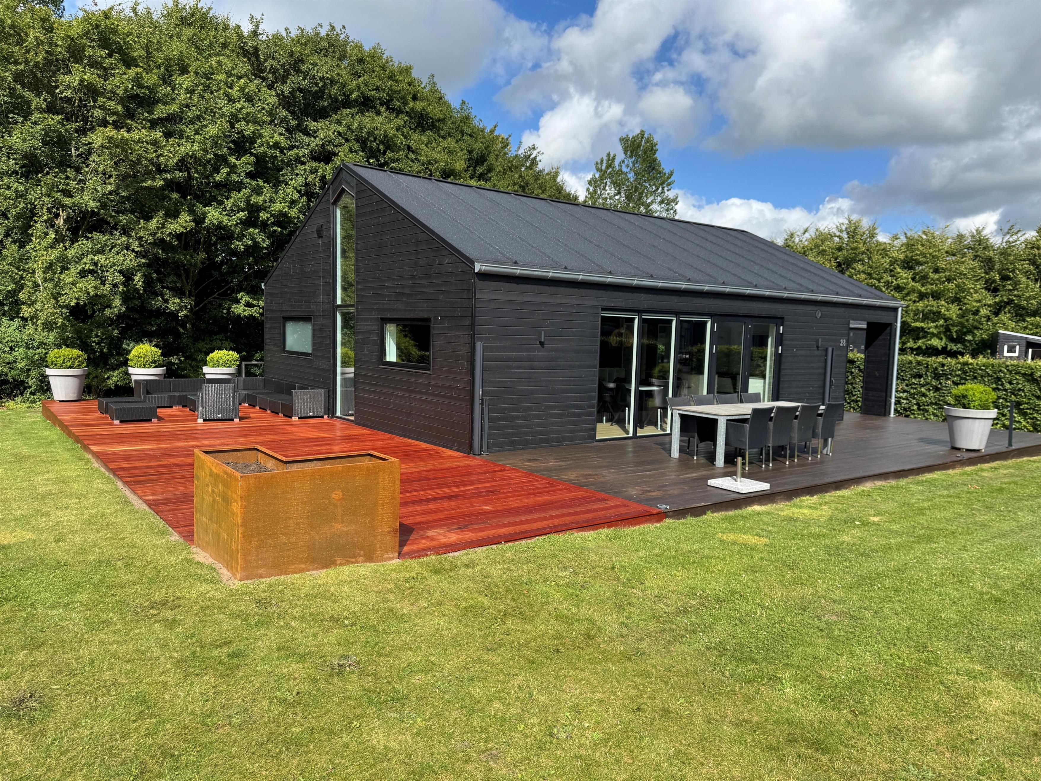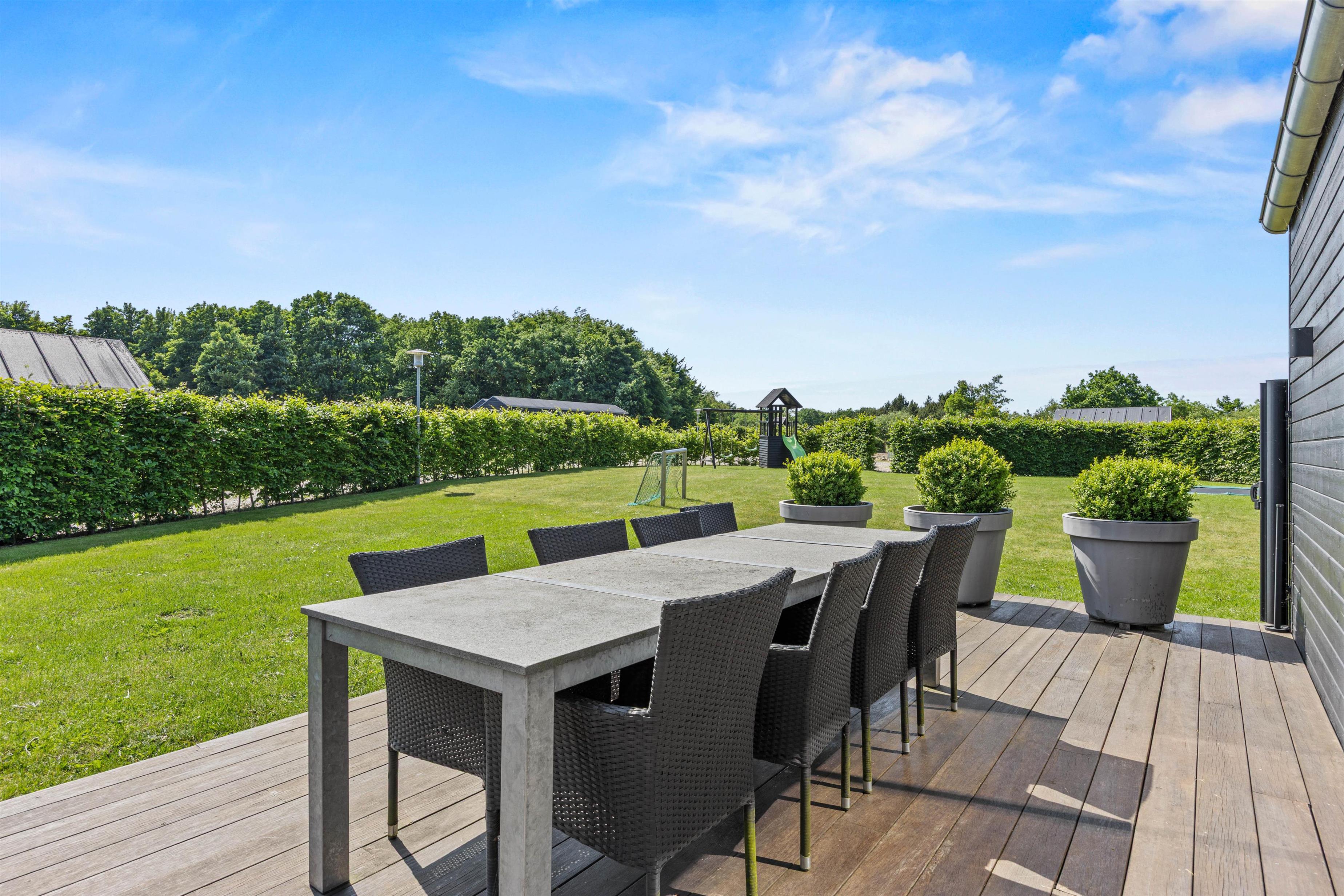 Efter dagens eventyr kan I trække jer tilbage til husets 2-personers standspa, hvor boblerne opløser hverdagens stress, og I kan nyde stilheden i eget tempo. Uderummet breder sig over en 800 m² plænegrund med både åben og afskærmet terrasse – ideel til solbadning på solvognene eller kaffe i skyggen under parasollen.
