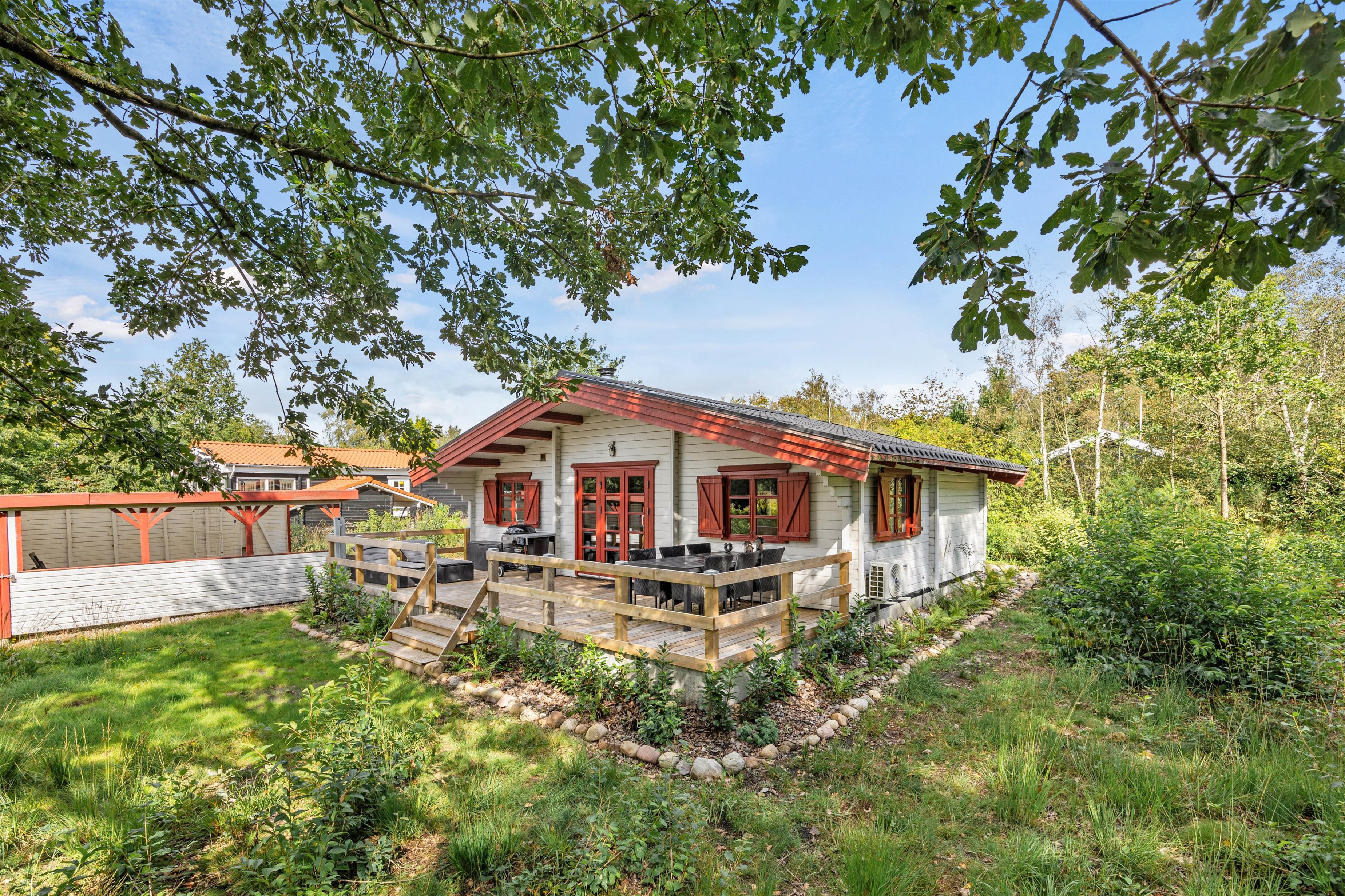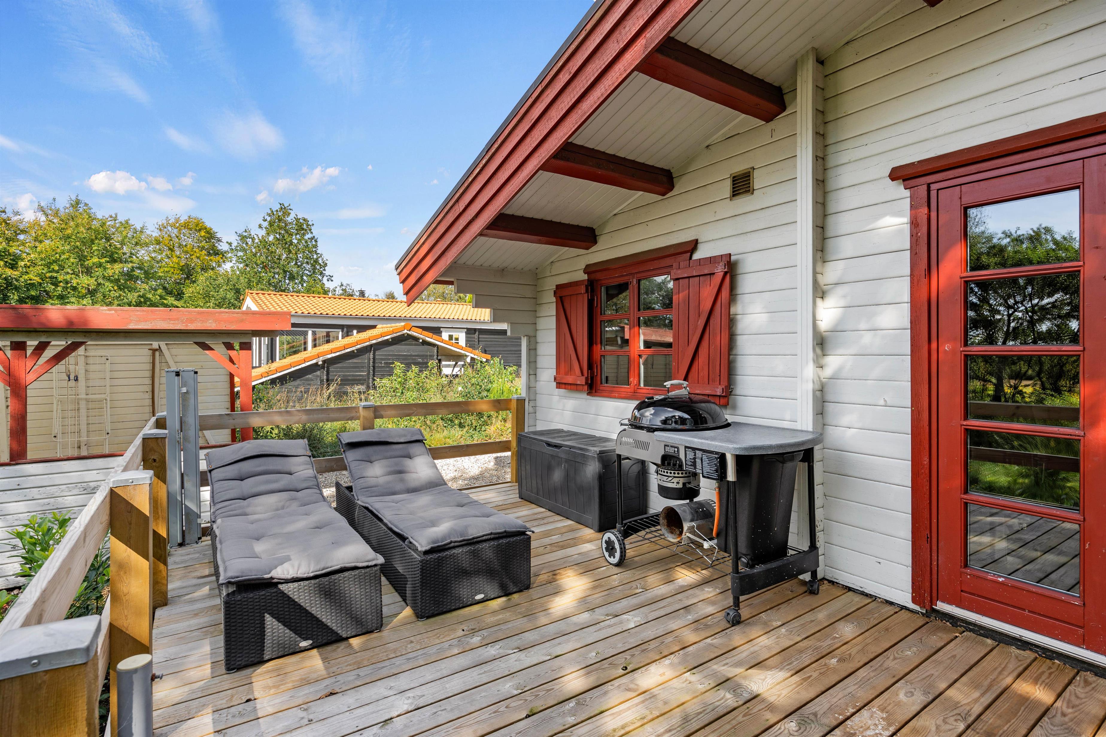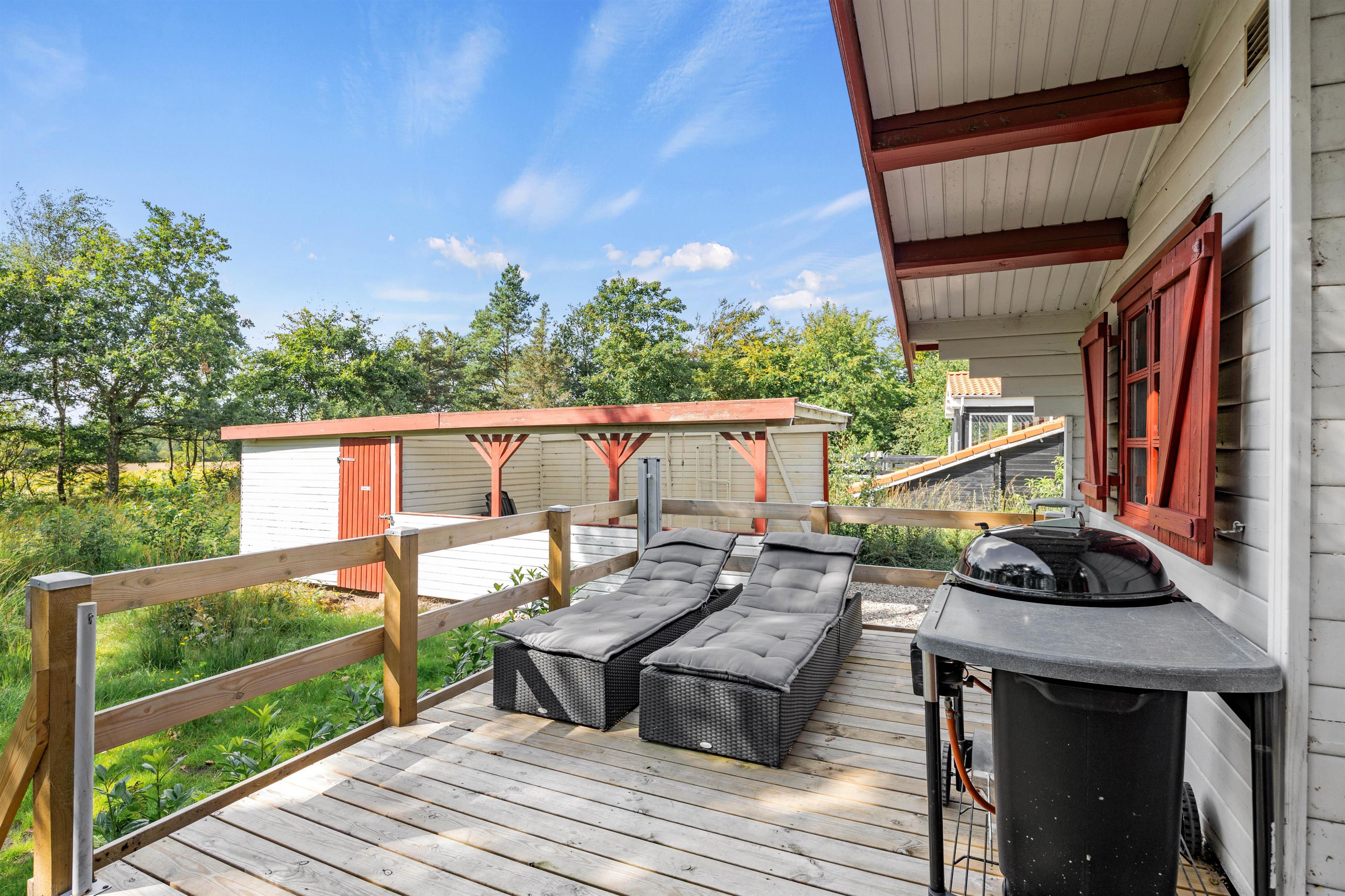 Den dejlige træterrasse fra 2022 inviterer til mange hyggelige timer i det frie. Her kan man nyde roen og den skønne natur hele dagen og afslutte en god feriedag med en grillaften. Til de små gæster findes der gynge og sandkasse på den børnevenlige grund.