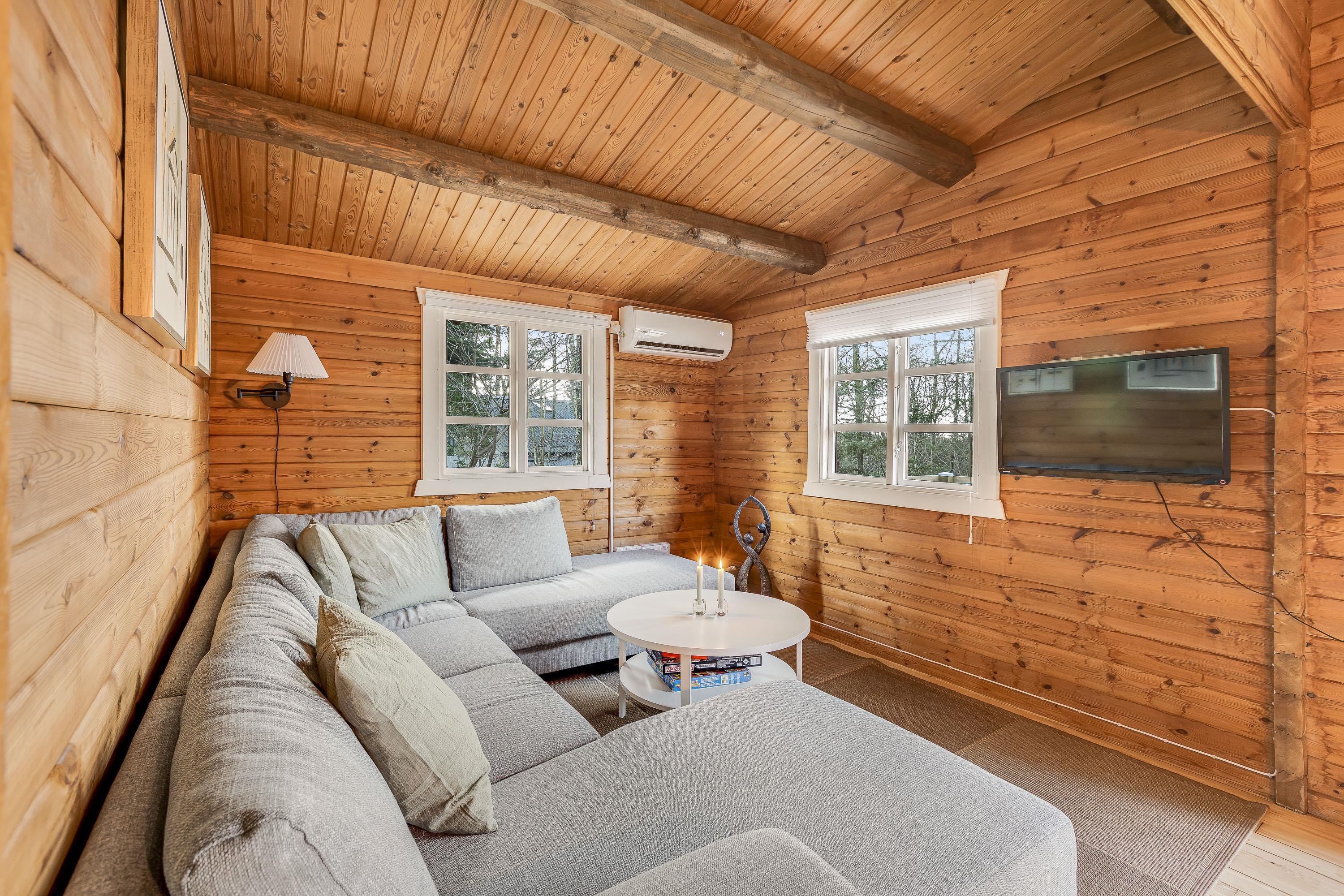 Træhuset er indrettet lyst og hyggeligt. I stuen findes der findes en brændeovn, som sørger for behagelig varme de kølige aftener. For energivenlig opvarmning findes der en varmepumpe, som holder varmeomkostninger ned.