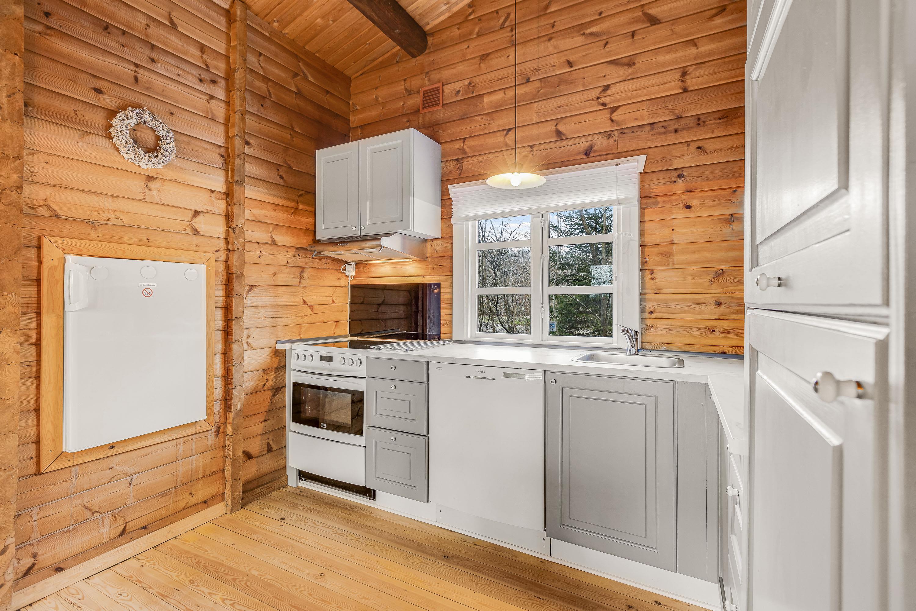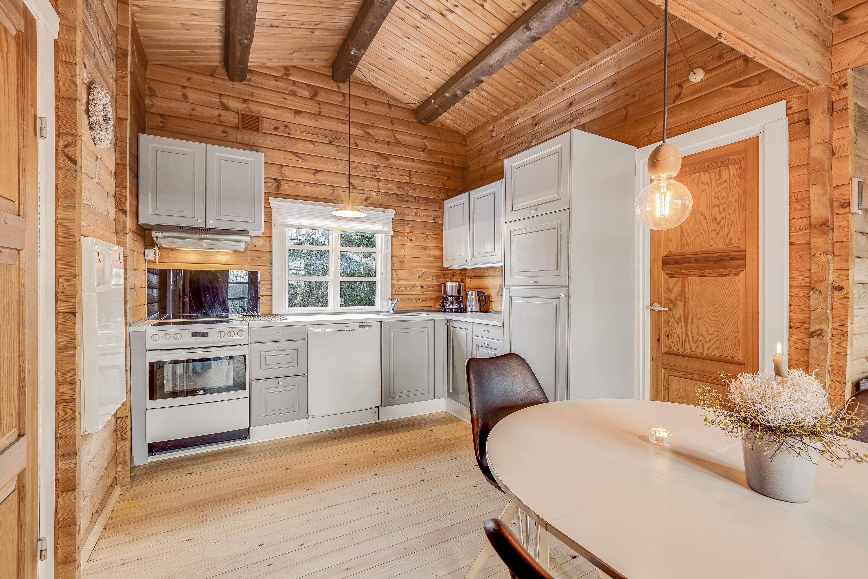 Køkkenet er udstyret med opvaskemaskine, mikroovn og en fryser (60L) og ligger i åben forbindelse med spisestuen og stuen.