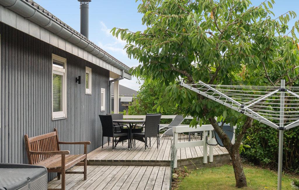 Hyggeligt træhus nær vandet i Juelsminde med terrasse, have og moderne faciliteter for en afslappende ferie.