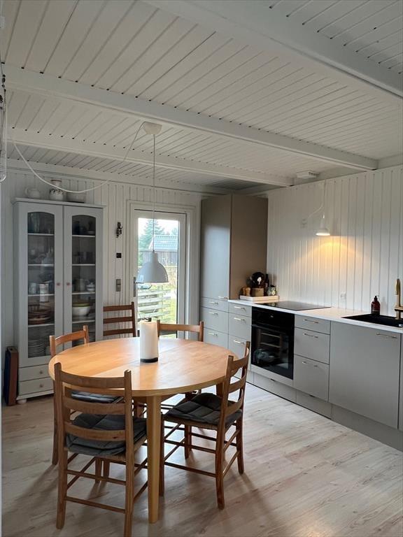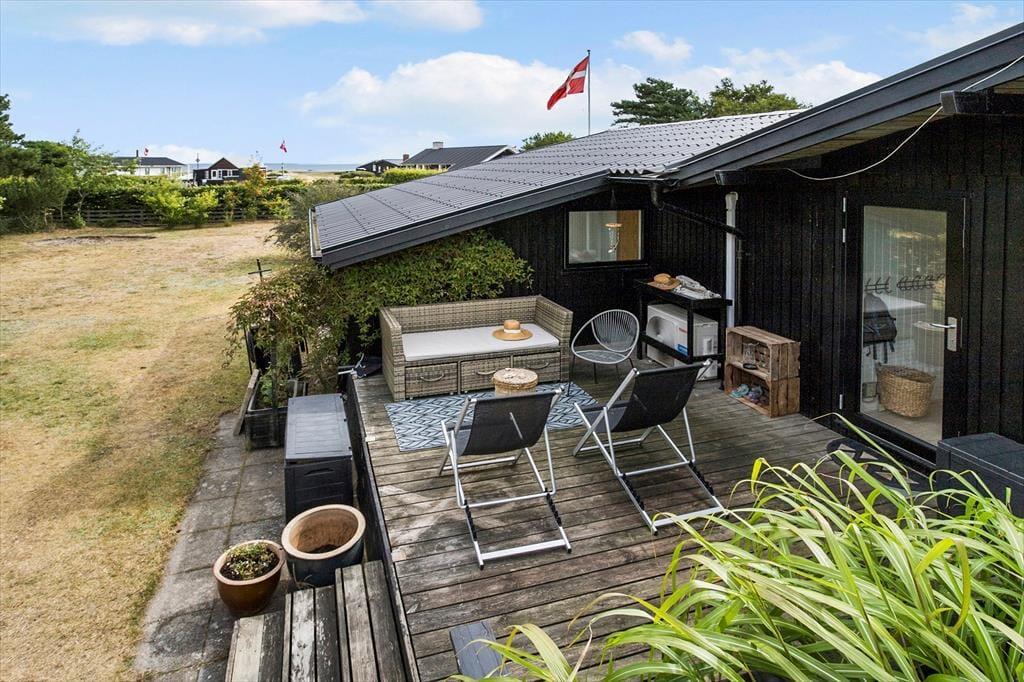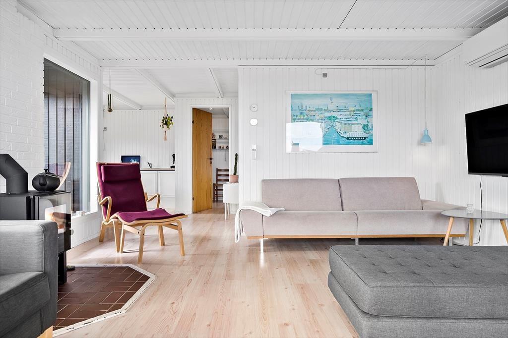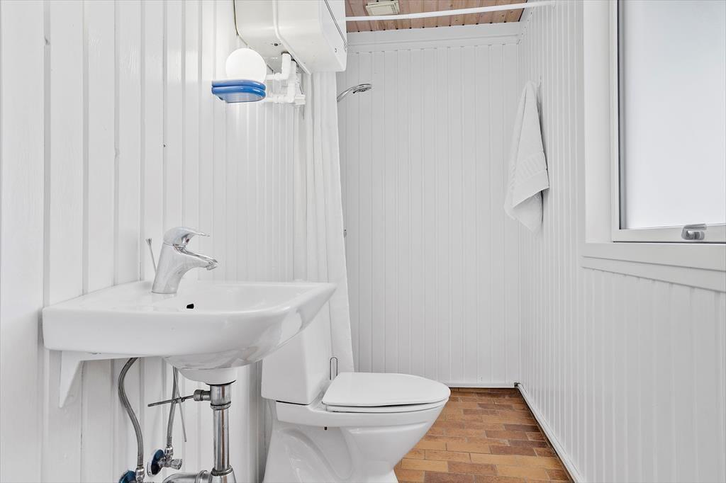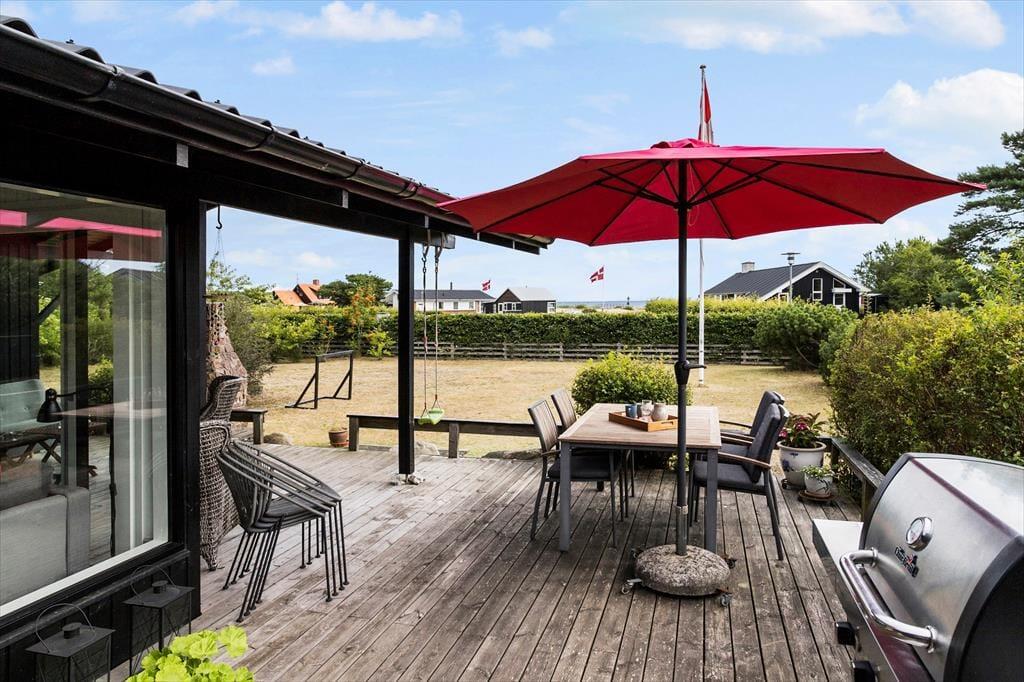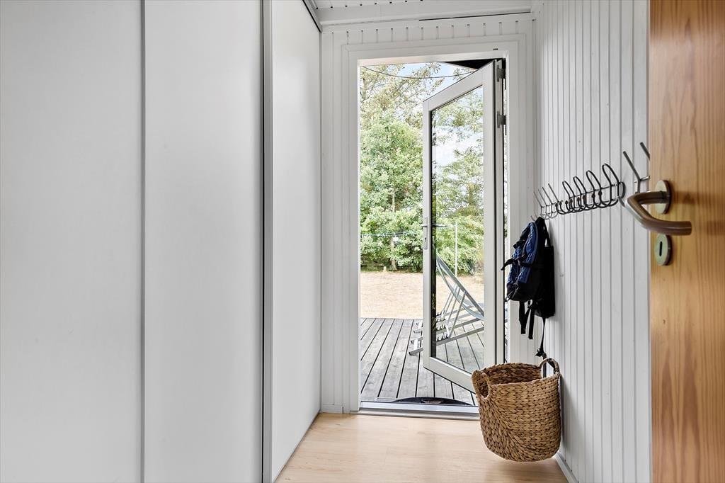Indendørs: Et superhyggeligt sommerhus, hvor der emmer at feriestemning både ude og inde. Ferieroen falder for alvor på, når du træder ind i det charmerende køkken gennem stalddøren. Du begynder straks at glæde dig til at lave mad og hyggesnakke over opvasken, alt imens andre i familien sidder ved spisebordet og spiller et spil eller gætter en kryds og tværs. Fra køkken går du videre til stue med brændeovn og sovesofa samt udgang til den skønneste terrasse, hvorfra der er skøn udsigt ned over haven og over området til havet. 2 fine soveværelser, entre samt badeværelse med bruser. I skur er der vaskemaskine.