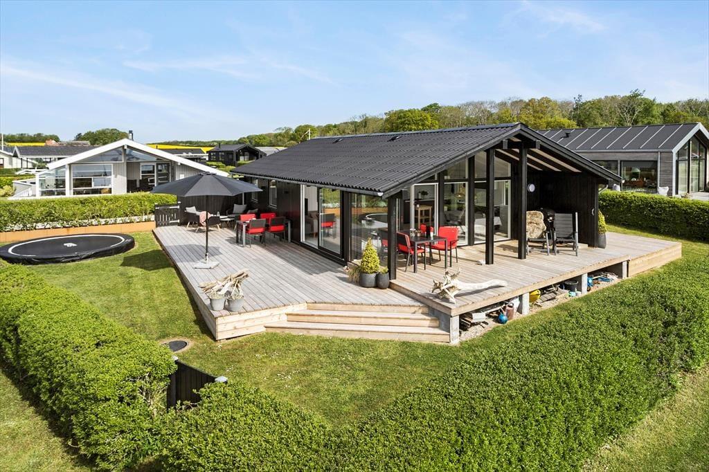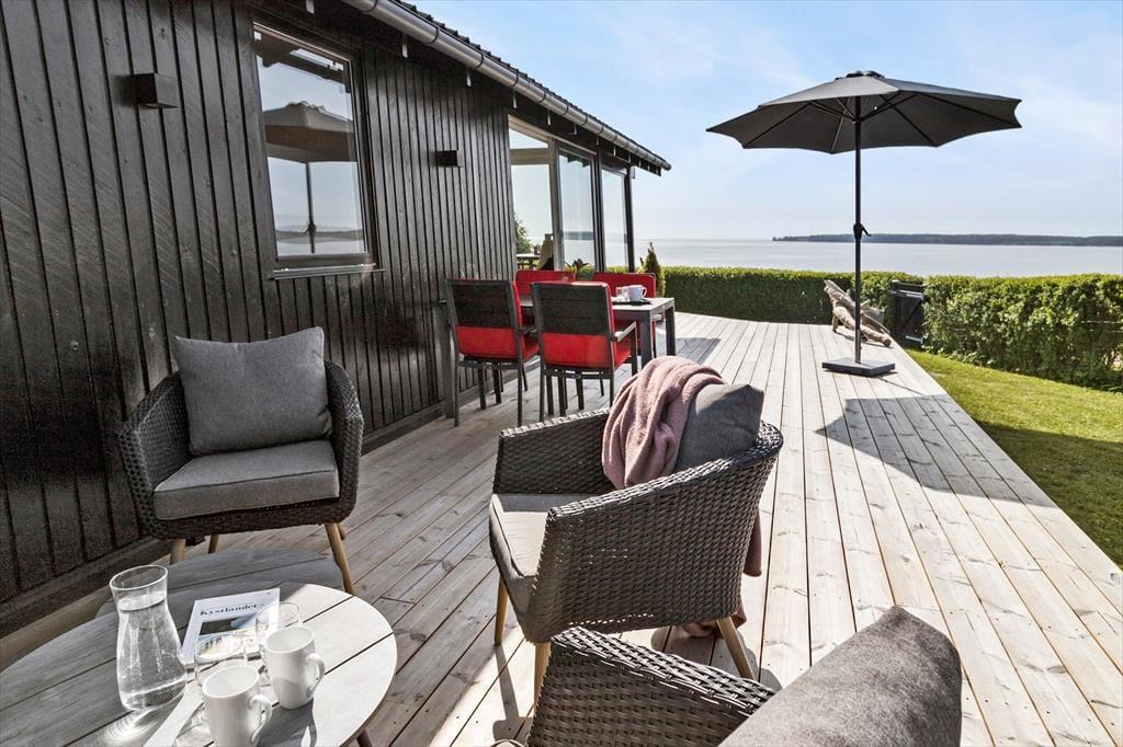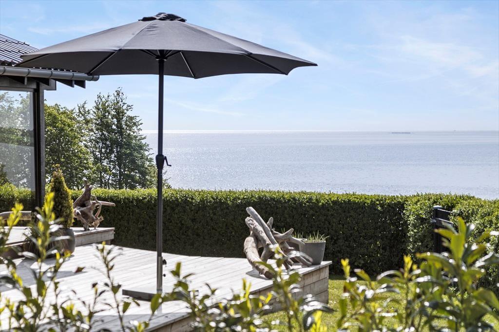 Vi kommer ikke uden om at der i og omkring huset er fokus på beliggenheden og den flotte havudsigt. Her er begrænset med have og græsplæne, men her er til gængæld dejlig stor træterrasse med dejlige havemøbler, liggestole, parasol og Weber gasgrill, hvor i kan tilberede dagens måltider i mens børnene lege på huset stor trampolin i haven.