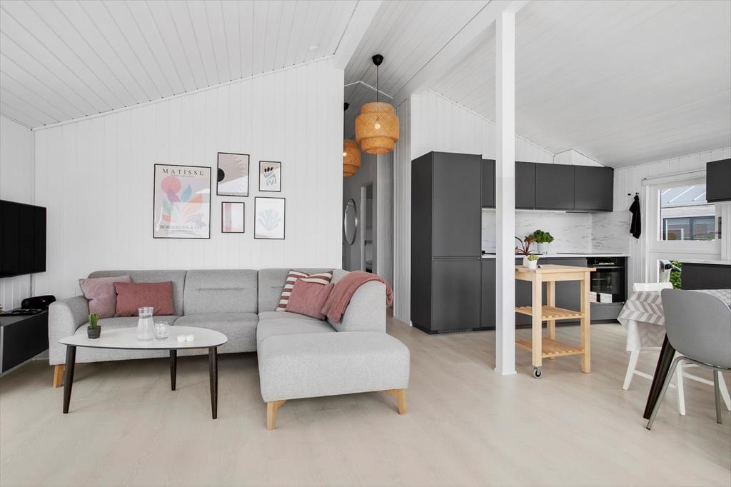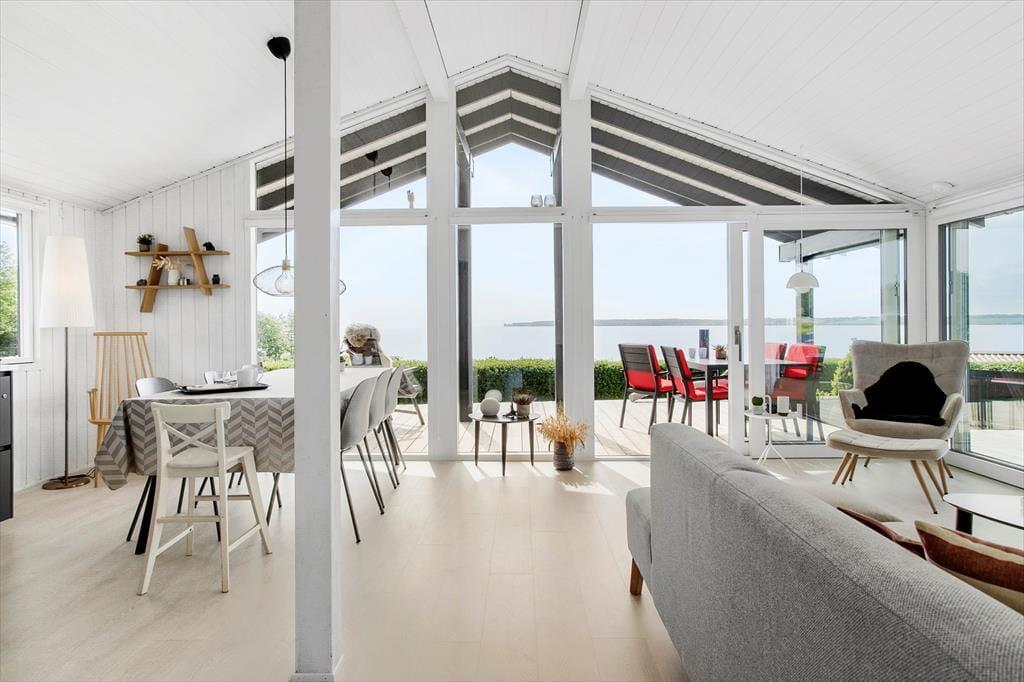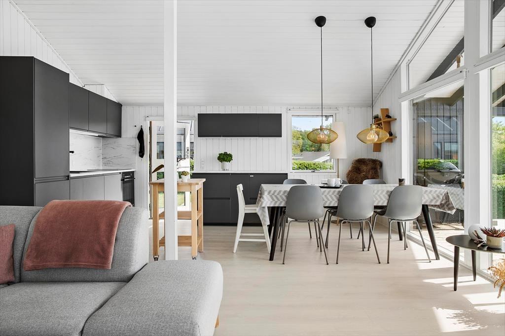 Huset er total renoveret i 2021 og fremstår lyst og venligt med en hyggelig sommerhusstil. Husets hjerte er stue/køkken/alrum, hvor panorama havudsigten kan nydes fra alle de store vinduer. Det moderne køkken indeholder alt, hvad I har brug for under jeres ophold, samt en spiseplads med flot havudsigt og plads til hele familien.