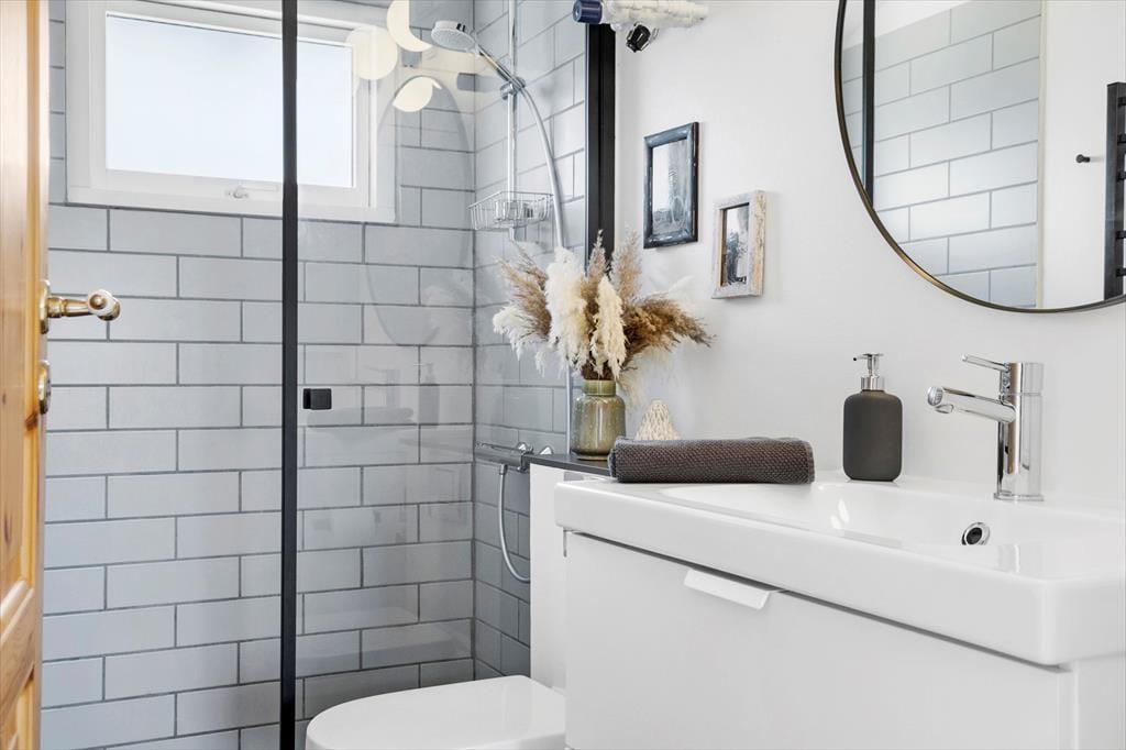 Badeværelset har gulvvarme og der er brus og toilet. Husets bryggers har desuden vaskemaskine og tørretumbler.
