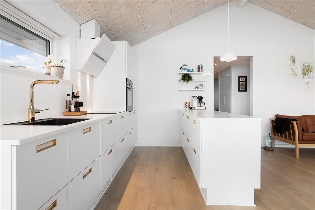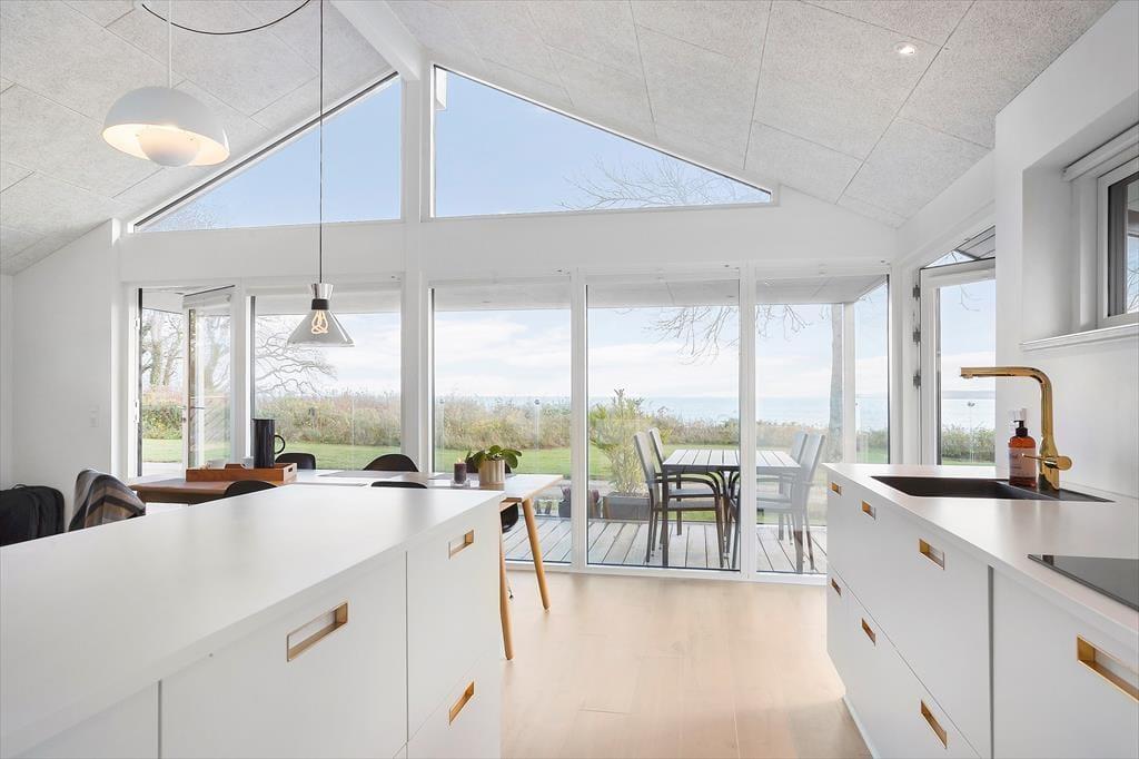 Med kun 30 meter til stranden bliver det svært ikke at sidde mange timer i det lyse køkken/alrum og nyde udsigten. Dette dejlige rum er husets hjerte, hvor I kan samles og hygge jer om madlavning, spille spil eller slappe af i sofaen. Som resten af huset er køkkenet lyst og meget stilrent indrettet. Her er alt hvad du skal bruge til at lave mad, og god plads til at sidde omkring spisebordet, hvorfra udsigten kan nydes gennem de store vinduer mod havet.