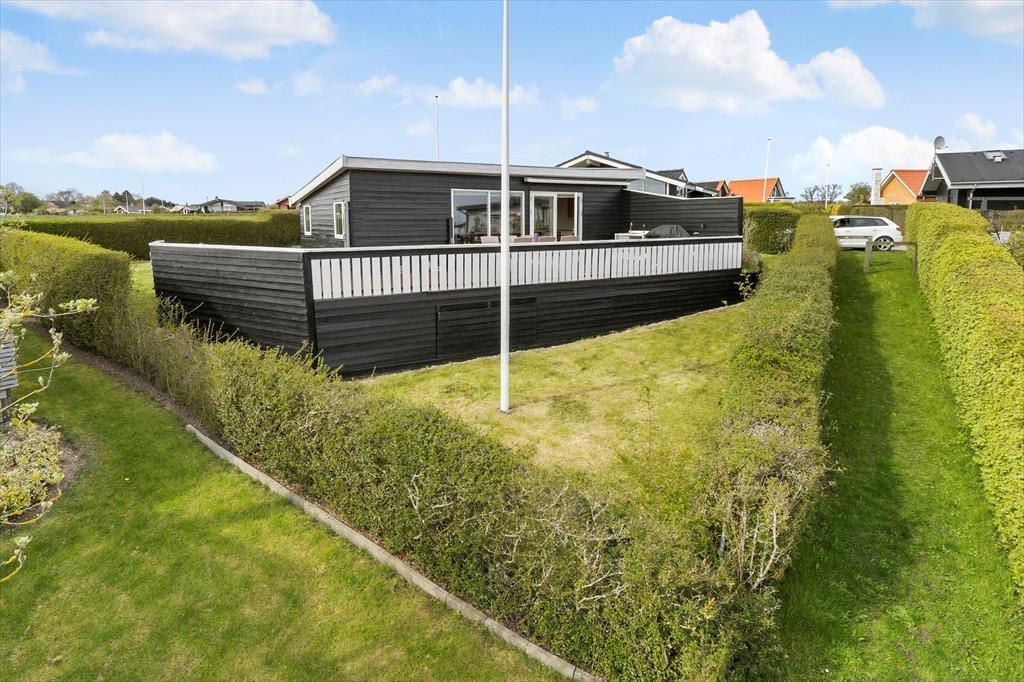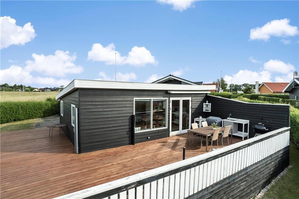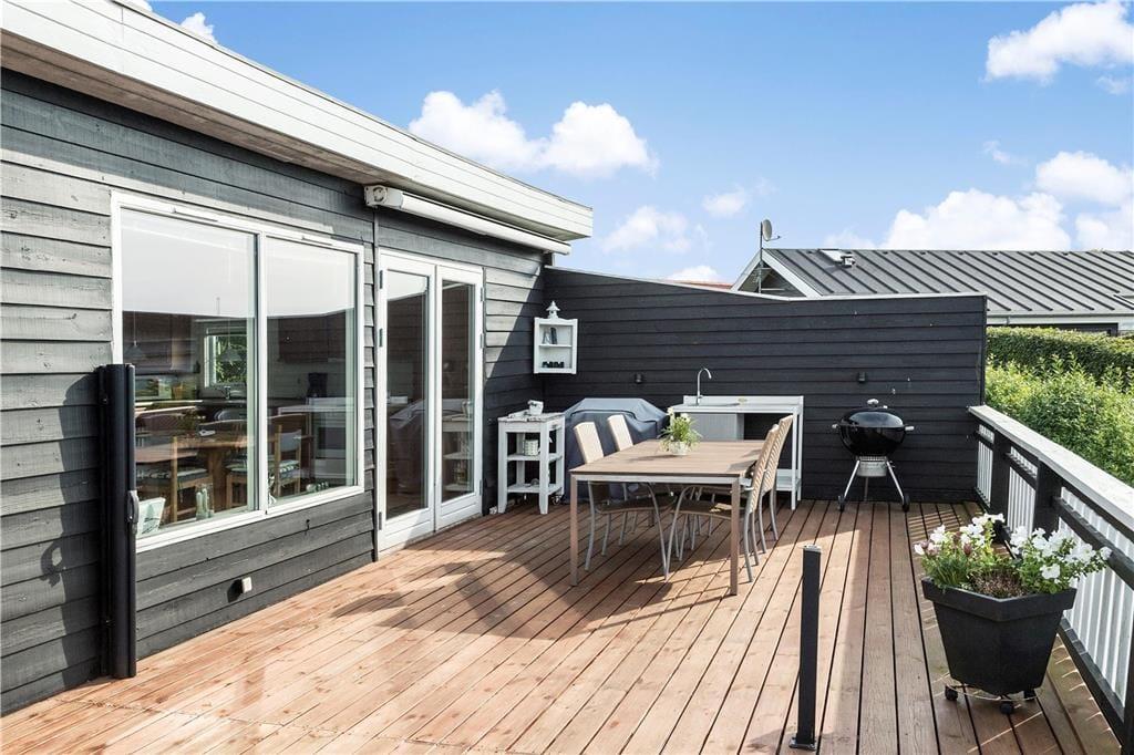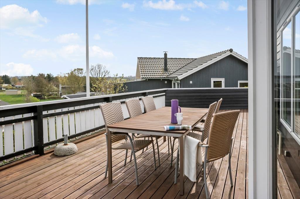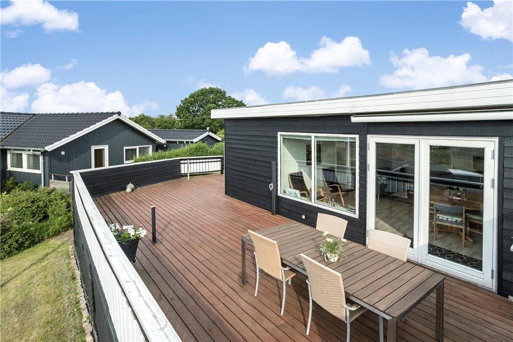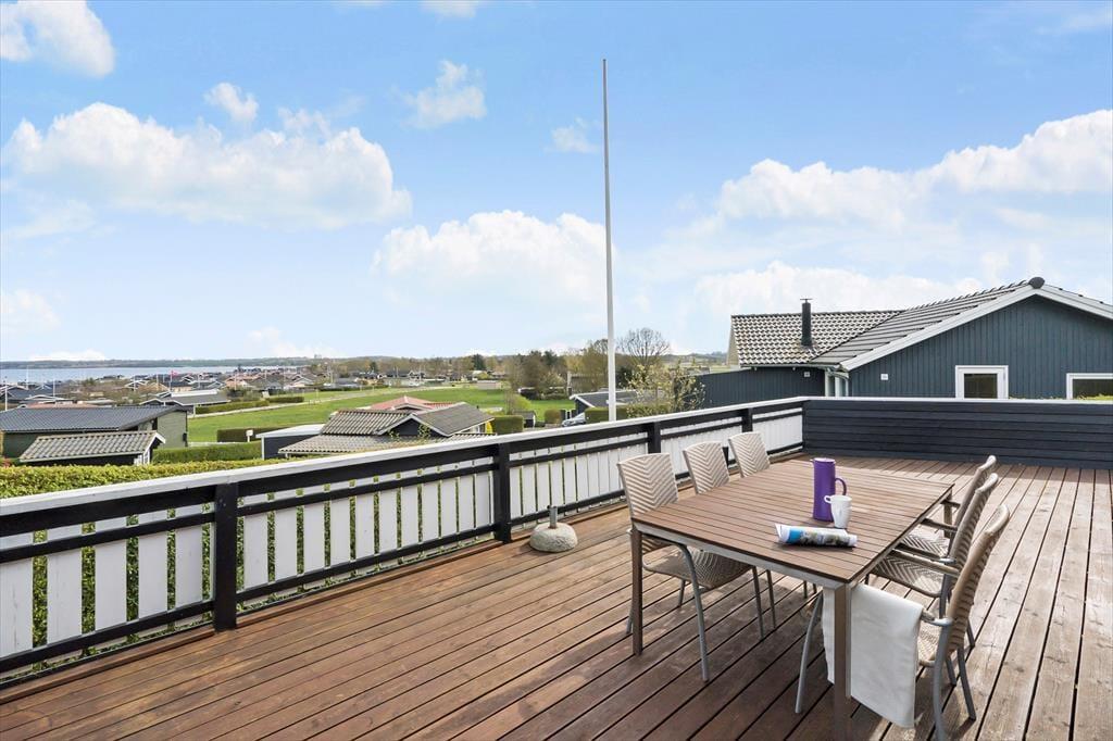 Huset er omkranset af den dejligste træterrasse. Herfra kan udsigten også nydes. Terrassen har både vindsejl og markise og bliver derfor hurtigt til et opholdssted det meste af dagen. På terrassen er også et udekøkken (dog kun med koldt vand).