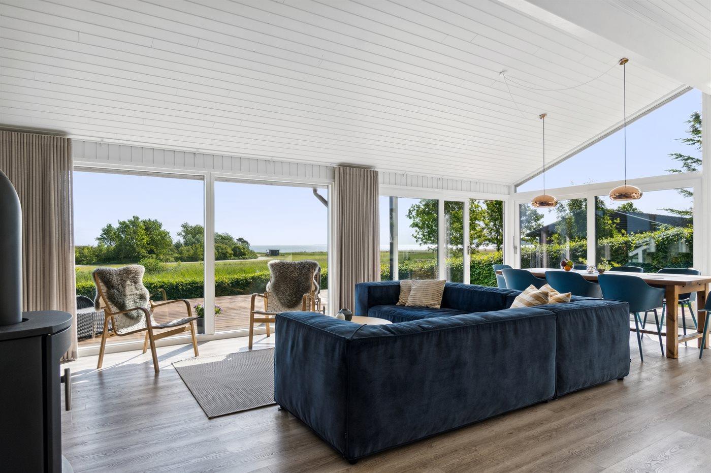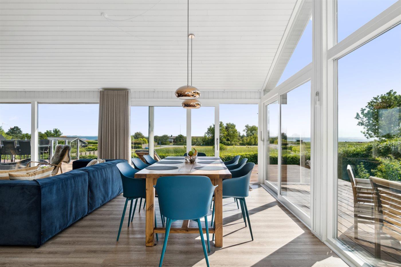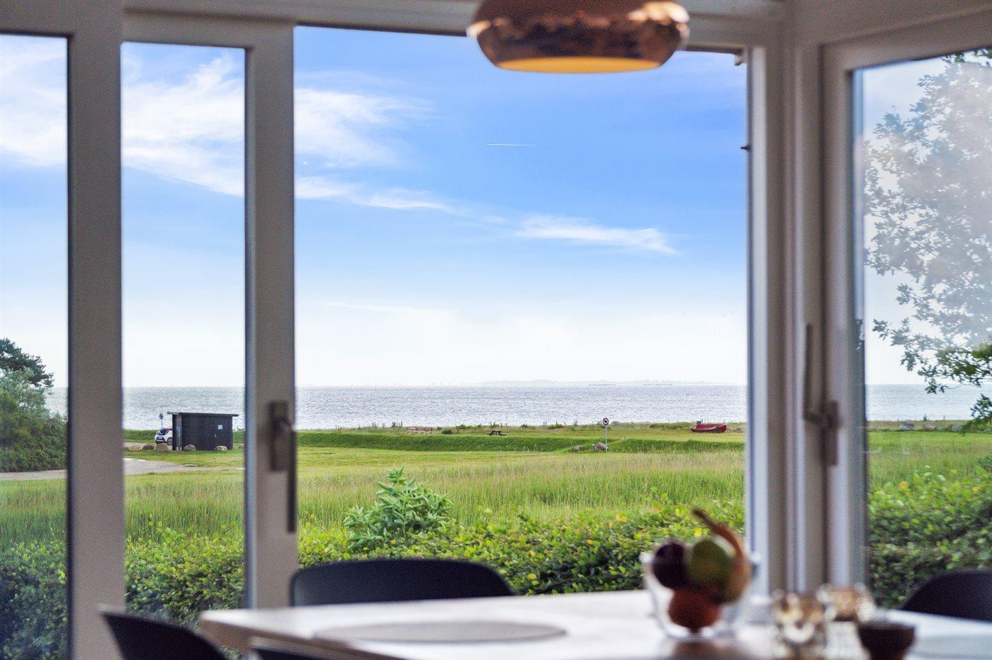 Husets beliggenhed er ganske enestående med flot panoramaudsigt over havet, som i særdeleshed kan nydes fra den store terrasse og fra husets store åbne køkken/alrum og stue Der findes store vinduespartier hele vejen rundt og det er en ganske særlig oplevelse at stå inde i huset og samtidig føle sig i ét med naturen.